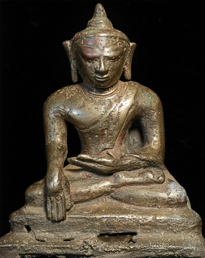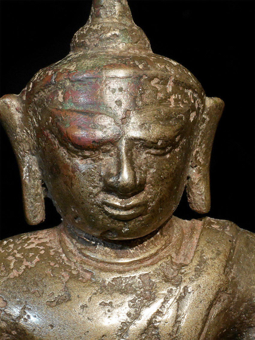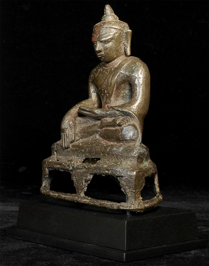 This is a rare late Pagan/Pinya bronze Burmese Buddha from the 13th or 14th centuries. The base is highly unusual and has originally had an additional figure or figures attached to it. There is expectable surface wear, some losses and extensive original casting flaws, and damage/loss to the base. The face is in deep meditation. I've seen one other like him, item # 5317. He sits 7 inches tall with the custom base, 6 inches for the statue alone.