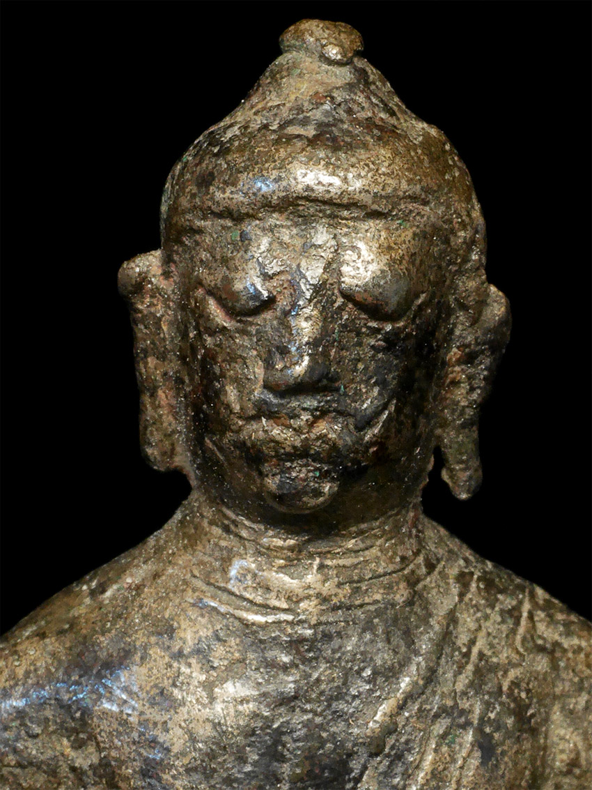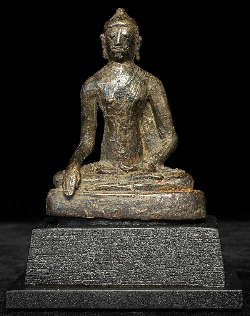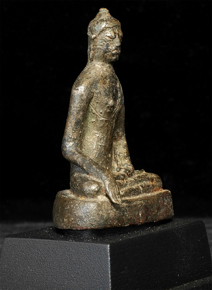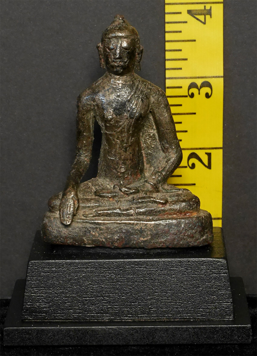 Highly uncommon Buddha- I believe that it is a prototype SE Asian Buddha, attempting to emulate a Sri Lankan style. I am estimating 11th to 14th century, but I do not know for sure the age or origin. Sits 3 inches tall, 4 with the base. No one I have shown it to in 20 years has seen a comparable one.