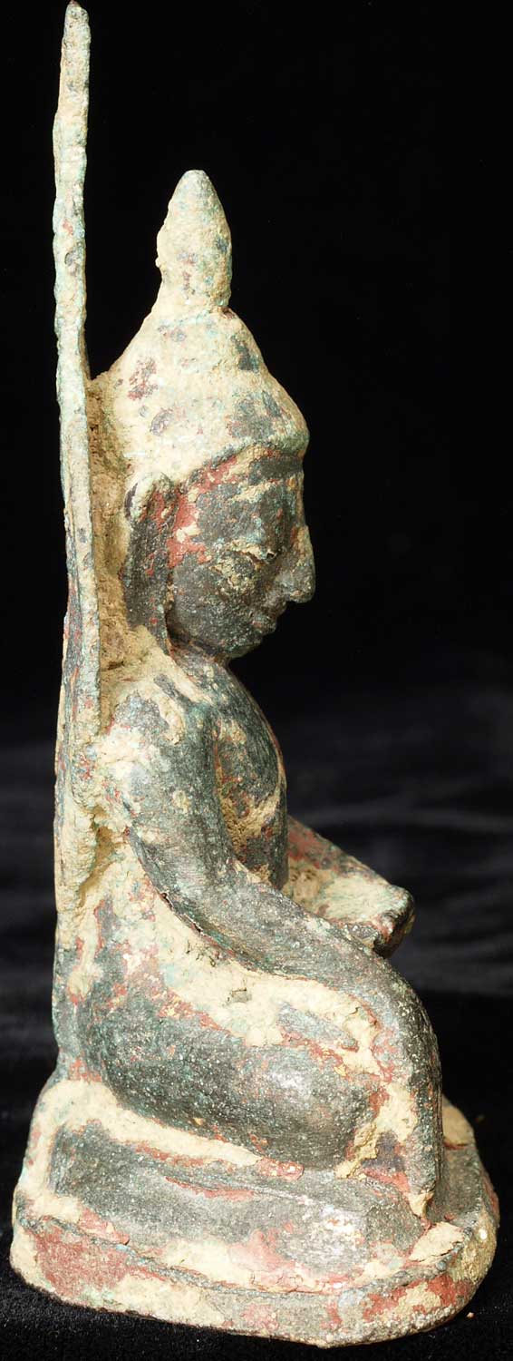 This is a delightful late Pagan Burmese Bronze Buddha with a lotus leaf behind him. I run in to this type from time to time, but rarely are they in good condition, as they have typically been buried. Even fewer have good faces- this is about the best I have ever seen on this type. The photos only partially capture the depth and beauty of this piece. The piece sits 4.5 inches tall.