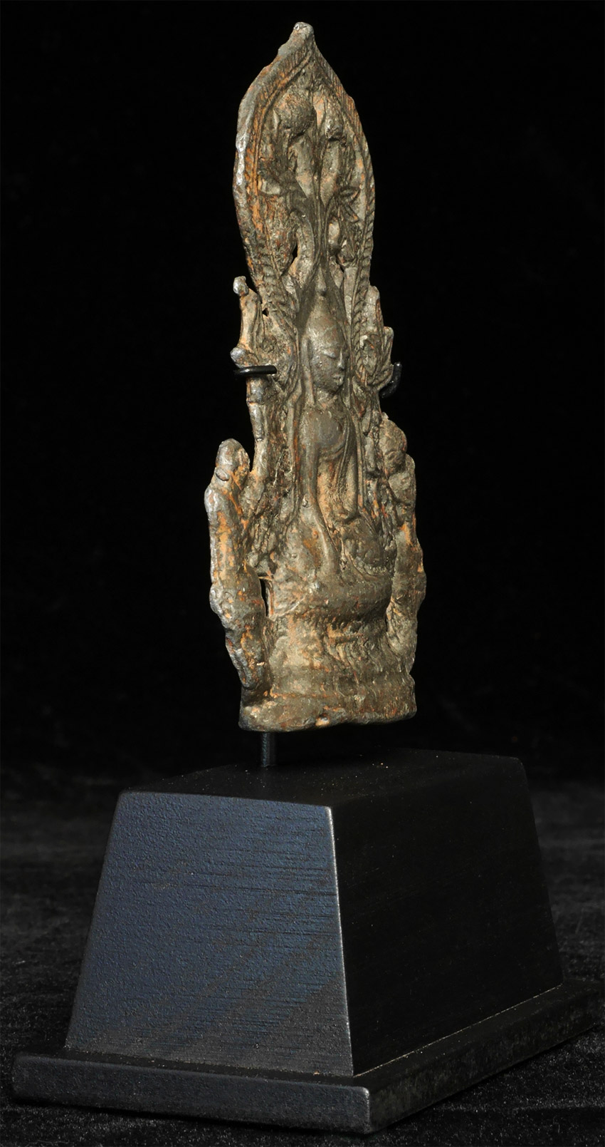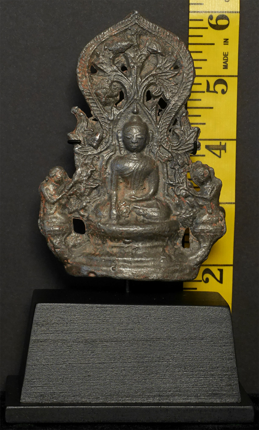 Very good 18/19thC Burmese lead alloy Buddha under stylized Bodhi tree. Exceptional face for this type. Measures 4 inches tall and 6 inches tall on its custom base.