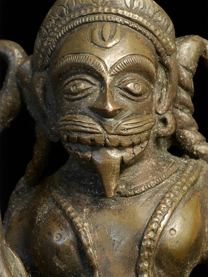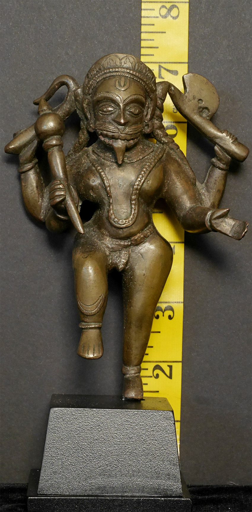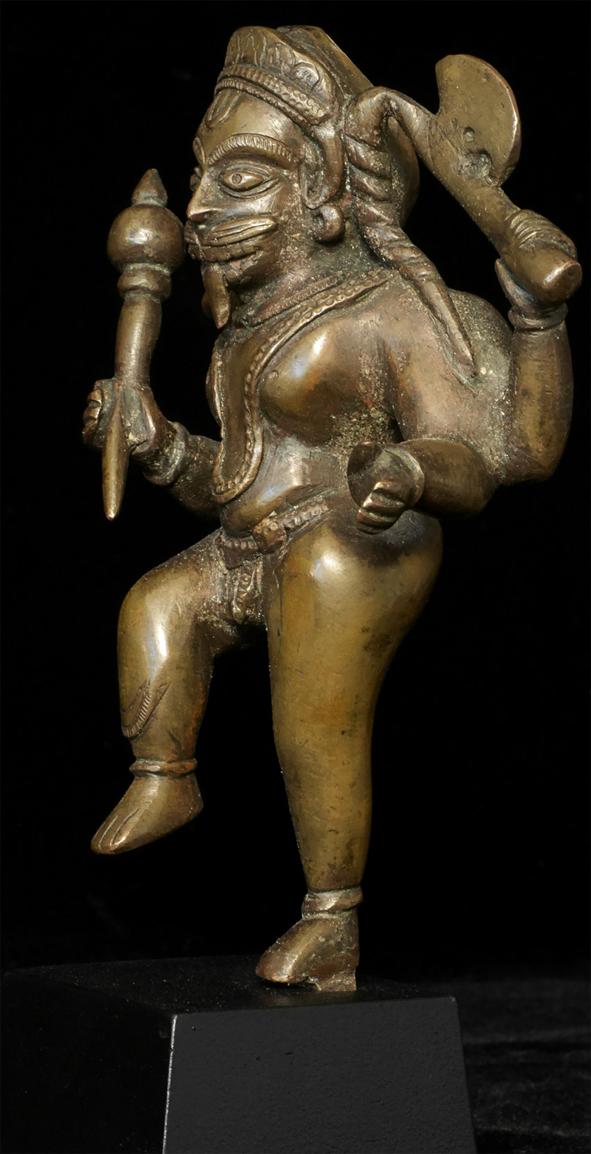 Lively Antique Lion Face (Narashima?) Hindu Deity.Stands proudly at 5.75 inches tall, height on custom stand is 7 1/8 inches.