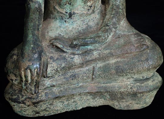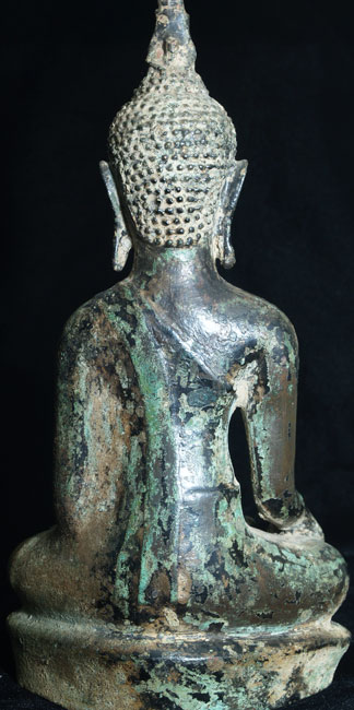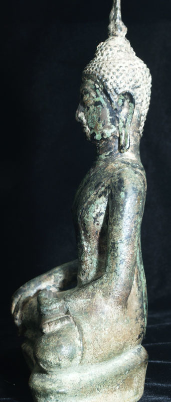 This is a true, classic 15th century Thai Utong Bronze Buddha. In recent years this has become one of the most desirable and hardest to find styles of Thai Buddhas. This one is a nice size at over 8.5 inches tall. There is a great depth to the face of this Buddha. There is also an incredibly complex patina with a very desirable and beautiful jade green surface combined with remains of the original black lacquer.