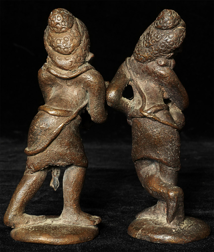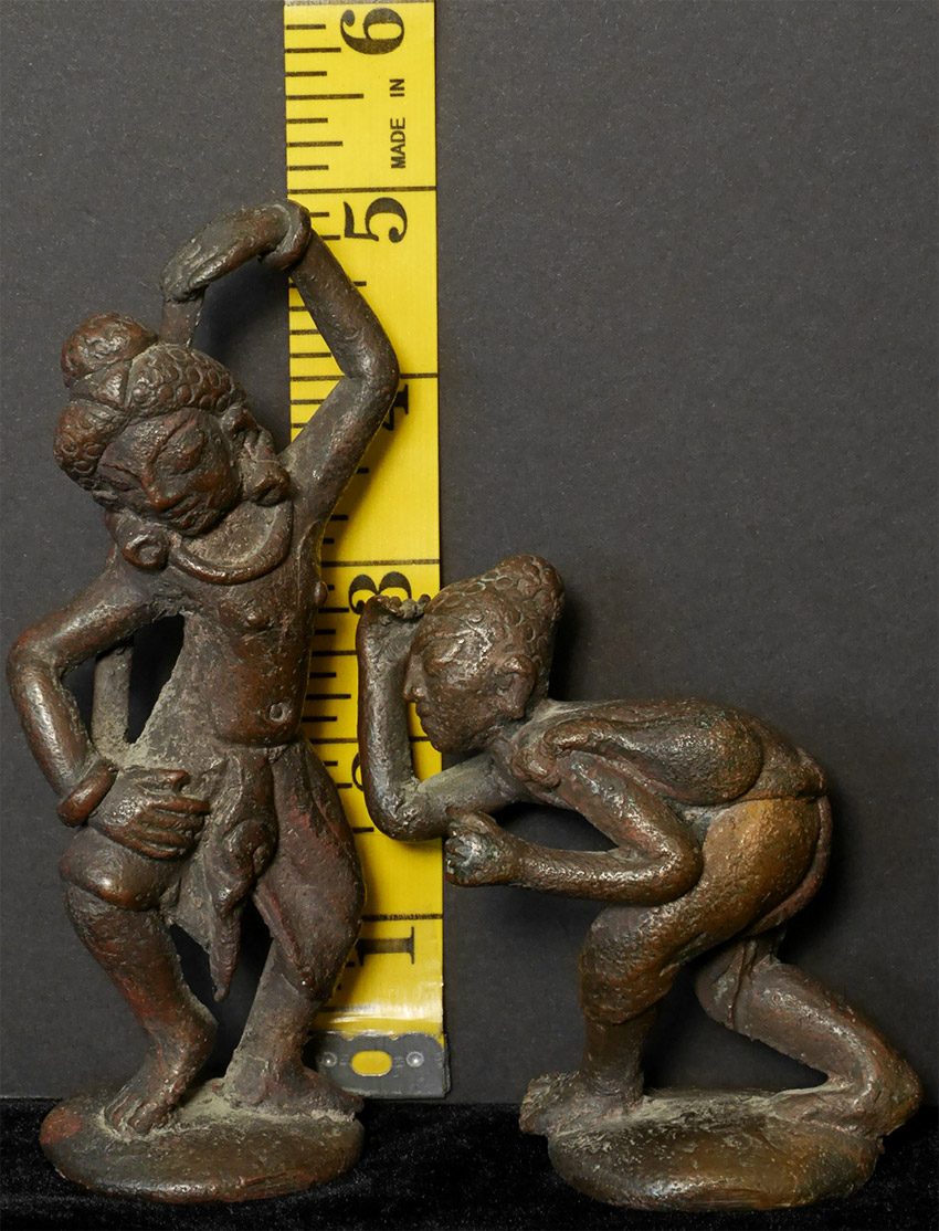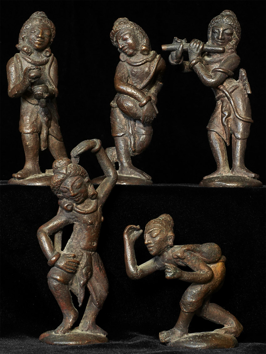 Five antique Indian or Burmese solid cast bronze musicians -- the tallest is 5 inches, the shortest is 3 inches tall. Look to have good age, but unsure how to date. Several people have suggested India as a source, though I have seen some closely related early Burmese examples that looked a lot like these. Very expressive. Price is for set of FIVE.
