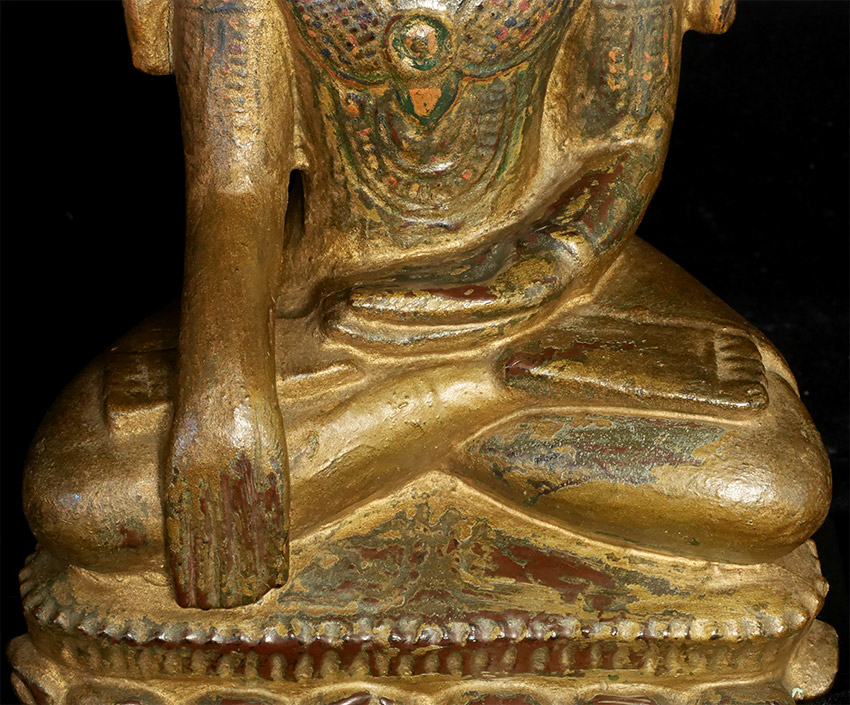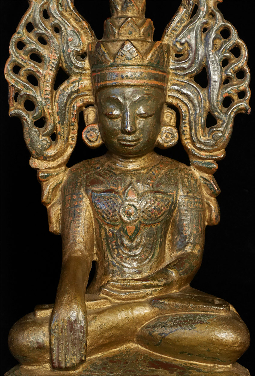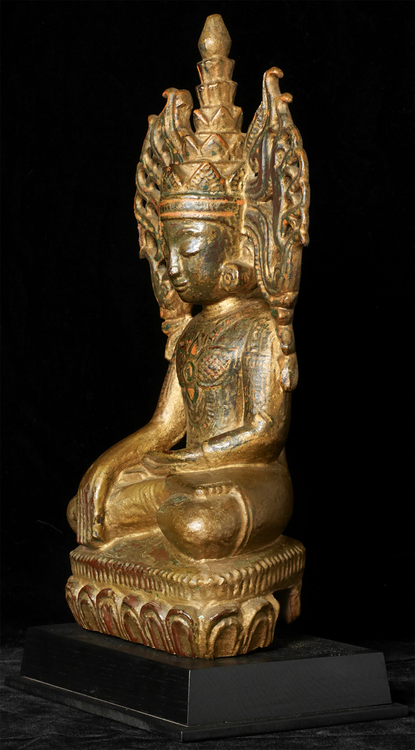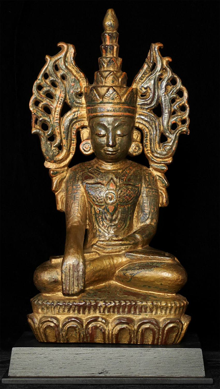 Sublime 18/19thC Burmese wood Buddha. Rare to find this quality and condition- especially in wood. Base has been reduced - common on this type due to the base rotting away from to the heat and humidity in Burma. Headdress appears to have repairs. One of the best wooden pieces of this type I have encountered in 20+ years. Sits 14.5" tall, height on custom base is 16.75 inches.