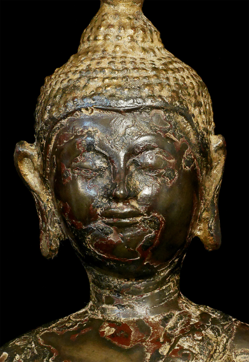 17/18thC or earlier Cambodian Buddha with strong Thai influence. Loops on bottom made to go into a separate base are usually found on much earlier examples. 7 7/8" tall, height on custom stand is 8.75 inches