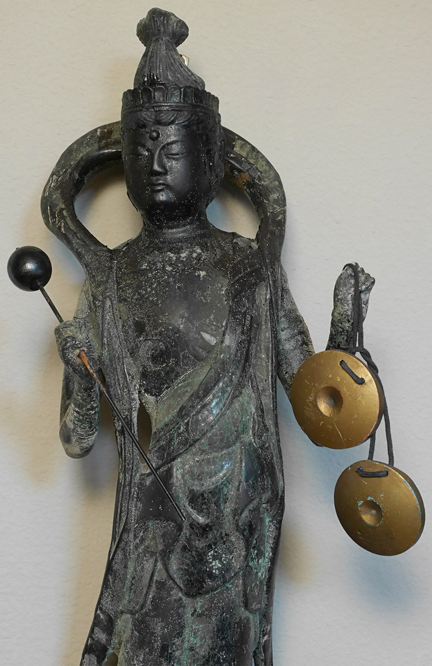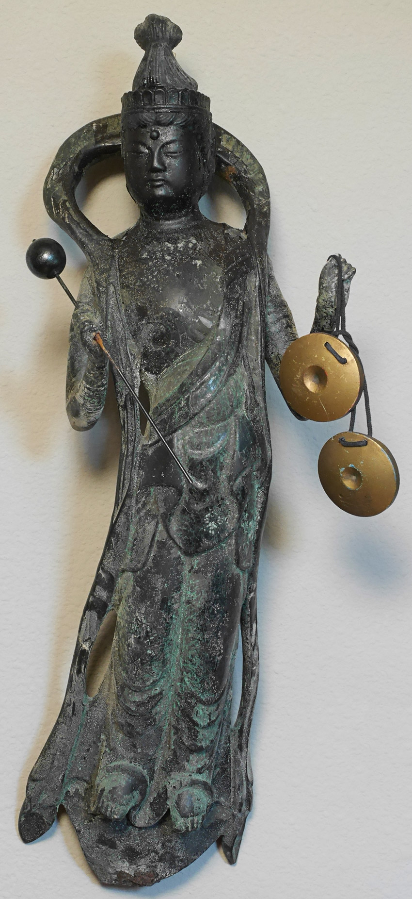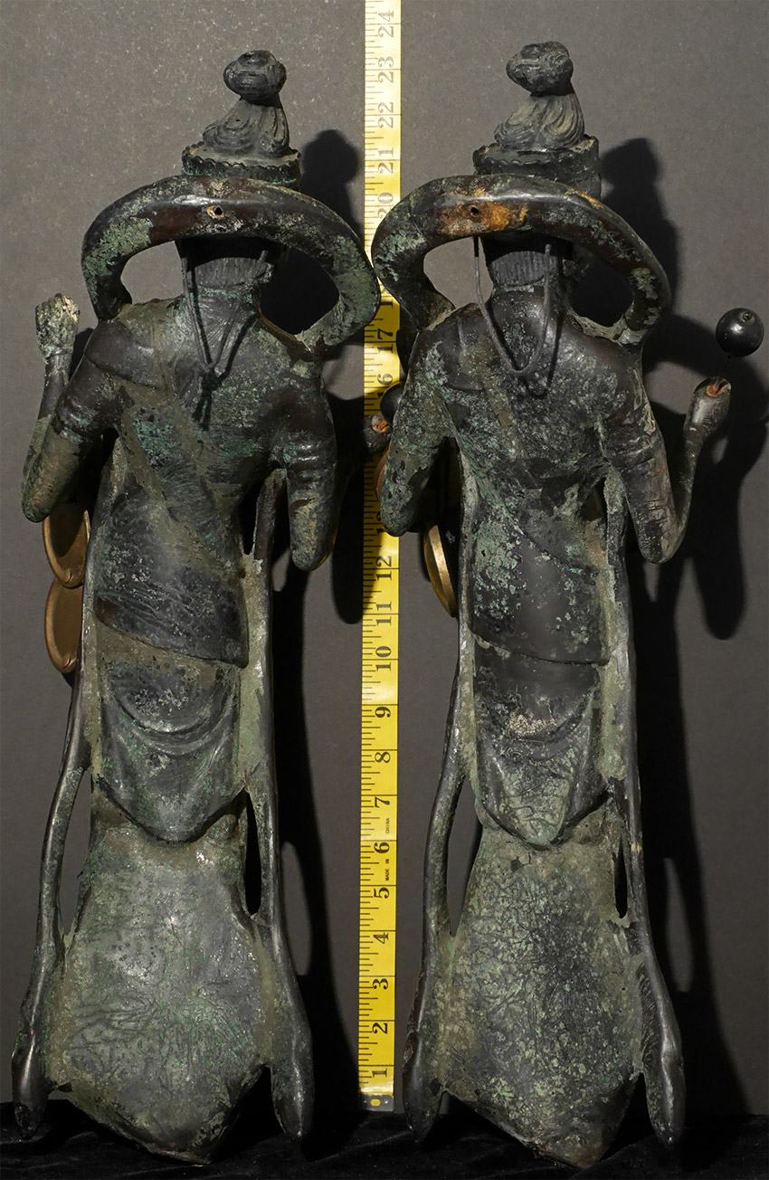 Rare pair of Japanese Buddhist Celestial Figures made out of lacquer. Probably originally flanked the sides of the head of a very large Buddha in a temple. Size is approximately 23.5 inches tall. Look to be quite early. Some loss, and remains or original patina as seen in photos. Note item 5757, which is a larger and possibly even earlier example of the same type of temple figure.