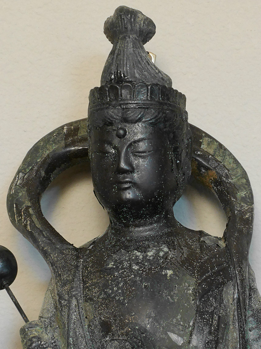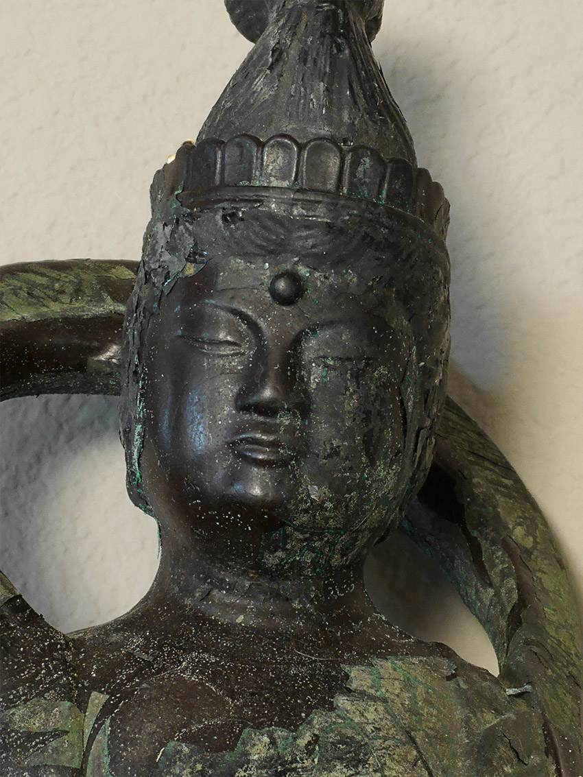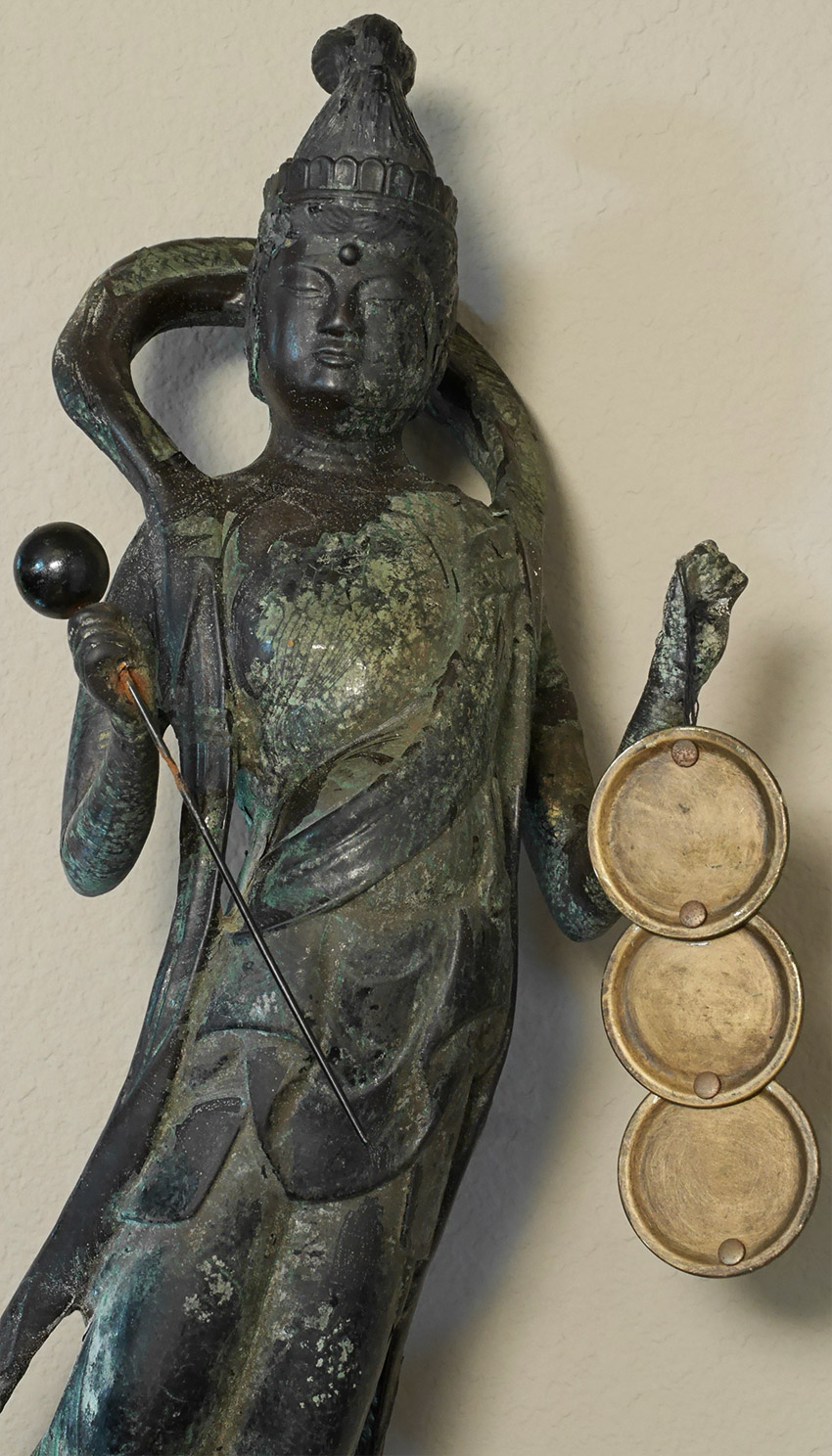Rare pair of Japanese Buddhist Celestial Figures made out of lacquer. Probably originally flanked the sides of the head of a very large Buddha in a temple. Size is approximately 23.5 inches tall. Look to be quite early. Some loss, and remains or original patina as seen in photos. Note item 5757, which is a larger and possibly even earlier example of the same type of temple figure.