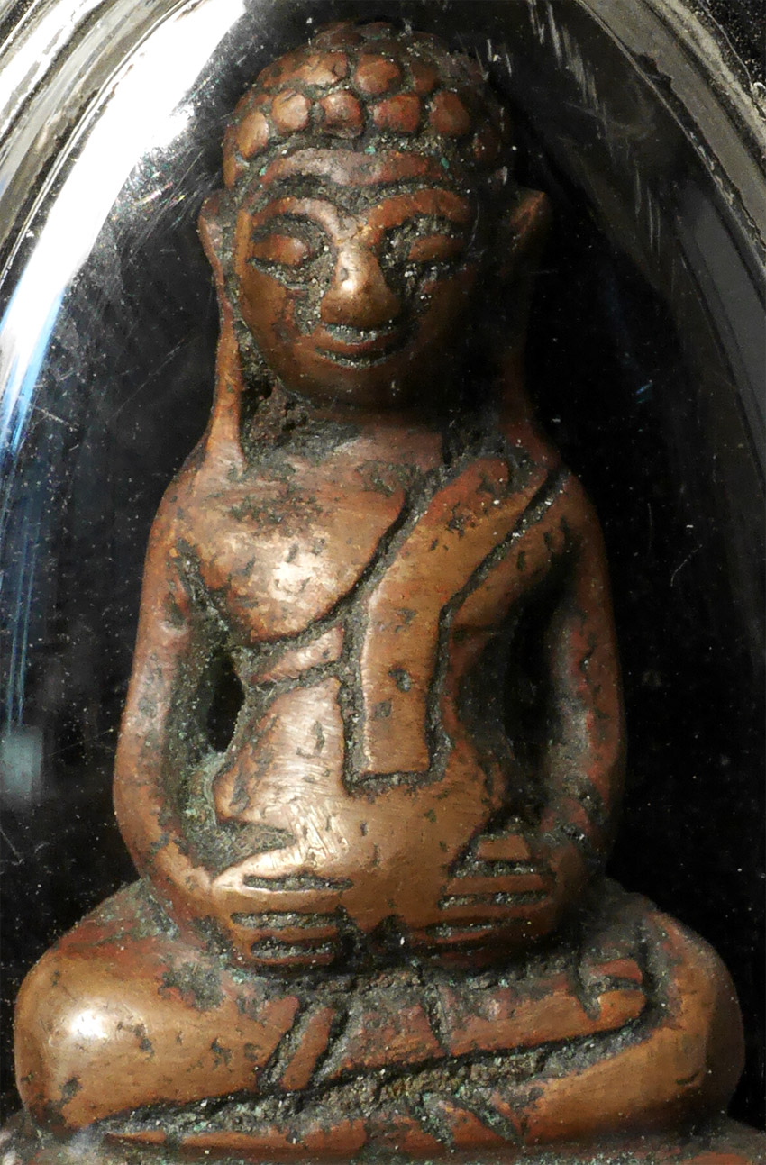 Lao "happy" Buddha in a protective case. Probably old. Size is 1.5 inches tall, height of case is 1 7/8 inches.