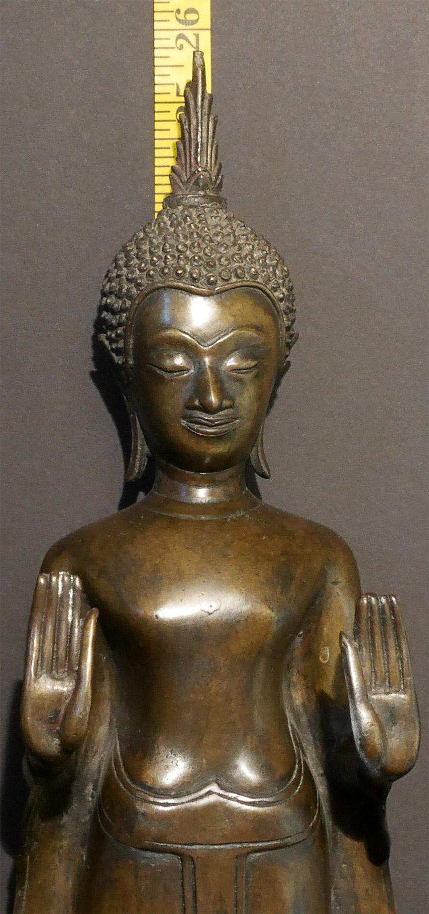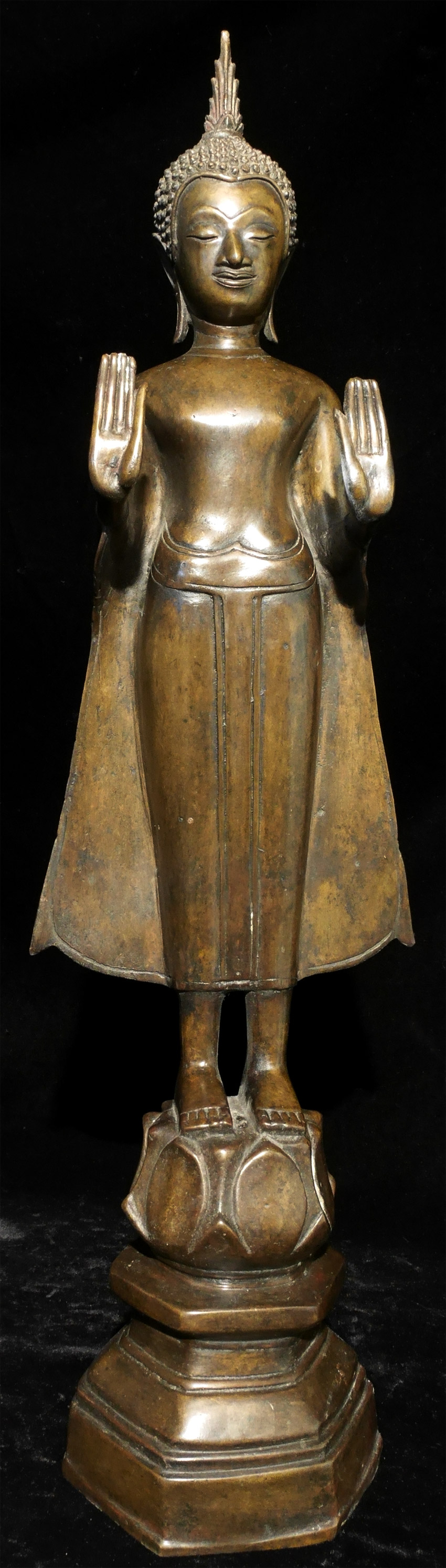 Beautiful, large Laos Bronze Buddha from a wealthy east coast estate. Has a matching one(#7476) that had a slightly different face and a completely different mudra (hand gesture). Stands 25.75 inches tall. Would be sold by most as 17/18thC. I believe this is probably 20th C.