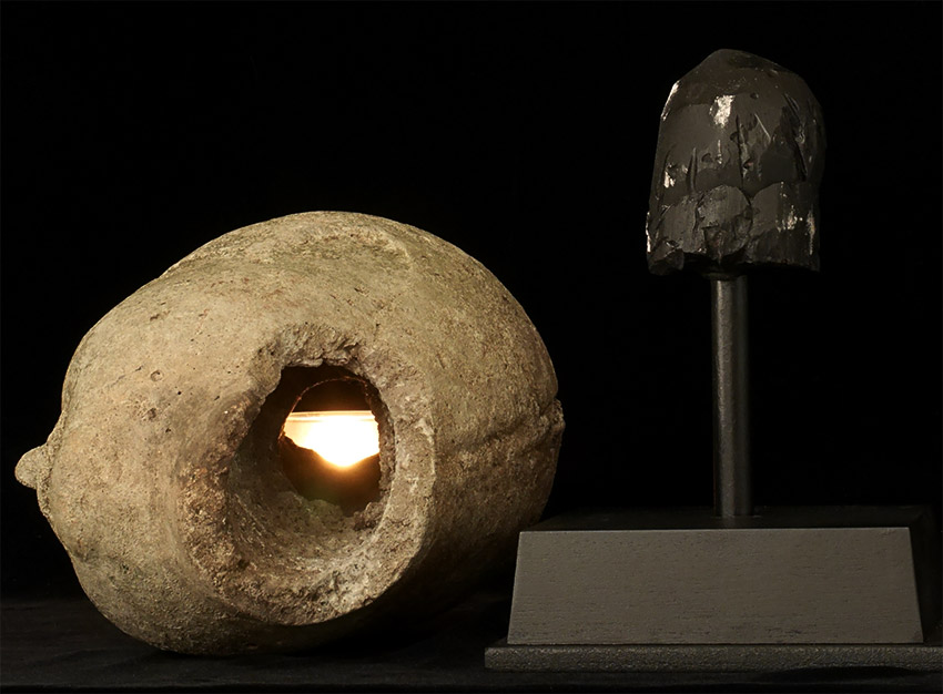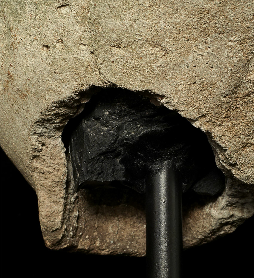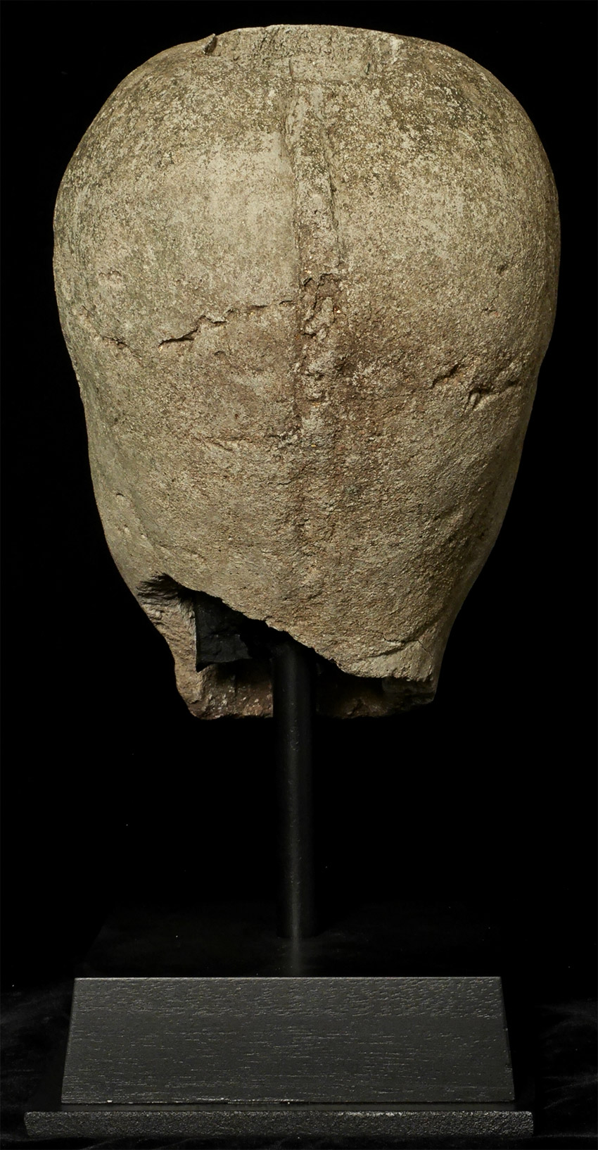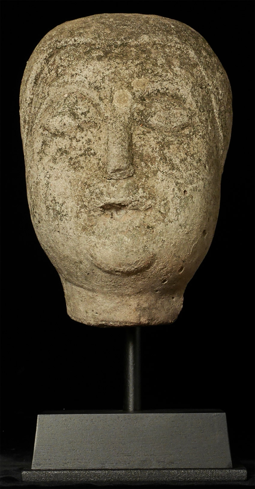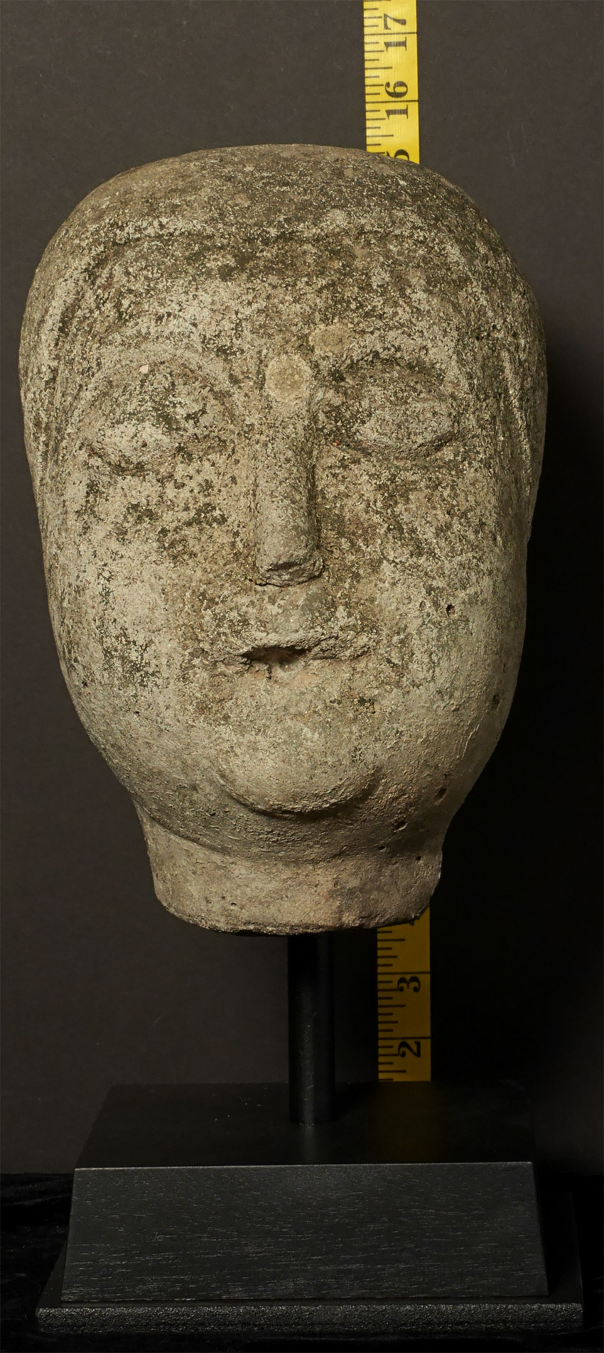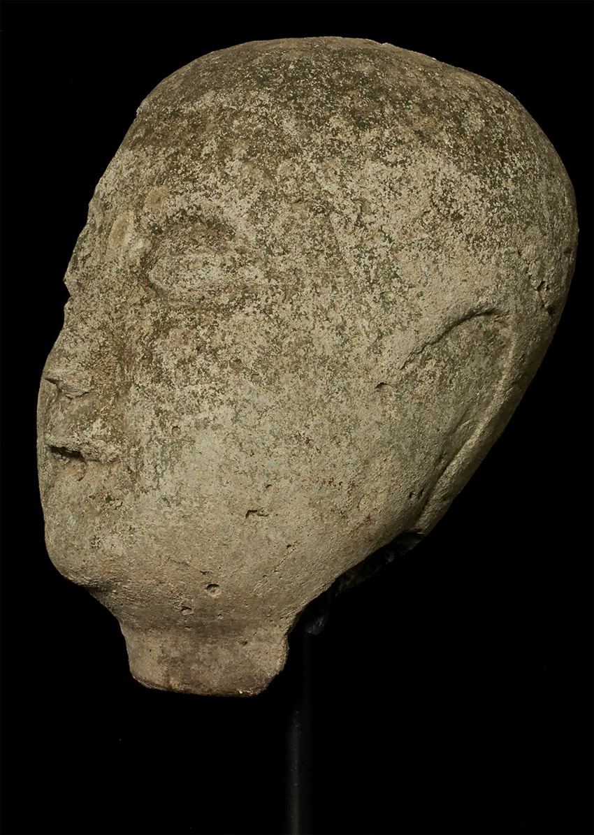 Burmese life-size Early Pagan era (10-11th) head probably made of sandstone or a an ancient casting material hard as stone. Approximately 10.5 inches tall, height on custom stand is 15.5. It looks like the finial and ears were created and attached after carving. Lots of personality. Very rare to find this type intact in this size.