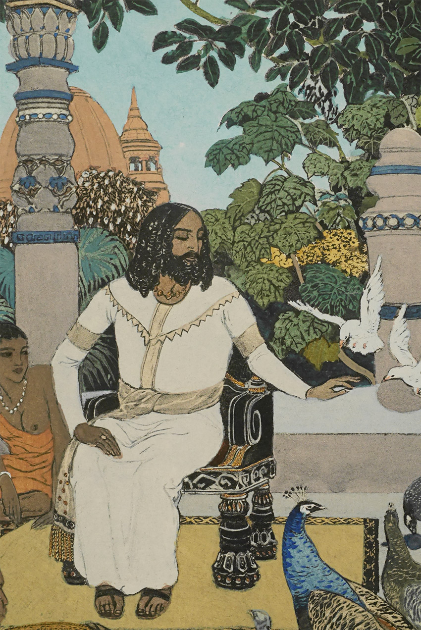 Hand painted lithograph(?) by Leon Carre. Have 16 others from the original 1910 to 1920 series for which these were originally done (for a very limited book of a few hundred editions. Carre was most famous for his paintings for Tarot Cards. Opening inside of silk mat is 7 x 9.5 inches, outside of frame measures 14.5 x 17 inches. This one was recently framed with museum glass. The others (which I would sell for less as a group, and less individually in old frame. I also have access to a near mint copy of the original book (book sells for $500 to $1000 in perfect condition)