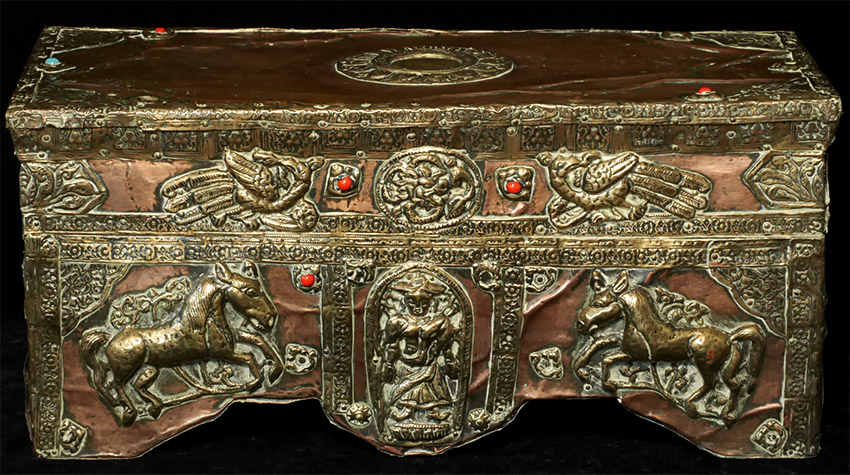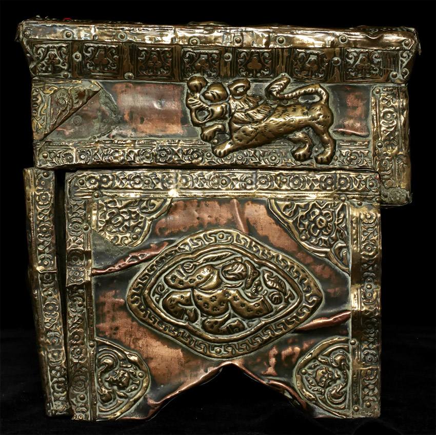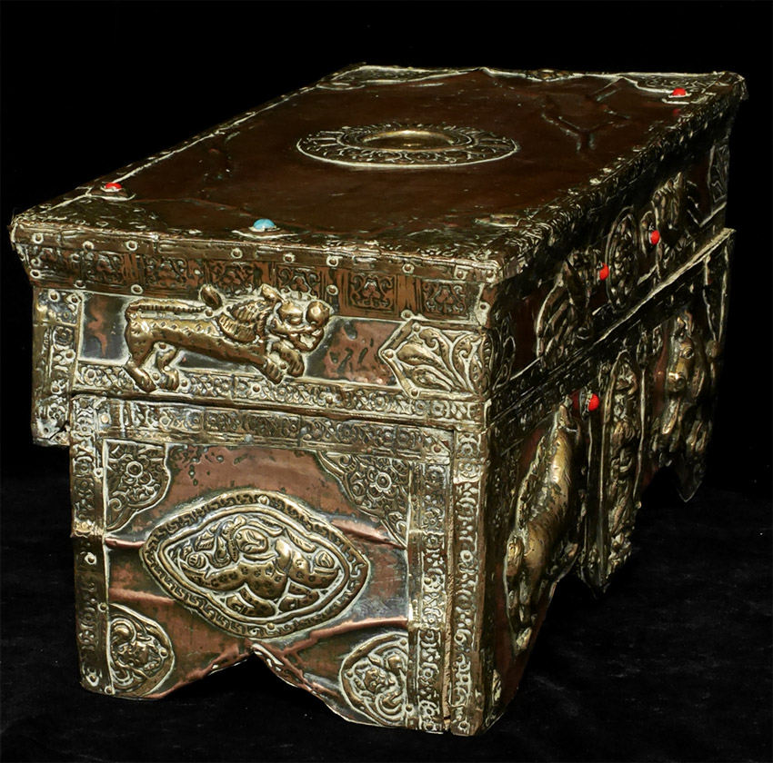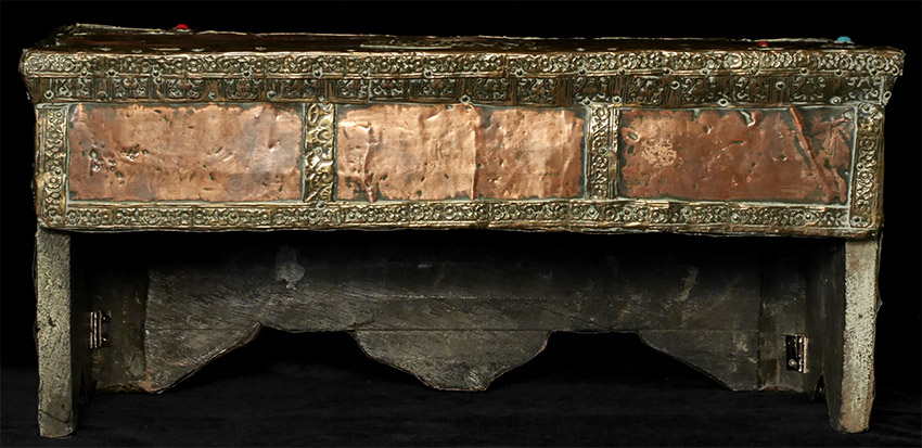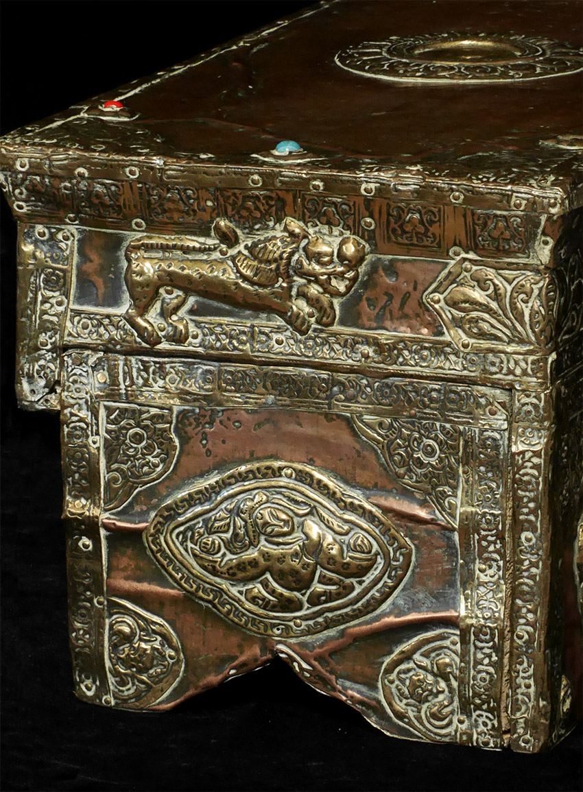 Nepalese antique altar table. Made is a repousse like technique of hammering copper and brass sheeting over wood. Beautiful and elaborate folk art/religion, with auspicious symbols, animals, figures, a few stones (many missing). Size is 7 3/8 x 16.25 x 6.5 inches. Out of a Scottish collection put together in the 1950's and 60's. Looks to be at least 100 years old, and given it has spent the past 50 years protected in the collected, probably older.