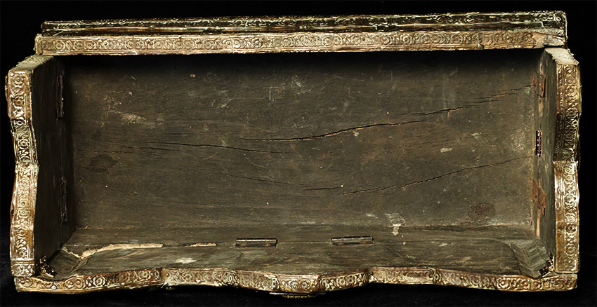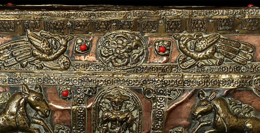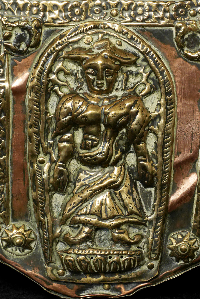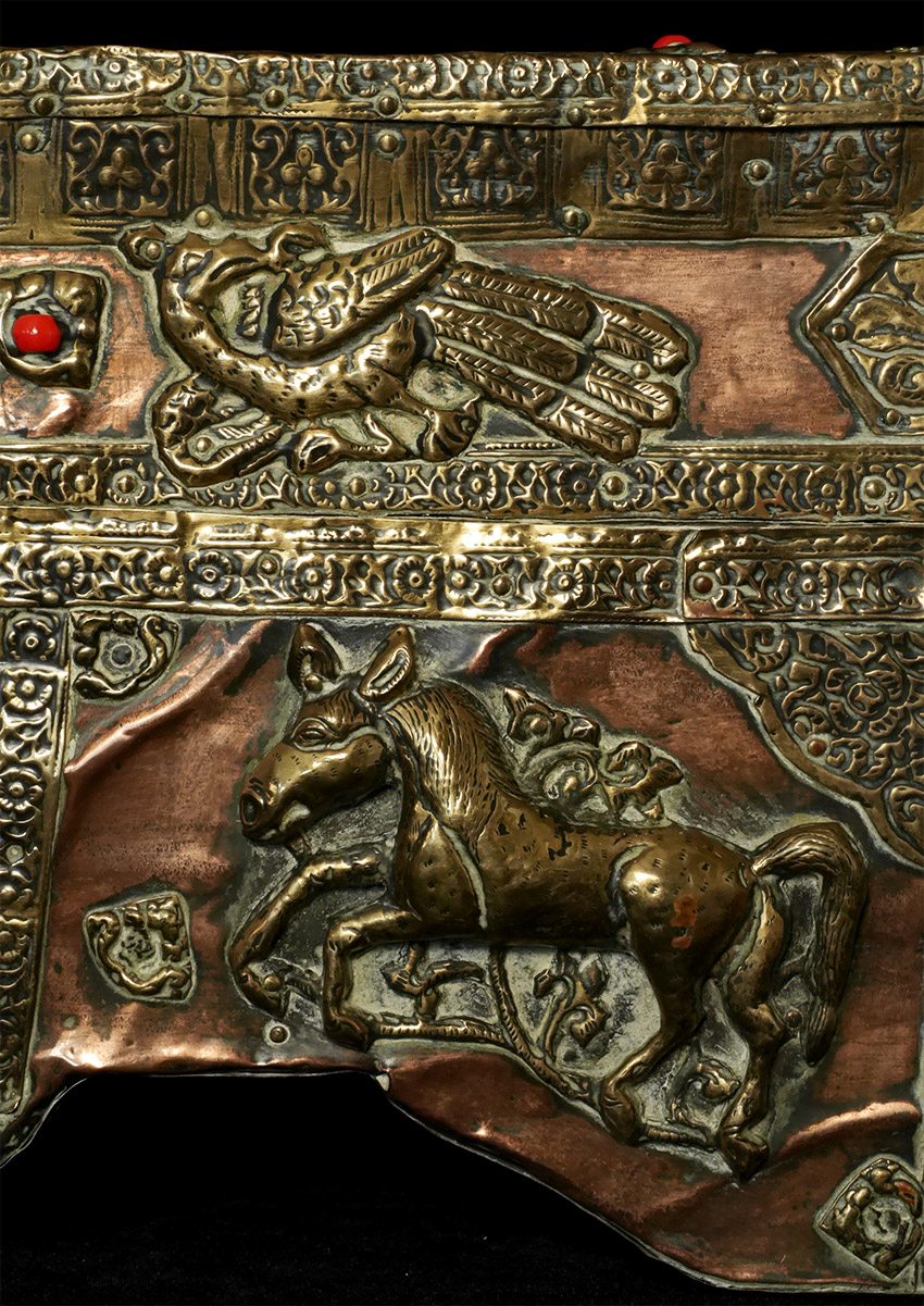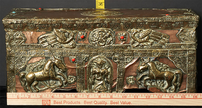Nepalese antique altar table. Made is a repousse like technique of hammering copper and brass sheeting over wood. Beautiful and elaborate folk art/religion, with auspicious symbols, animals, figures, a few stones (many missing). Size is 7 3/8 x 16.25 x 6.5 inches. Out of a Scottish collection put together in the 1950's and 60's. Looks to be at least 100 years old, and given it has spent the past 50 years protected in the collected, probably older.
