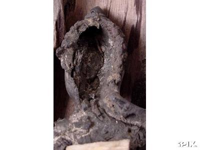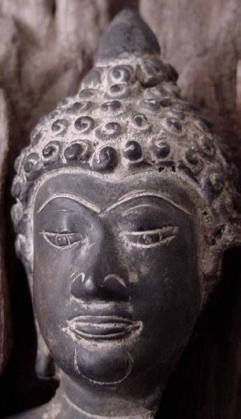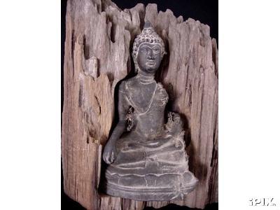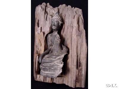 This is a very wonderful Buddha relic. It is a Chiang Sen Buddha from the 14/15th century that has been through a fire. It was probably buried for centuries. It has obvious losses: it was custom built a very creative stand made of old teak wood, from which it can be removed. The back of the Buddha has a piece of wood attached to it : the Buddha is placed in a cutout in the teak, and a post goes through the wood that holds the Buddha in place. It is the classic “Lion type” Chiang Sien Buddha with the bud shaped finial and short sash, which is also known as Chiang Sien 1. While there are many copies, this is an original 14/15th century piece. The Buddha sits 8 inches high: in the stand it is 10 and a half inches high. This is far more beautiful and valuable than many complete Buddhas