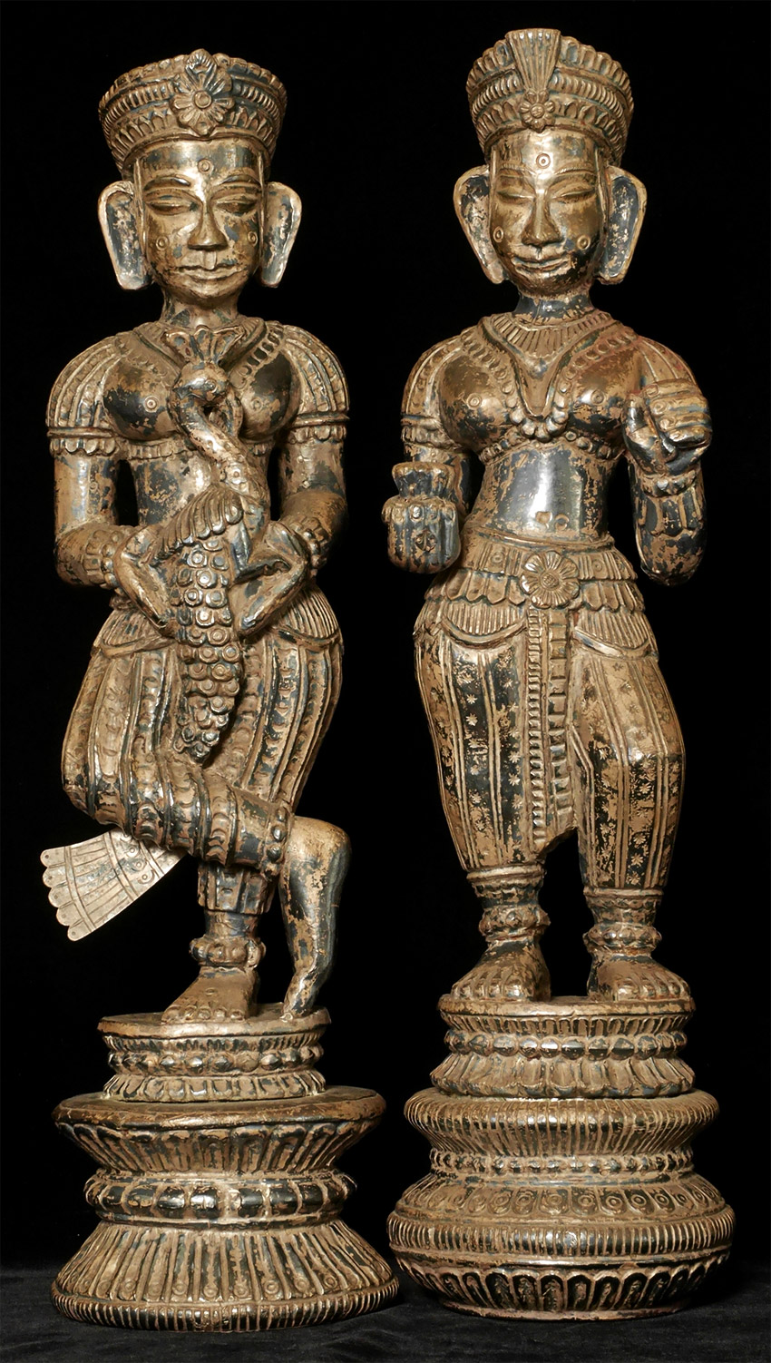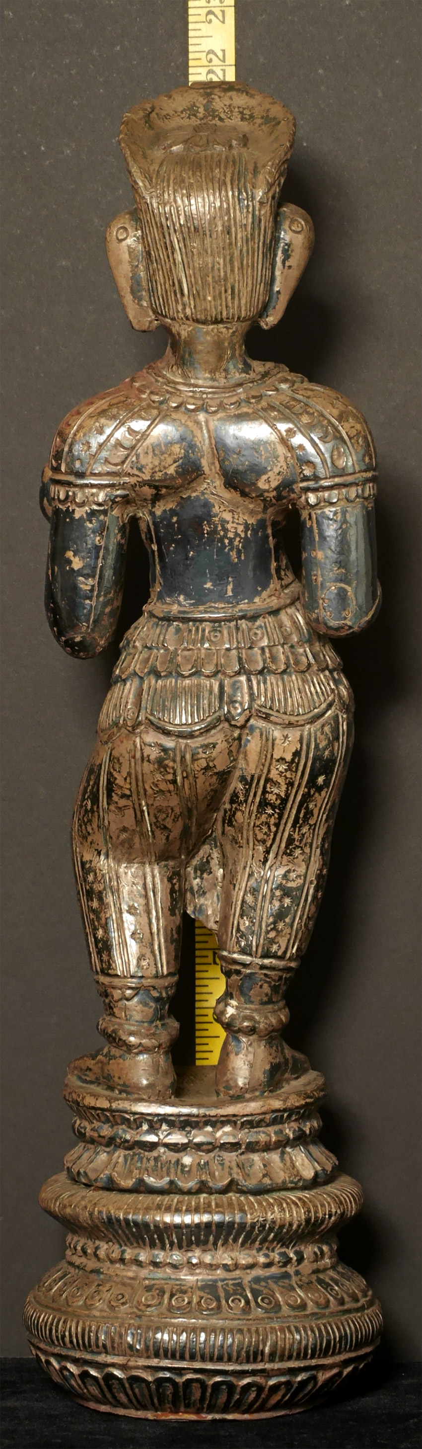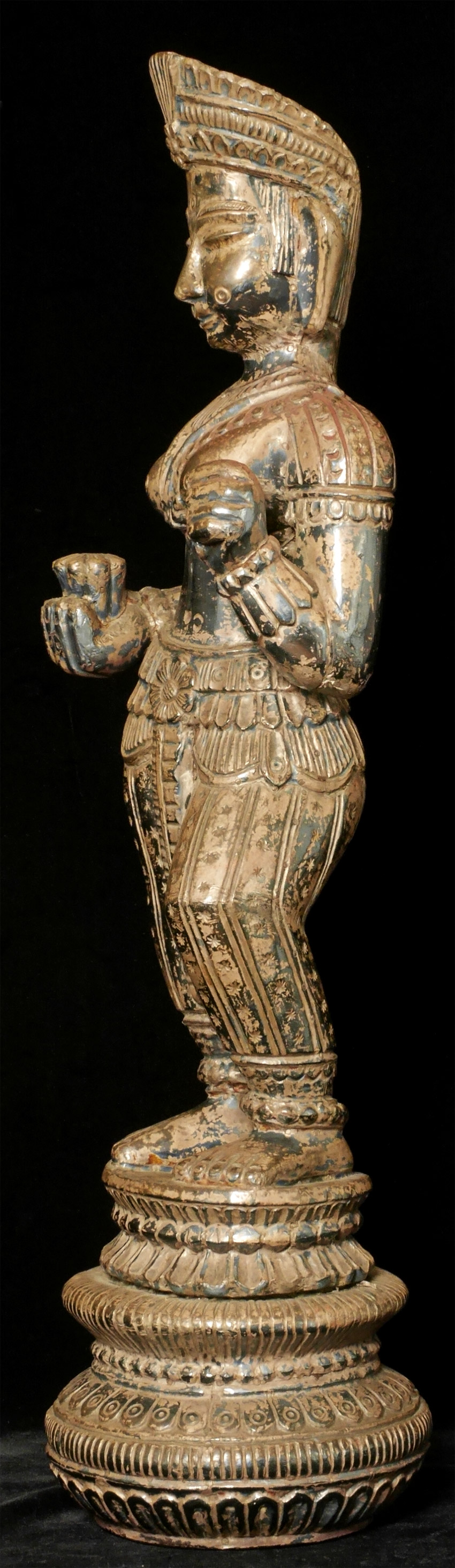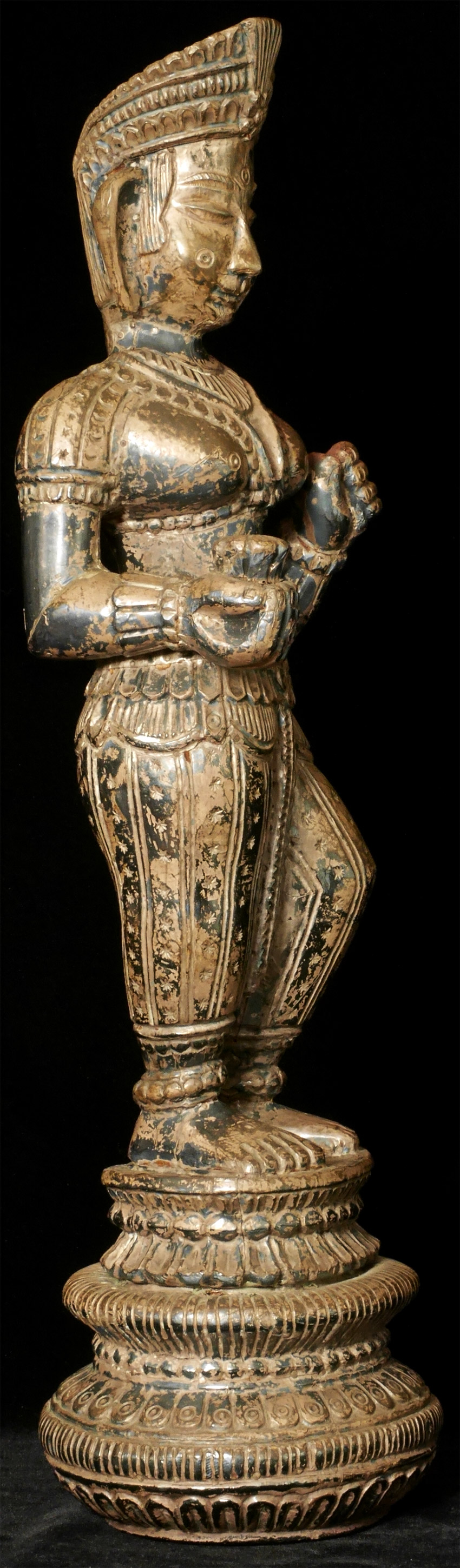 This piece and item #7504 came together from the estate of a successful New York jeweler. This one is a female ritual implements in each hand. Both look to be thick silver sheeting hammered over wood. Very finely executed. Quite old, unsure how to date. 21.75 inches tall.