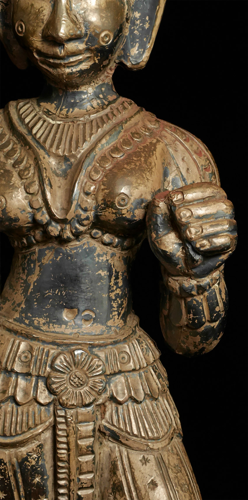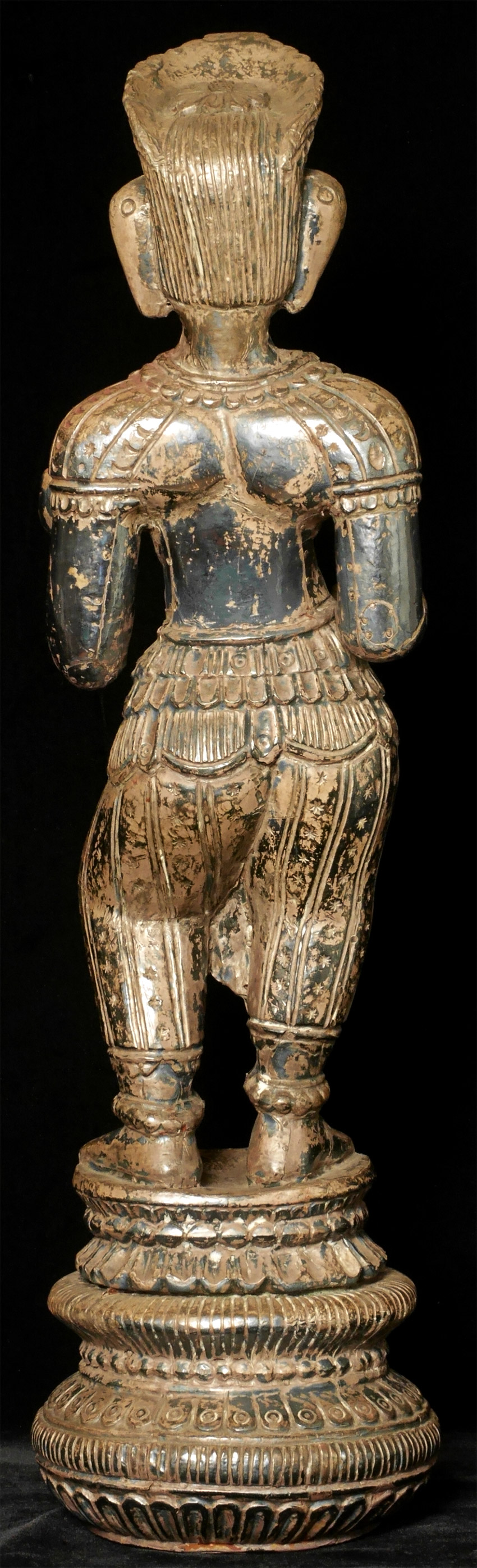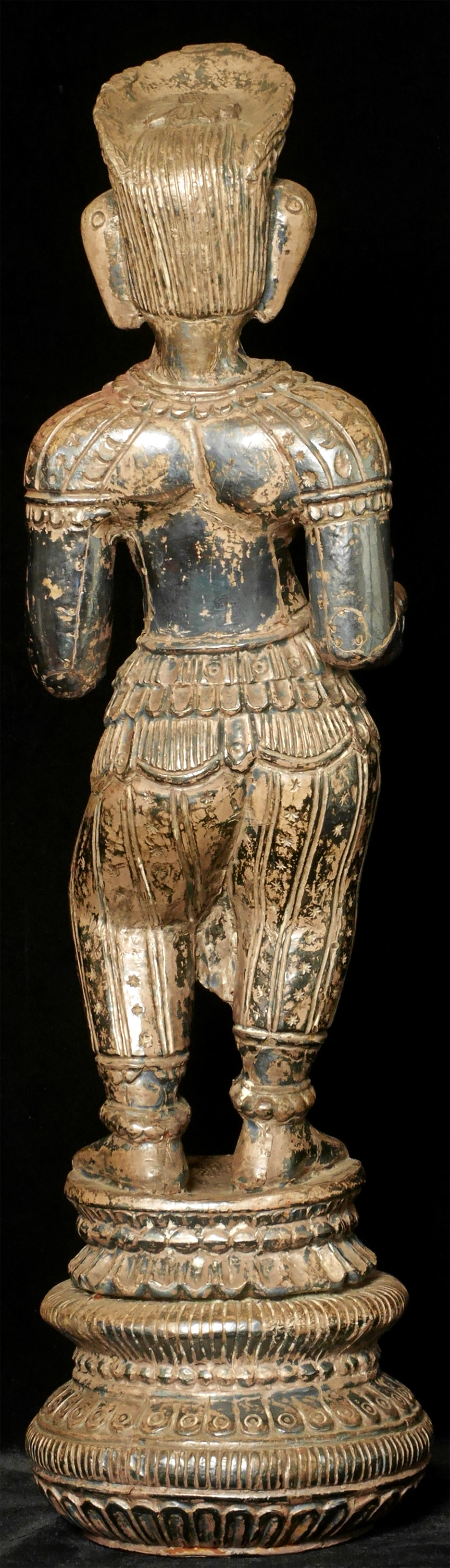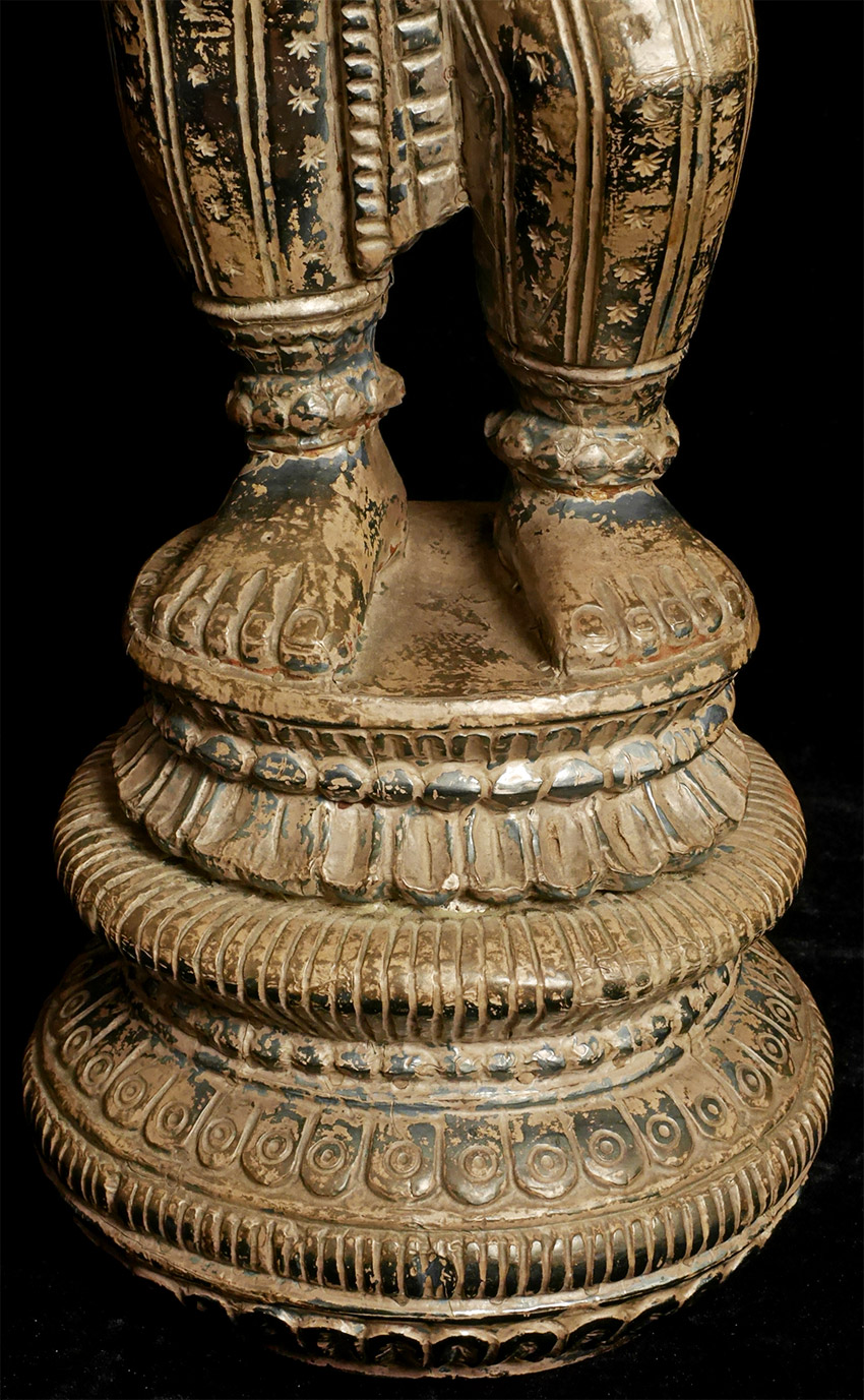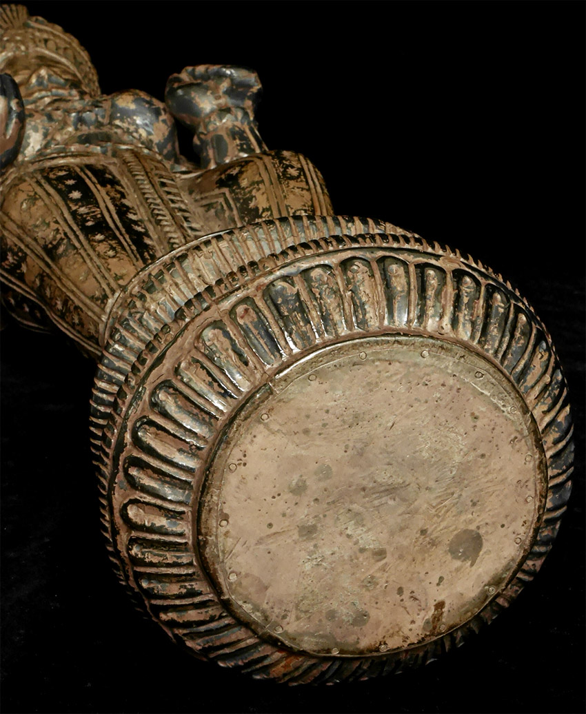 This piece and item #7504 came together from the estate of a successful New York jeweler. This one is a female ritual implements in each hand. Both look to be thick silver sheeting hammered over wood. Very finely executed. Quite old, unsure how to date. 21.75 inches tall.