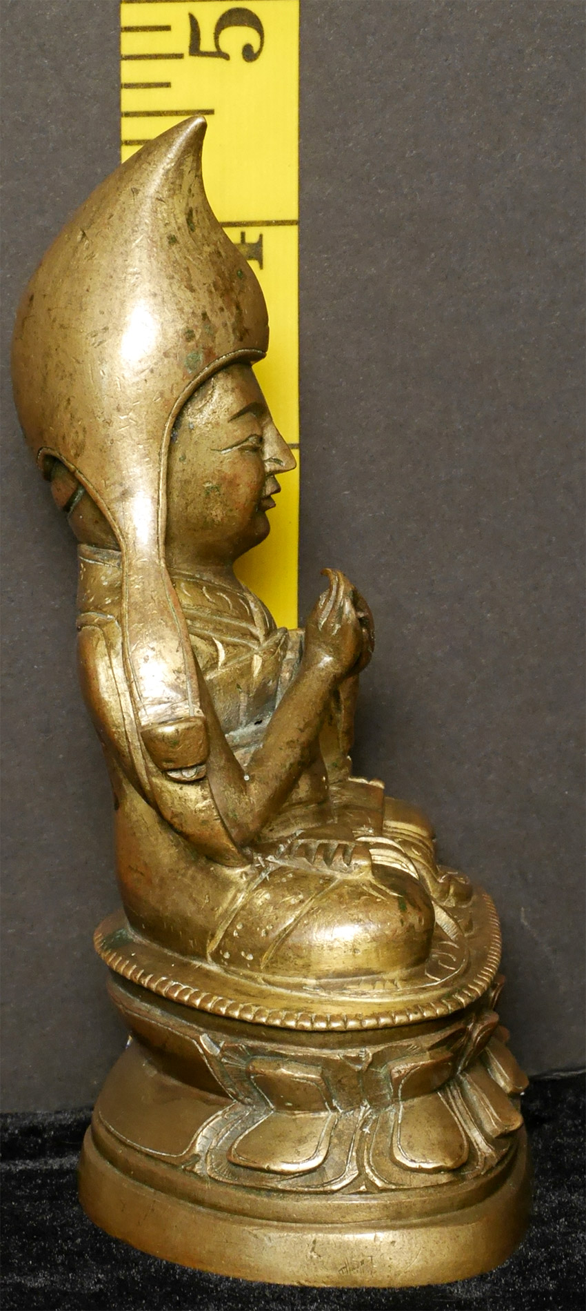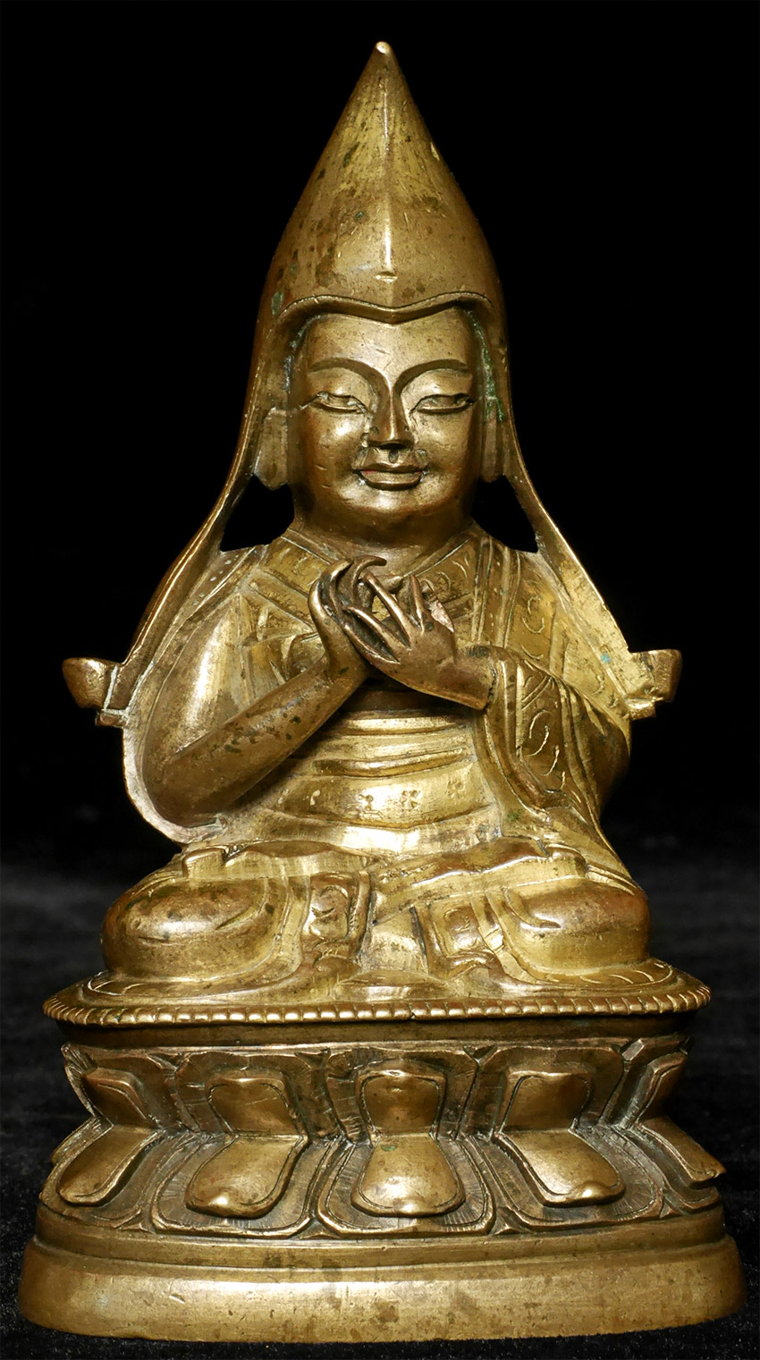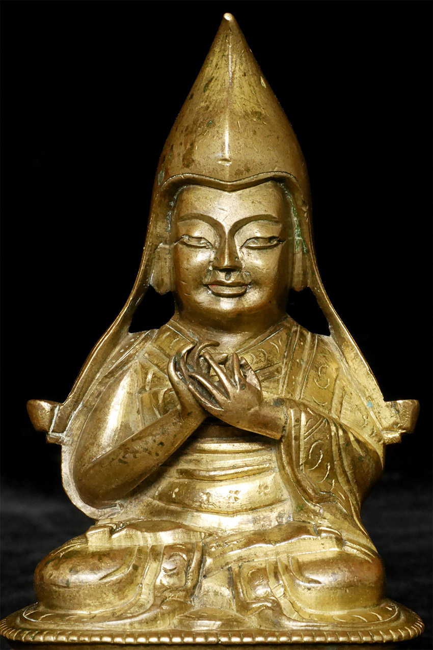 Delightful 18/19thC Mongolian Gilt-bronze Tsong-ka-pa. Sits happily at 4.5 inches tall. Excellent condition with much of its gilding remaining-missing separately made vines that went into holes near its outer elbows. The large head with the deeply serene countenance suggest that if this is 19thC that it is early to middle, as the later ones tended to thin out. Traces of inlaid or painted eyes.