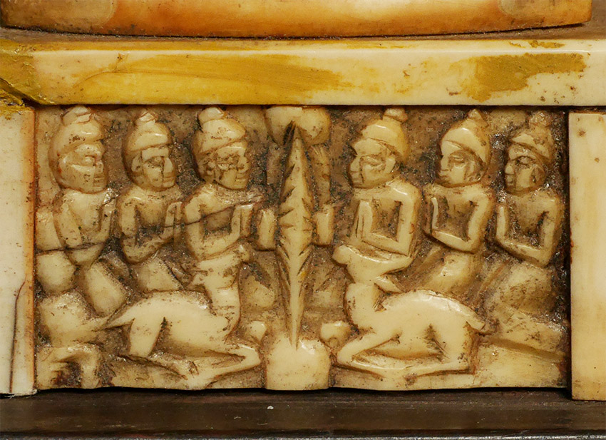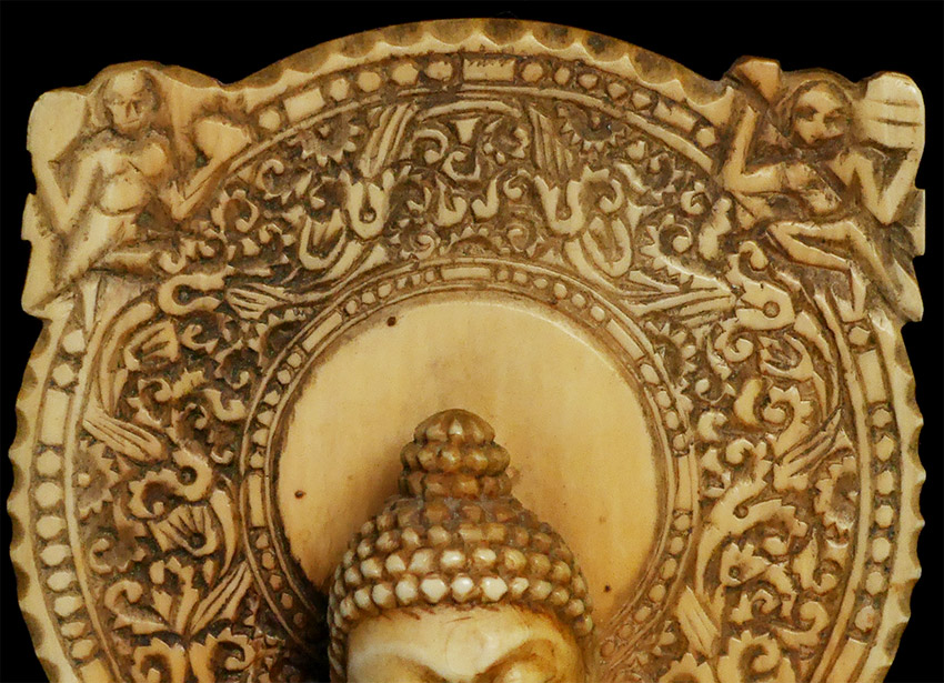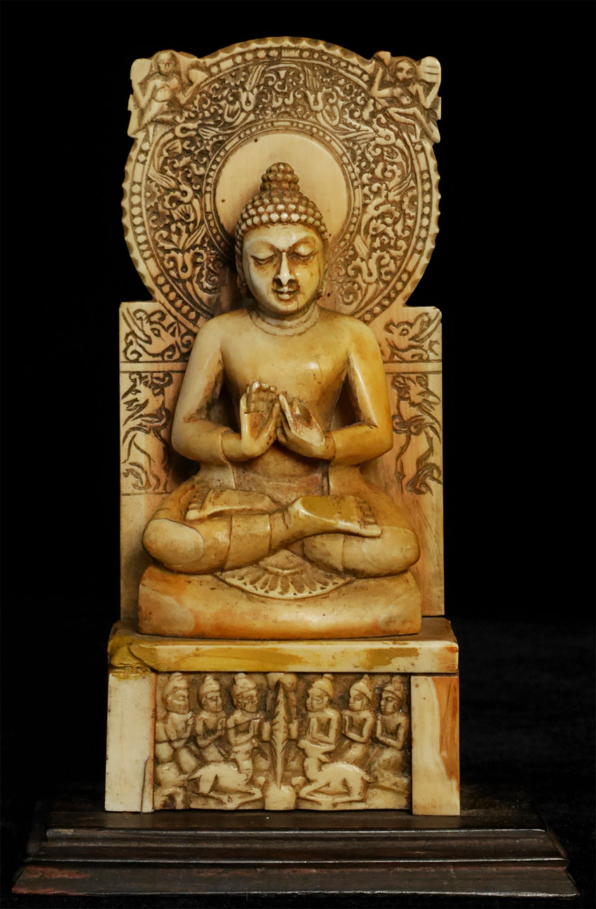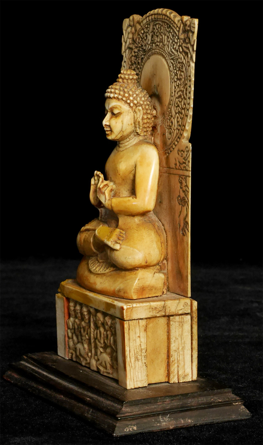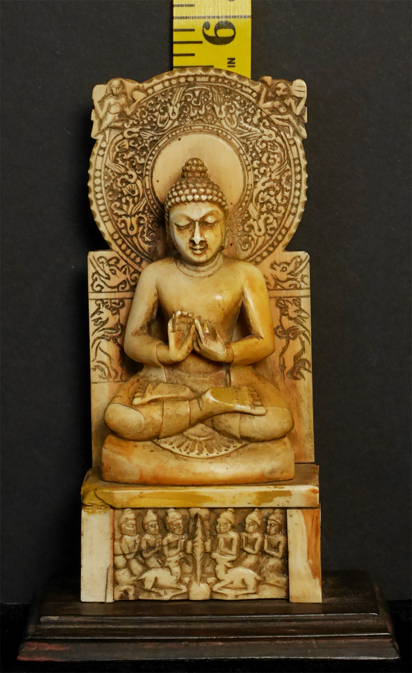 Antique Teaching Buddha in a classic Indian form that has been emulated for millennia. Carved out of bone, it manages to capture more detail than I have ever seen in bone carving. The age looks to be 19th to 20th century based on the patina and wear; amazingly, there are no breaks or age-appropriate splits that fit with the patina. Put together with pegs (no glue). The pegs in the base are loose. Spend time with the carving-it really is a unique object that takes bone carving to another level. Sits 5.5 inches tall. Domestic Shipping is included. International shipping $50