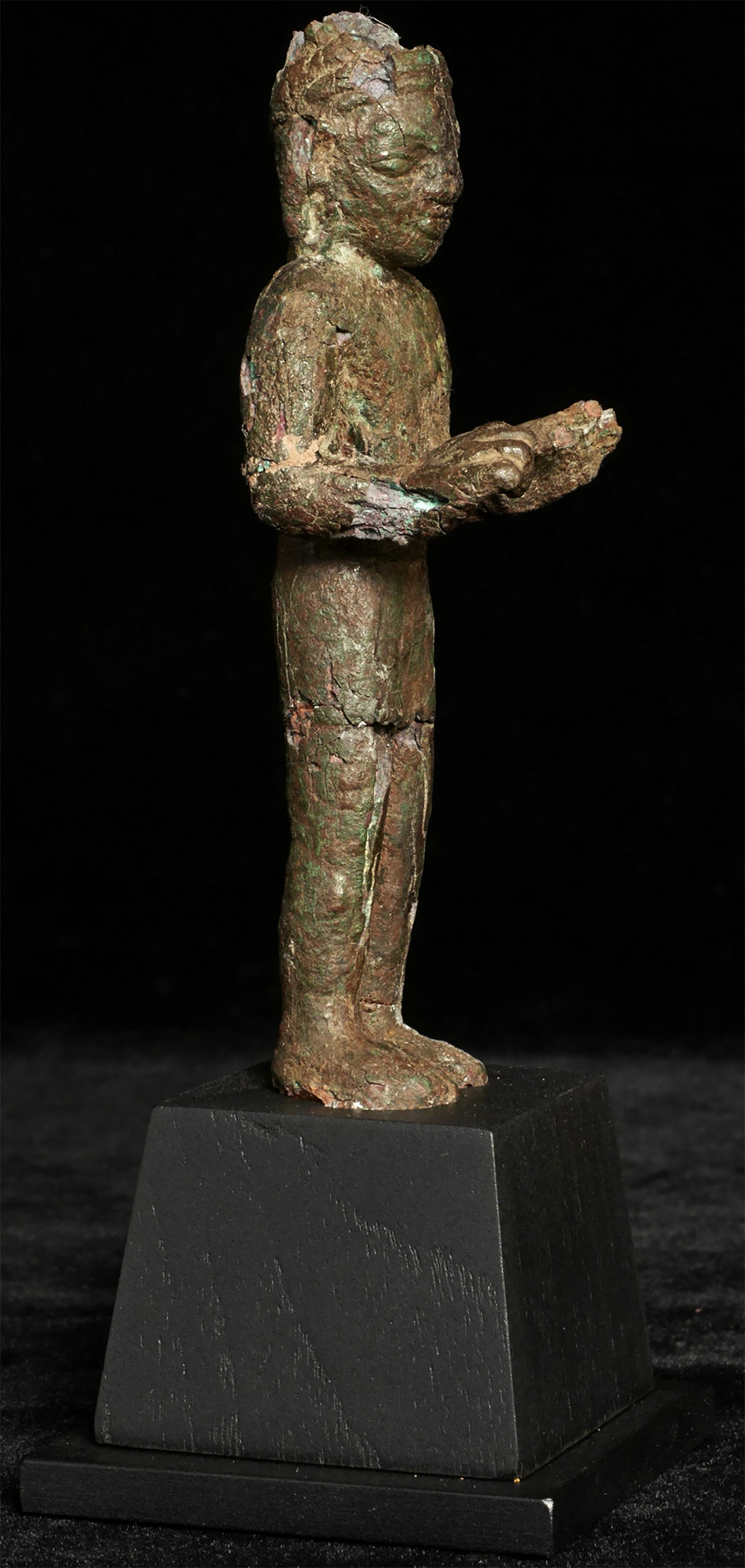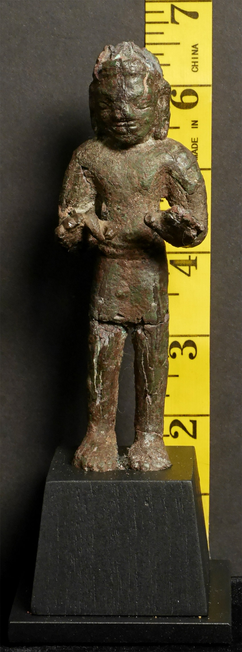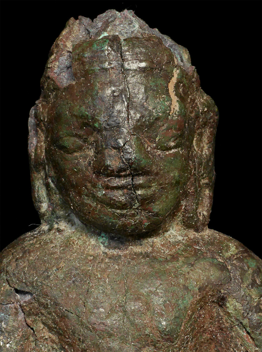 Very early SE Asian Dvarati style bronze Buddha from the 6-8thC. Strong burial patina, splits, repairs, and losses, but still standing after almost 1500 years. Figure measures 4 7/8 inches tall, on attached wooden base, the total height is 6.5 inches.