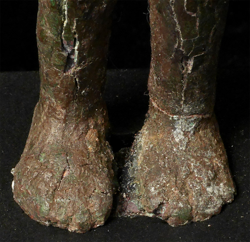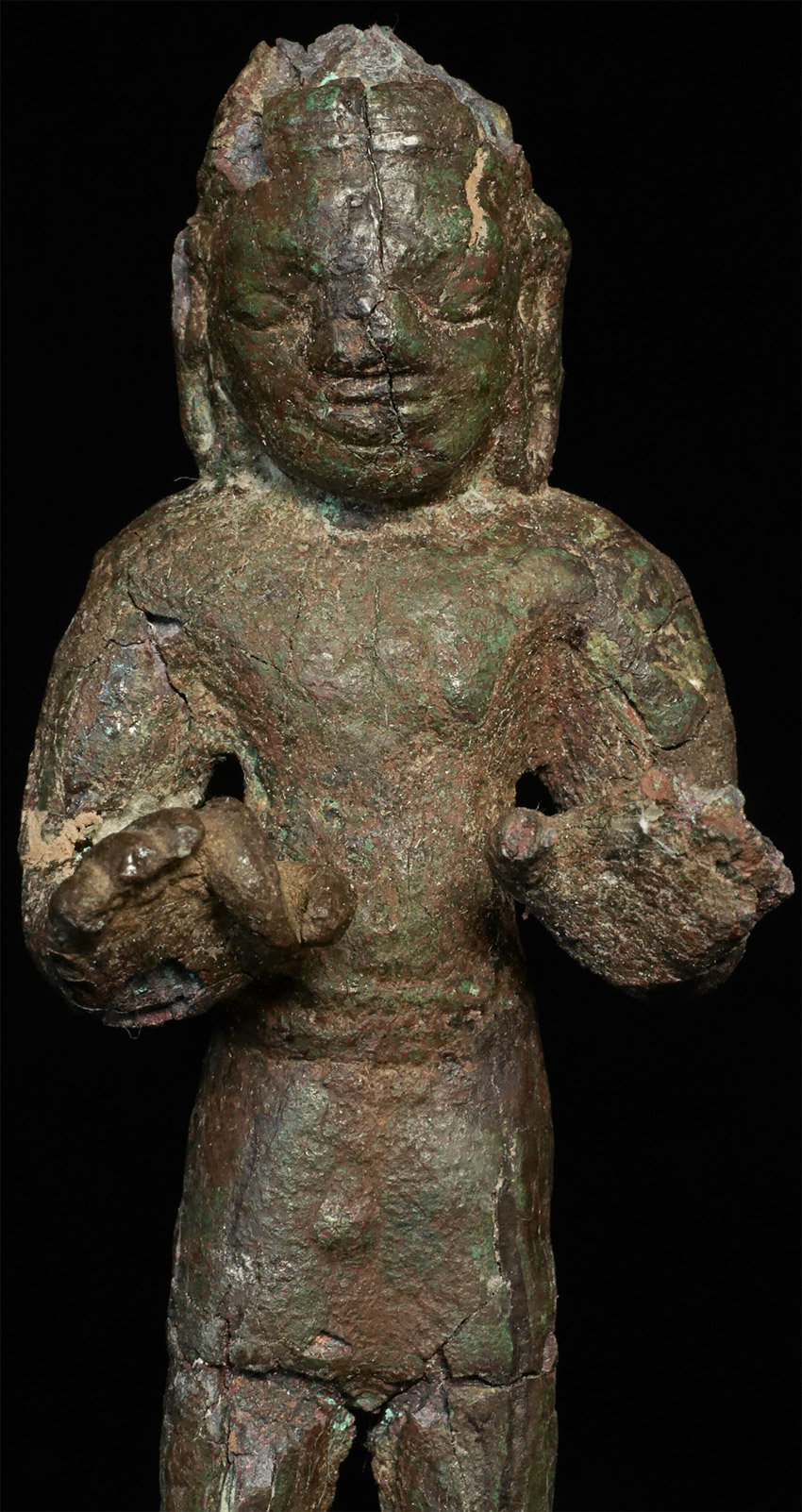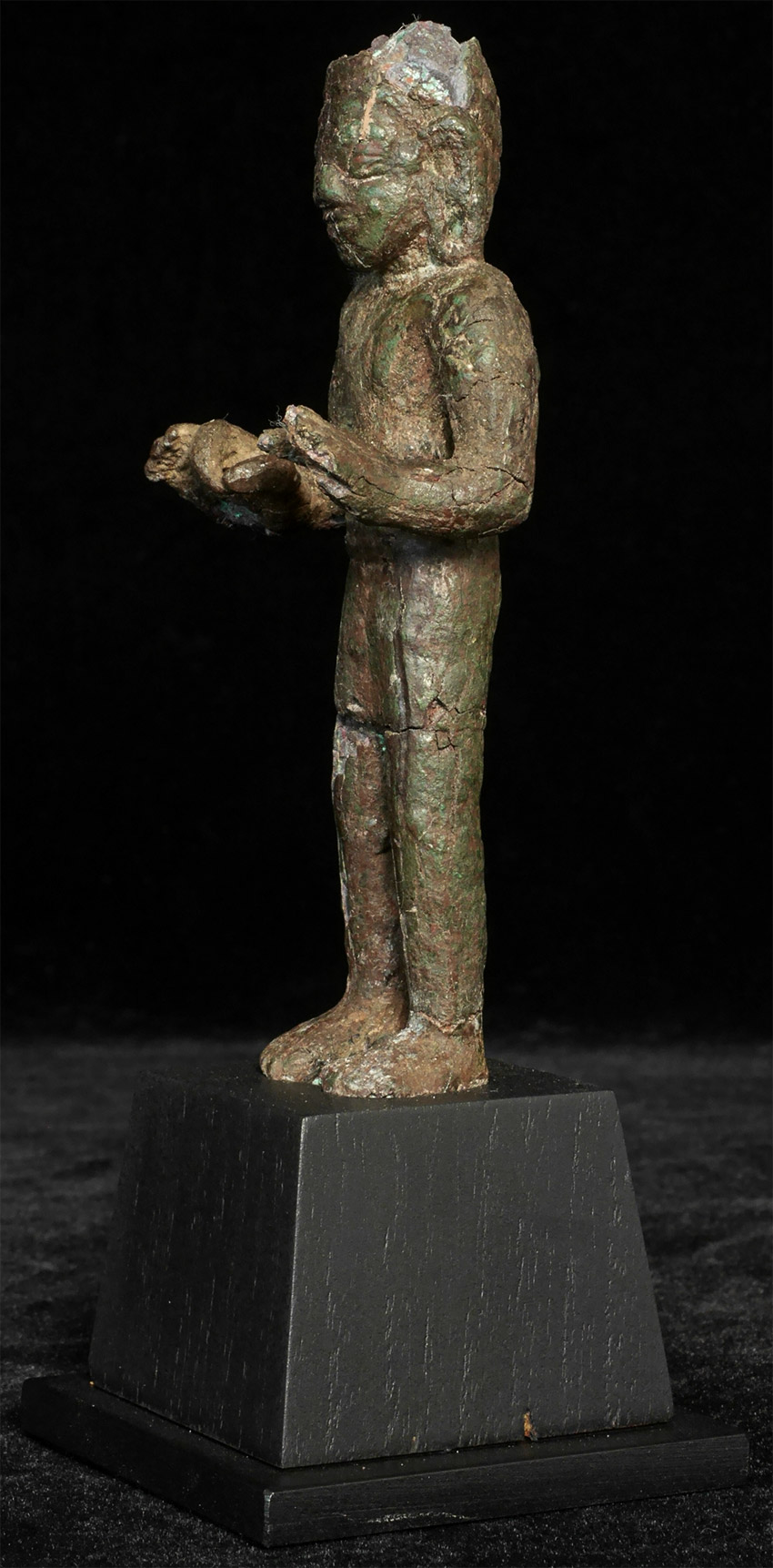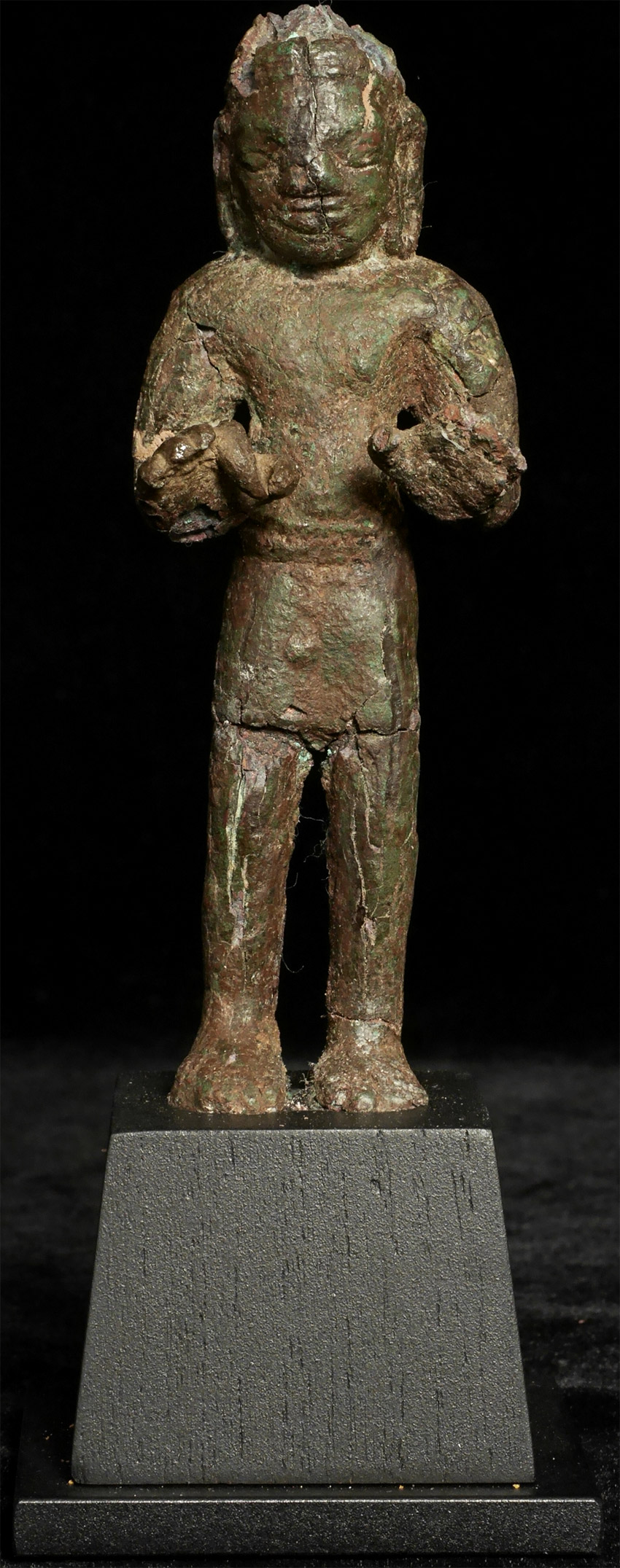 Very early SE Asian Dvarati style bronze Buddha from the 6-8thC. Strong burial patina, splits, repairs, and losses, but still standing after almost 1500 years. Figure measures 4 7/8 inches tall, on attached wooden base, the total height is 6.5 inches.