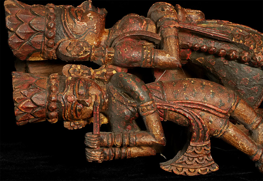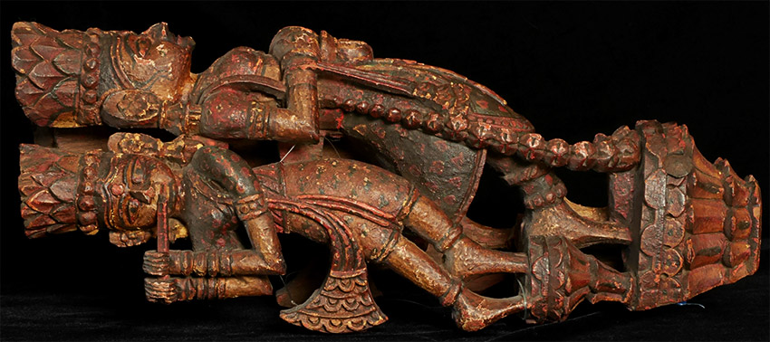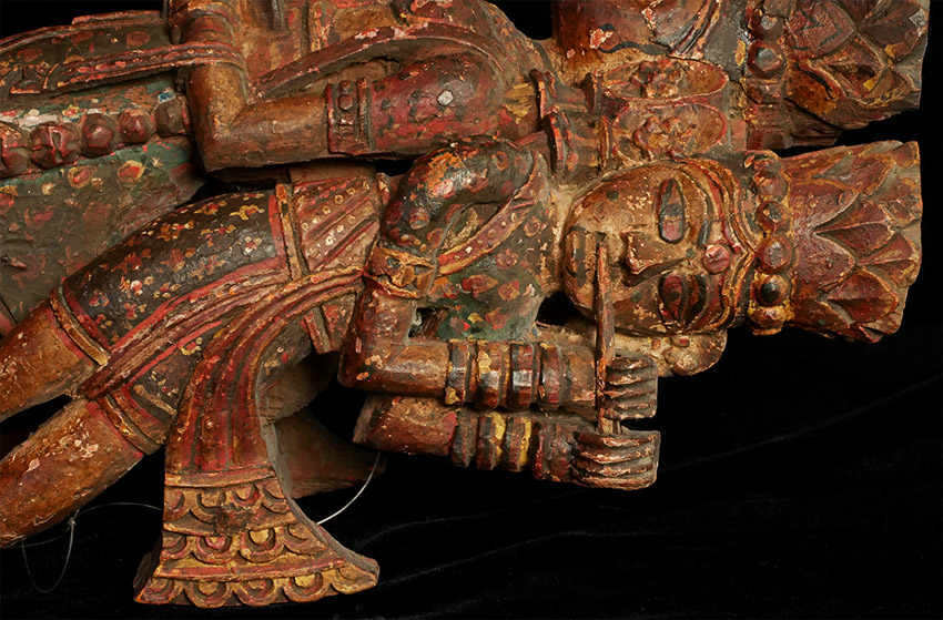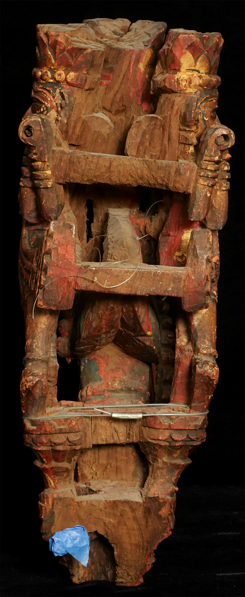 Very fine Indian Carving. Wear and some loss and cracking, but much of the original paint remains. Has old museum or collection numbers on it. Approximate dimensions are 18 inches tall, 6.5 inches wide and 7 inches deep. Far better than 95$ of Indian carvings of this type.