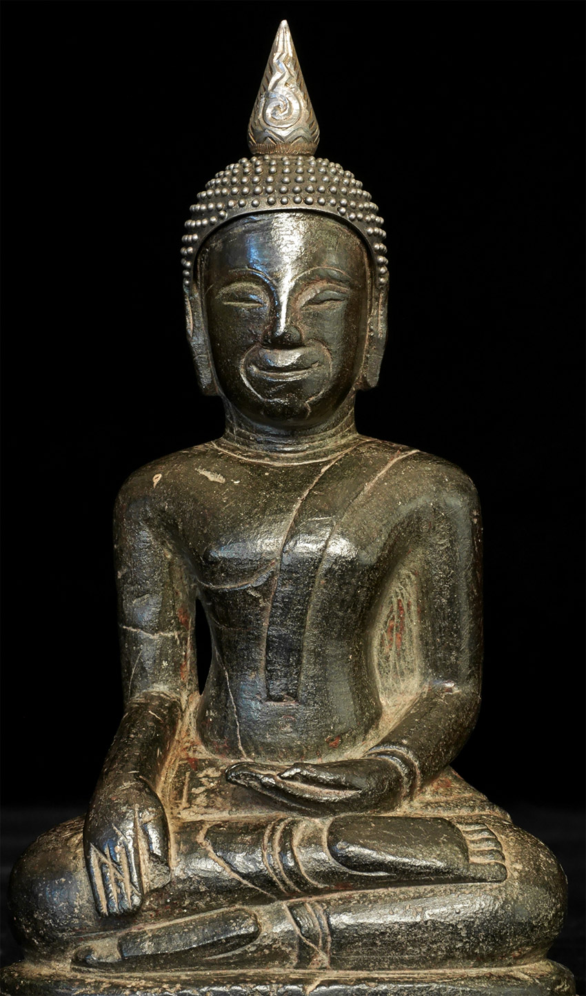 A favorite, and out of the personal collection of the last princess of the former kingdom of Nan (Her grandfather was the last sitting royal there before they were annexed by Siam). A 15-17thC Northern Thai black stone Buddha with a custom modern silver crown and base. He has a wonderfully expressive face and overall feel. The patina is fantastic, and makes it much easier to authenticate him than the vast majority of stone pieces. 6" tall.
