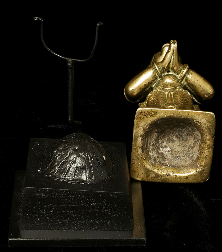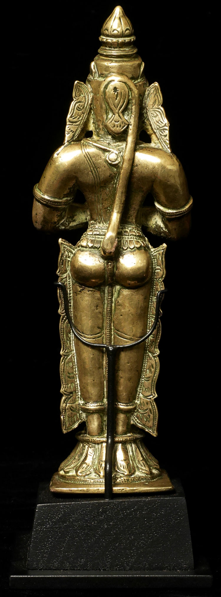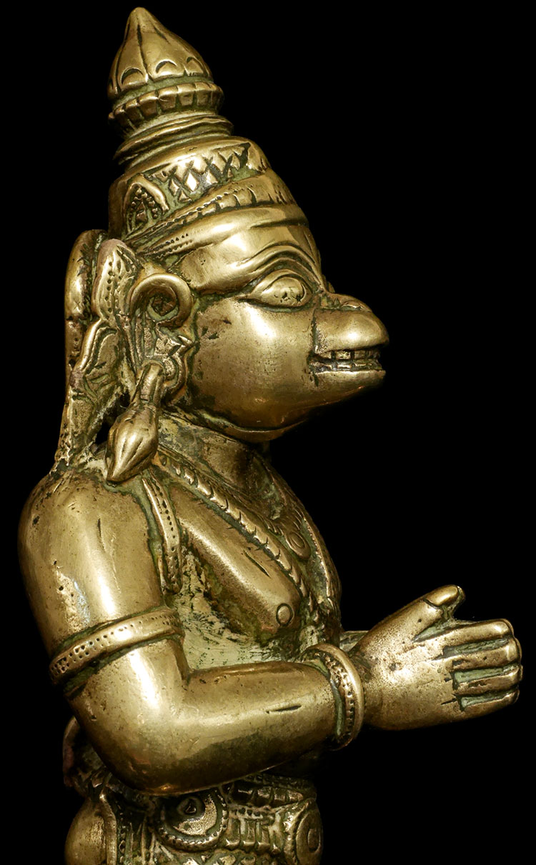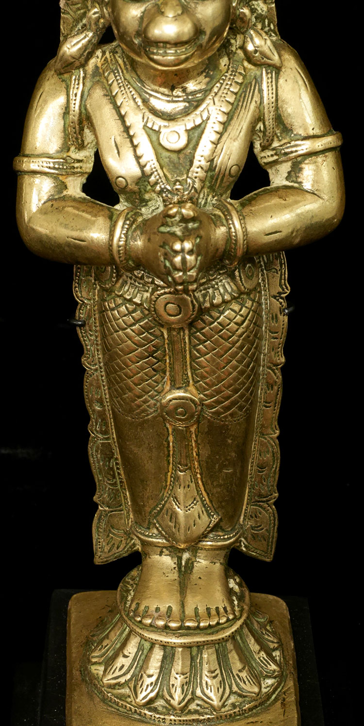 Large and heavy antique 18/19thC Hanuman-spirit of service. Lots of personality in his smile. High quality alloy. Sits 8.25 inches tall, height on custom base is 9 5/8 inches. Hard to find in this size and overall quality.