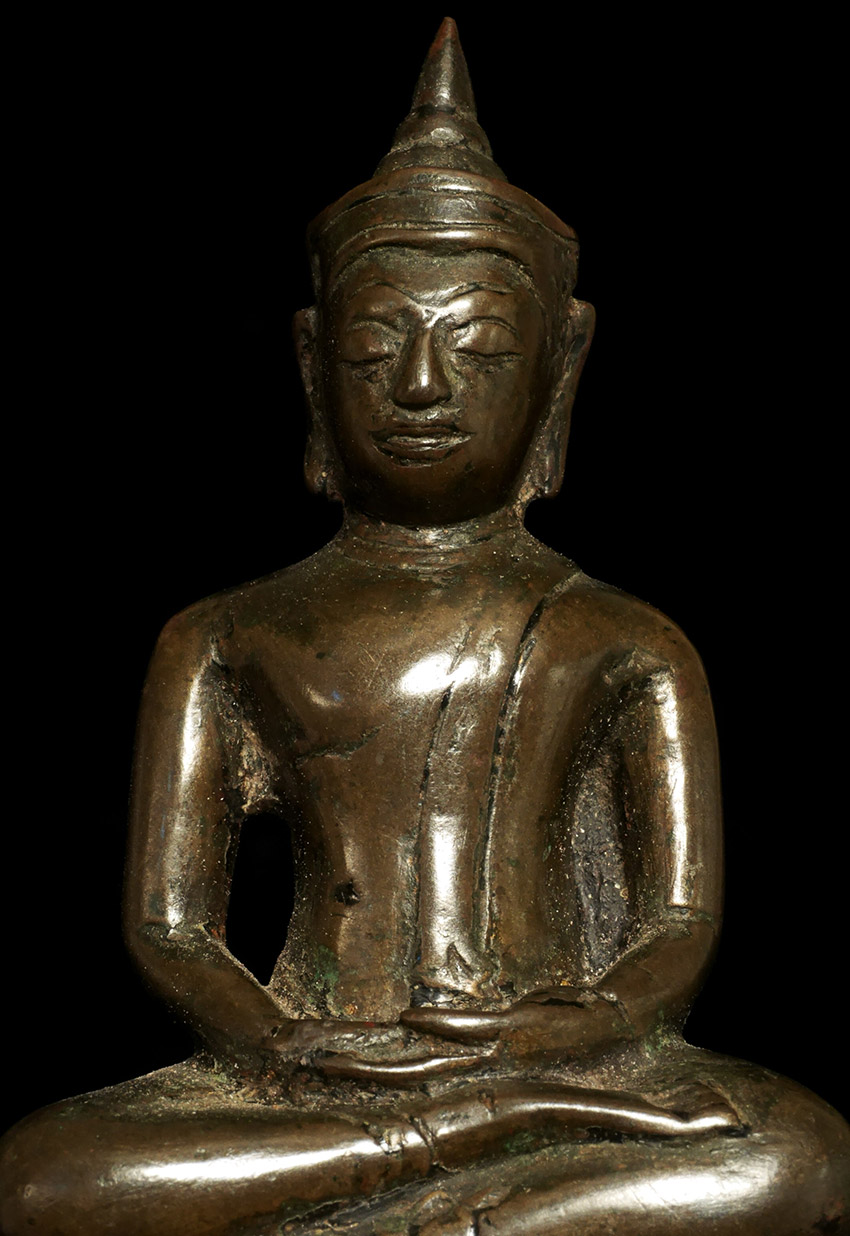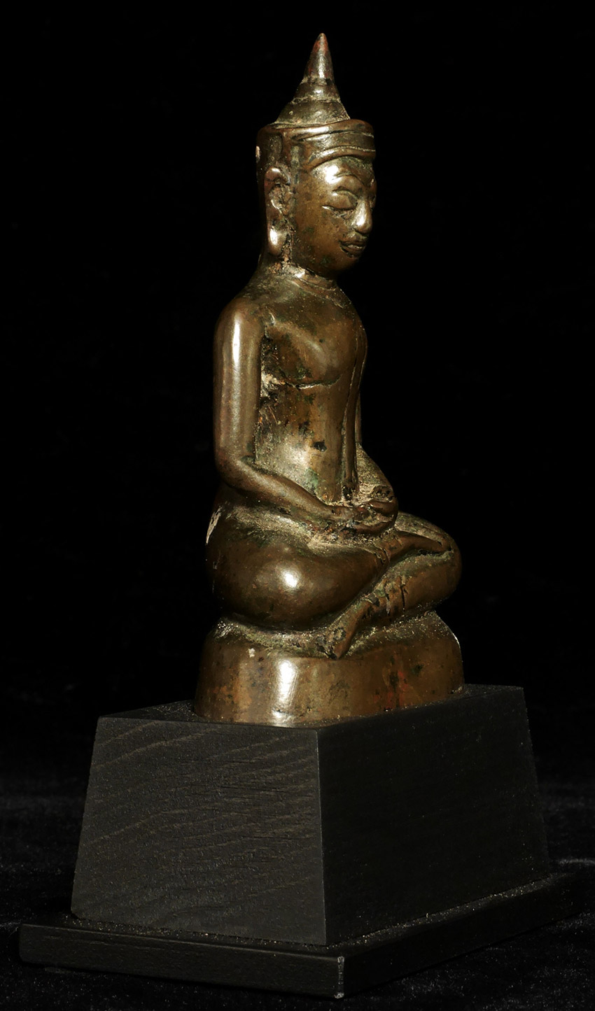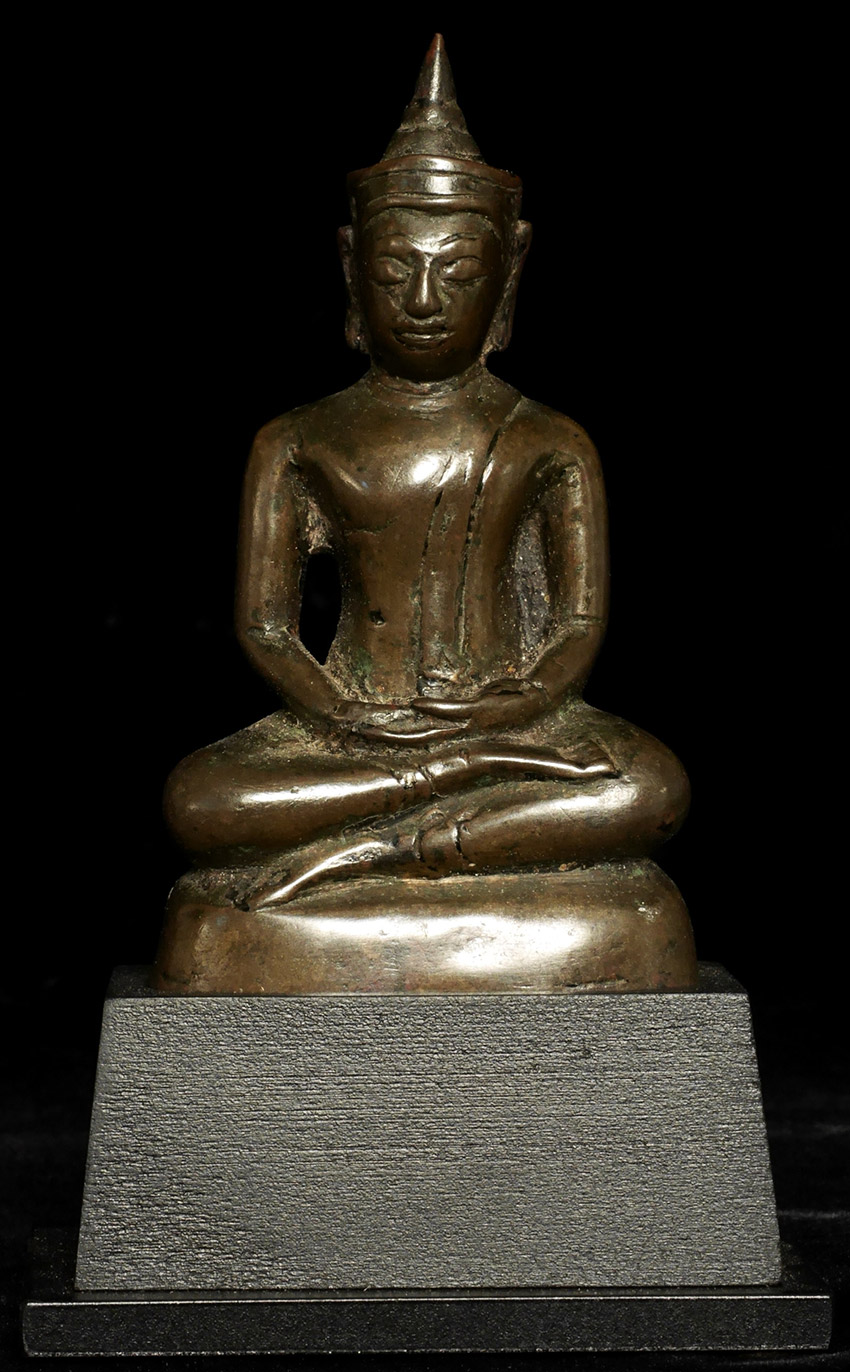 Classic bronze 15thC Thai Kampen-Phet style (late Sukhotai). Sits 4-3/8" tall, height on custom stand is 5 7/8 inches.