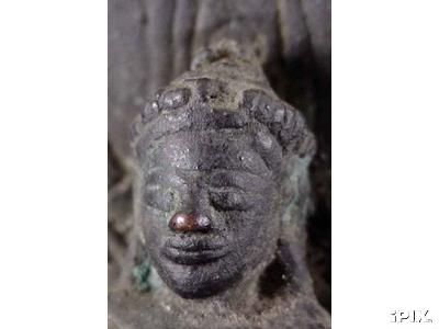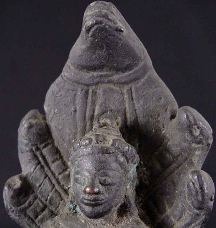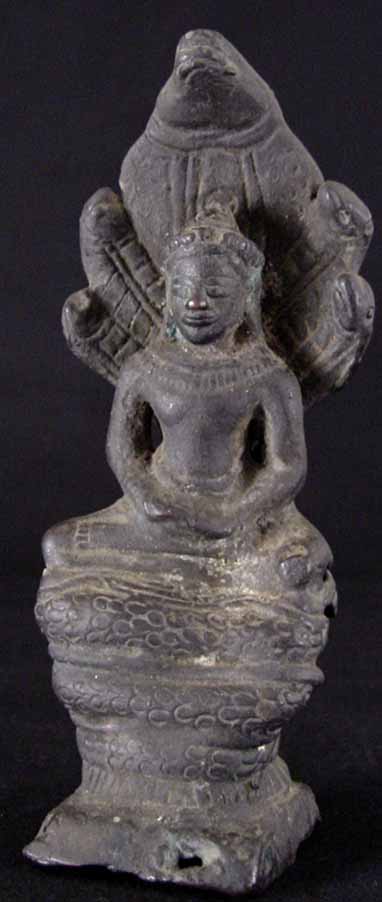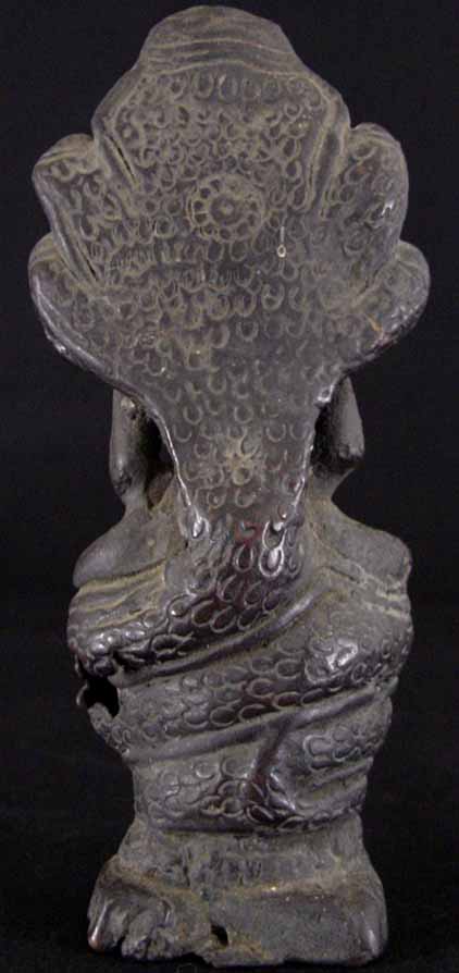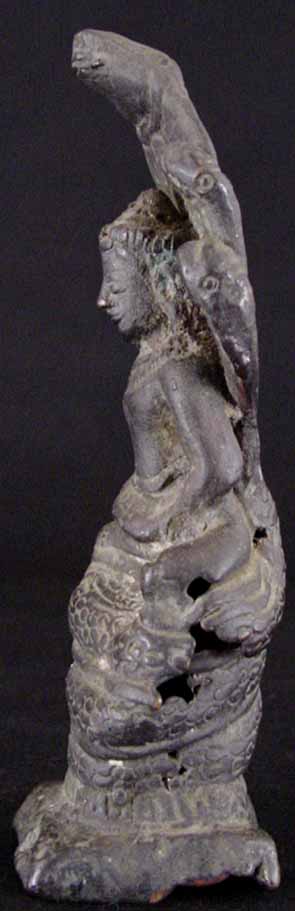 This is a very wonderful Thai Bronze Naga Buddha. It looks to be 13th century Lopburi style, although it may be a little later. The face is absolutely fantastic. The casting is not refined, and there are significant flaws in the casting, although they do not take away from the spectacular presence of this Buddha. Many Buddhas of this type have more serious expressions, and do not radiate the joy of this piece. He stands 5 and 5/8th to the top of the Naga.