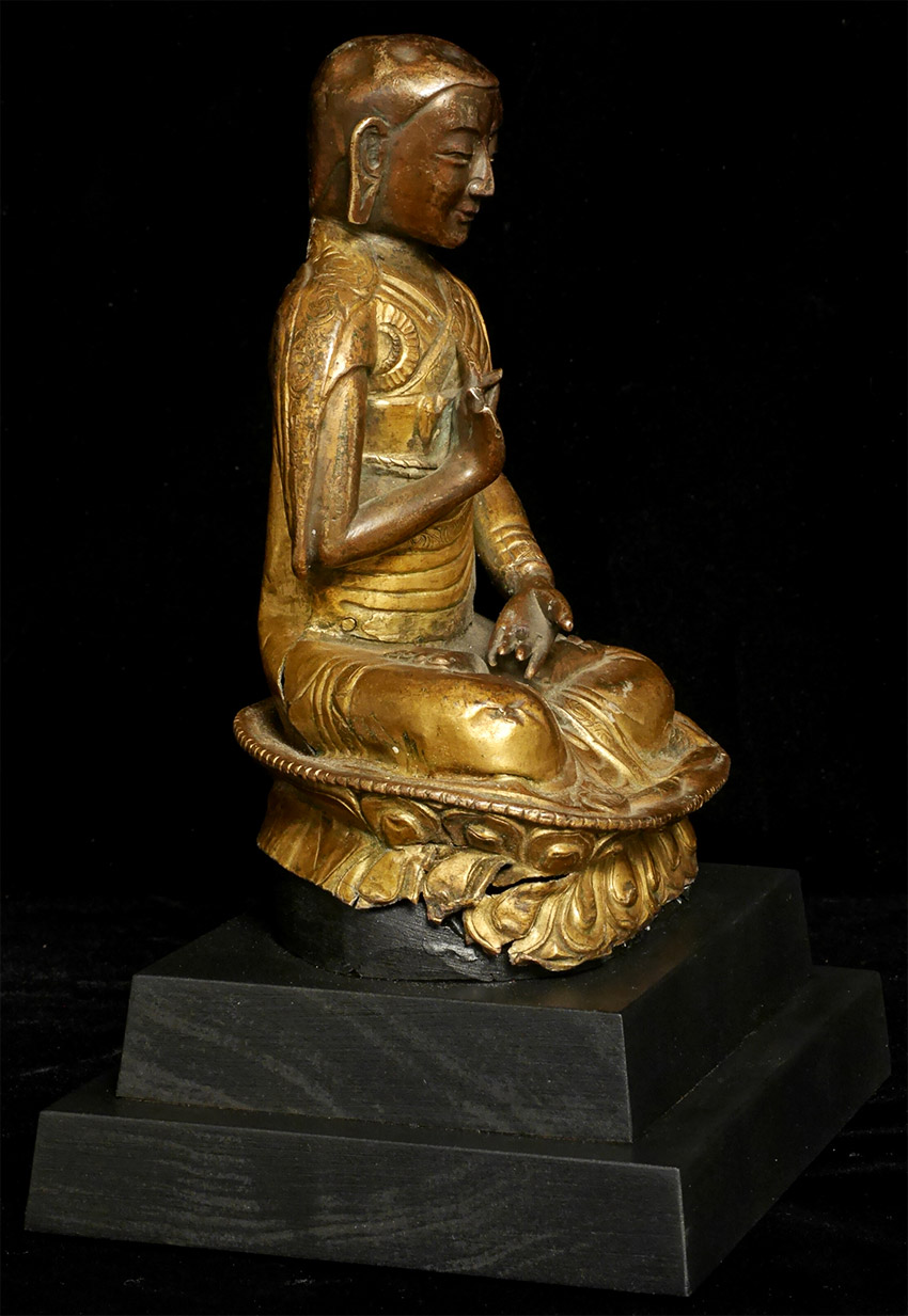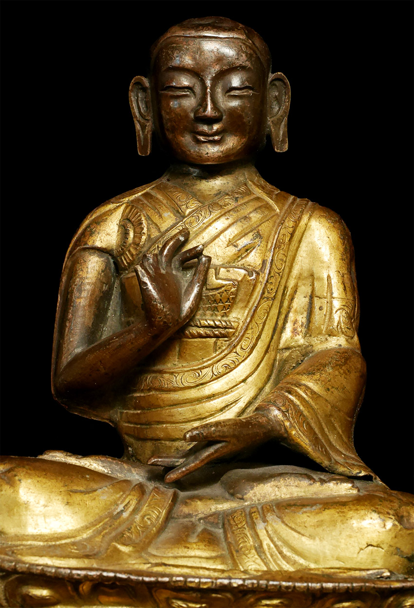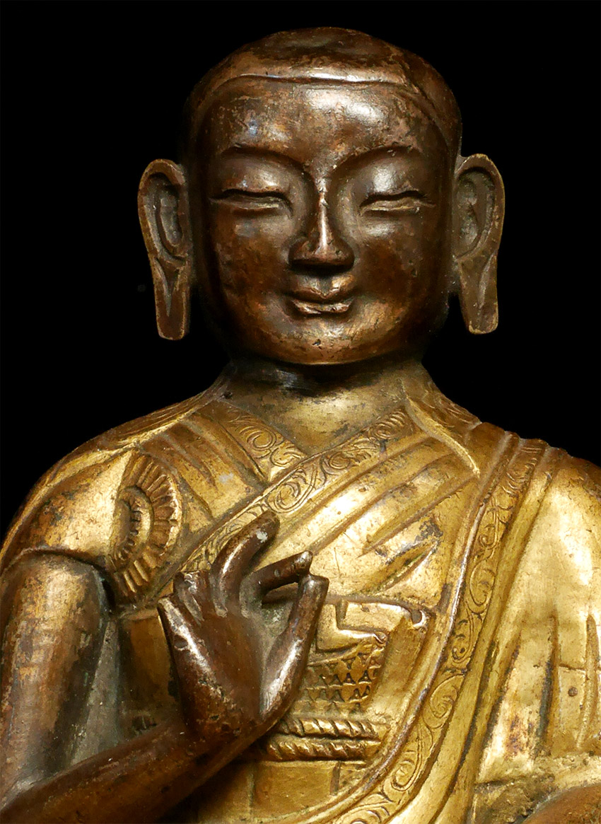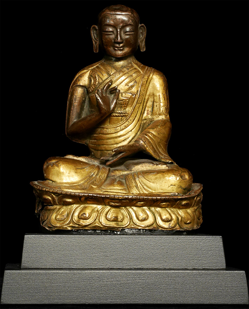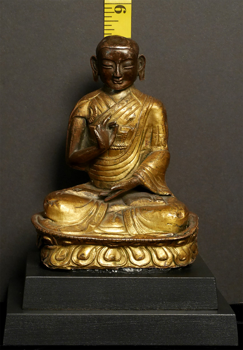 Great 18/19thC Mongolian Copper Repousse Monk. Fantastic face. Losses as seen in the photos. 5.75 inches tall, height on custom base is 8 1/8 inches