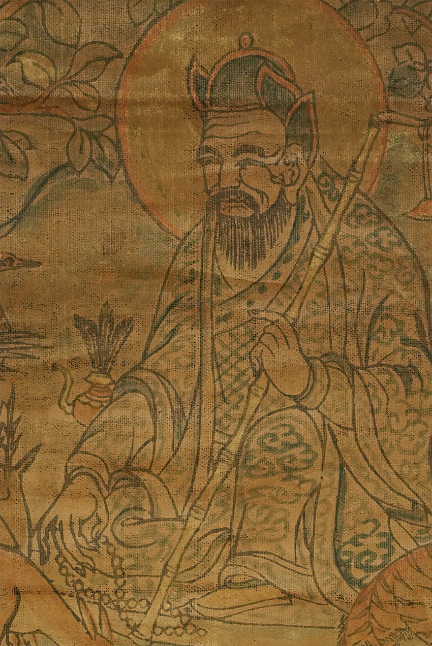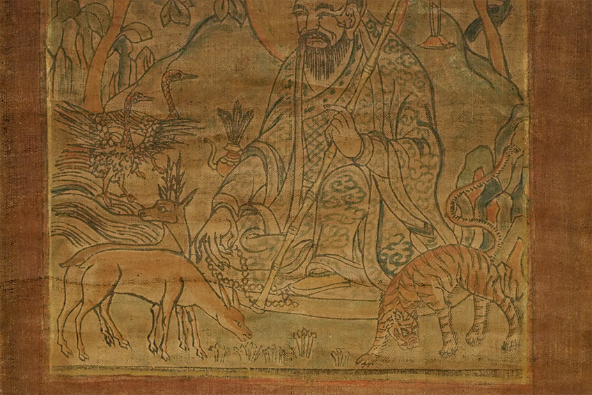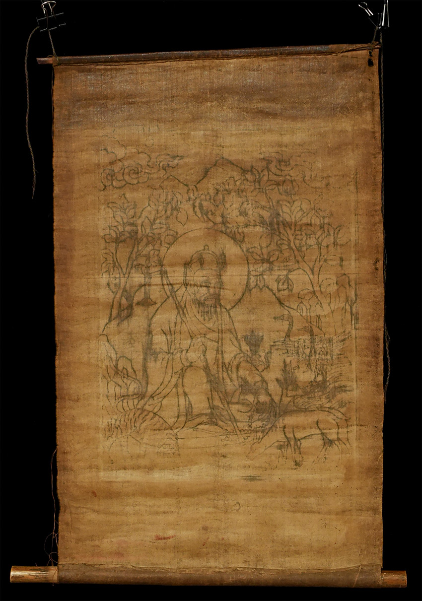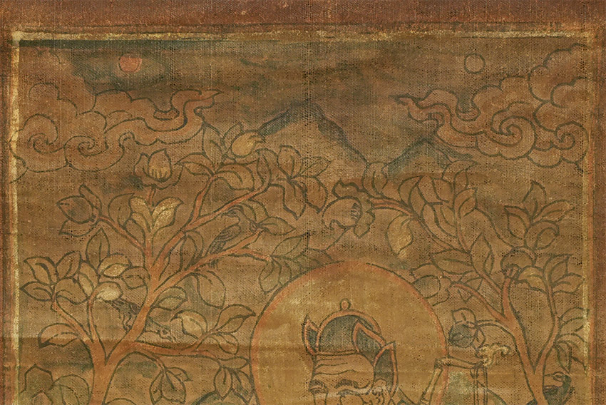 Delicate Mongolian hand-colored wood block in old original cloth frame and sticks. 9.75 x 15.5 inches to the outer edge of the frame.