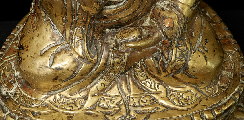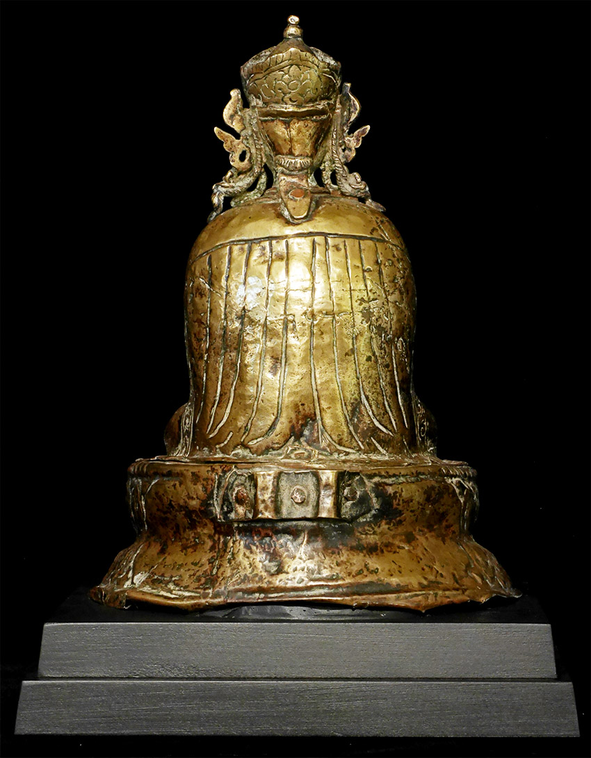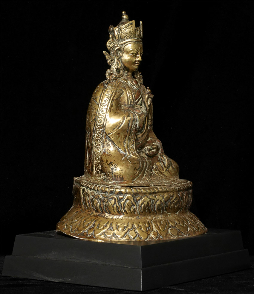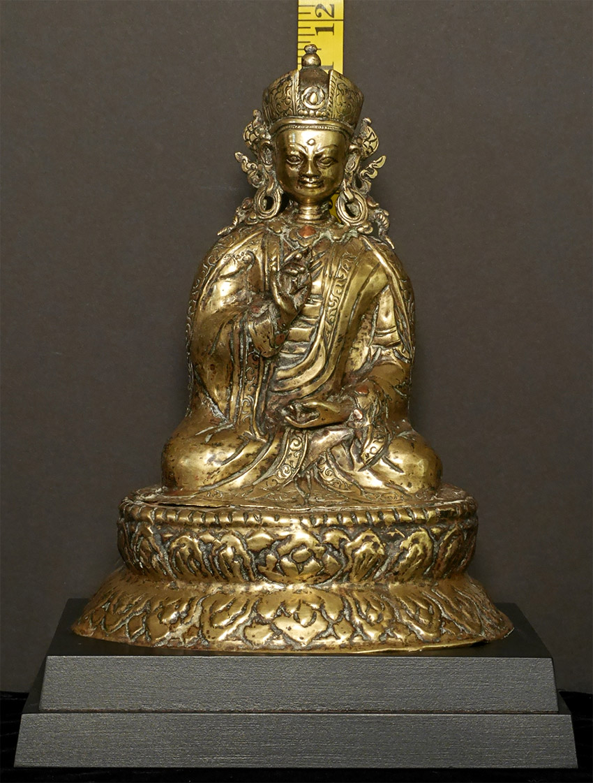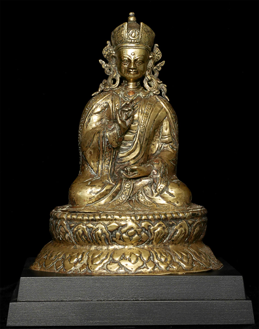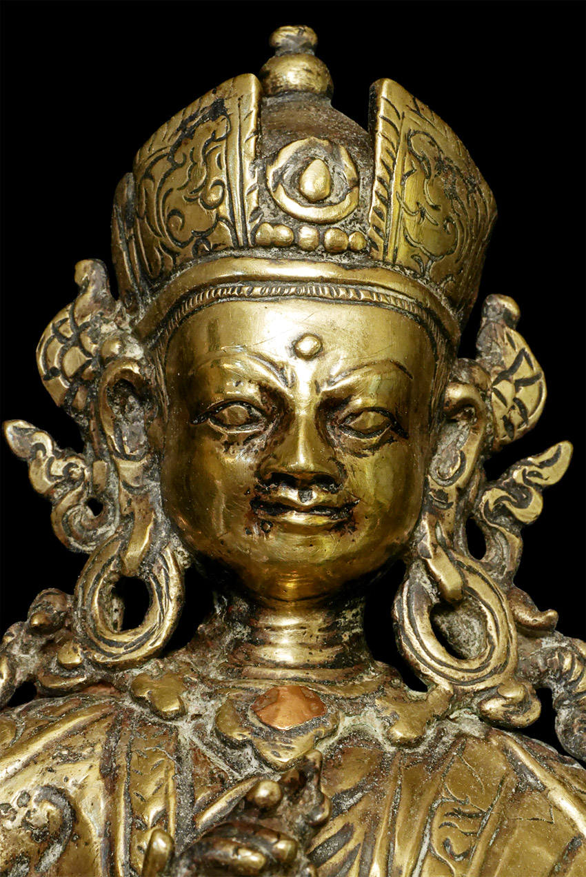 Large, very old copper repousse Tibet/Nepal Padmasambava. Size is (24.5cm)9.5 inches tall, 11 5/8 inches on custom stand. Pictured in the accompanying journal from 1984 (Kailash), in which the group of pieces from which this comes is described in detail.