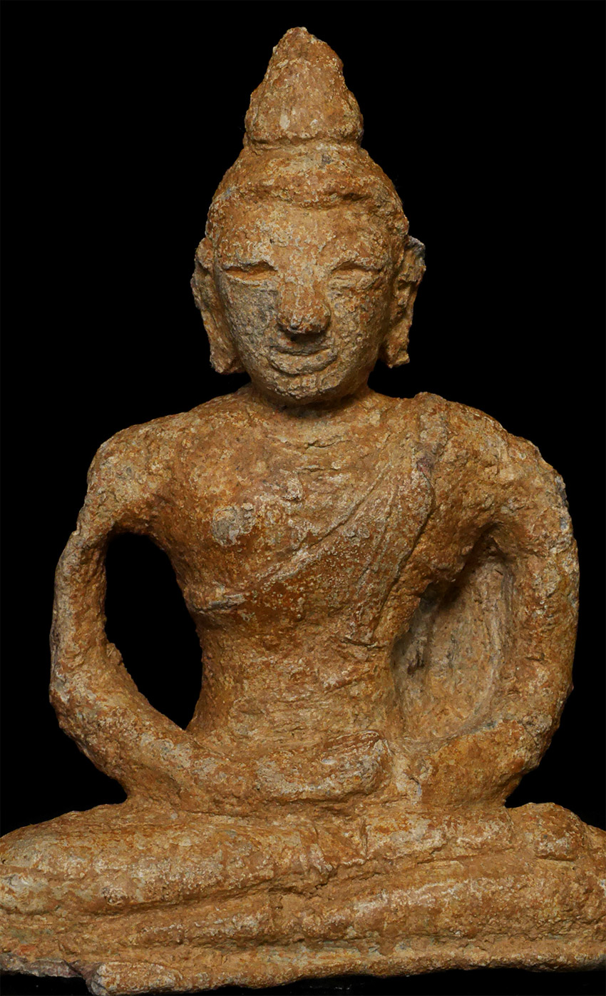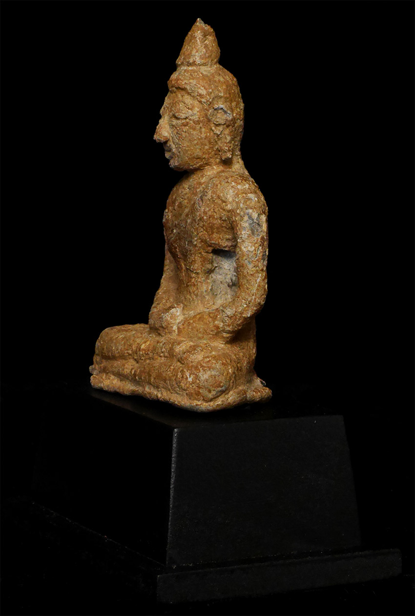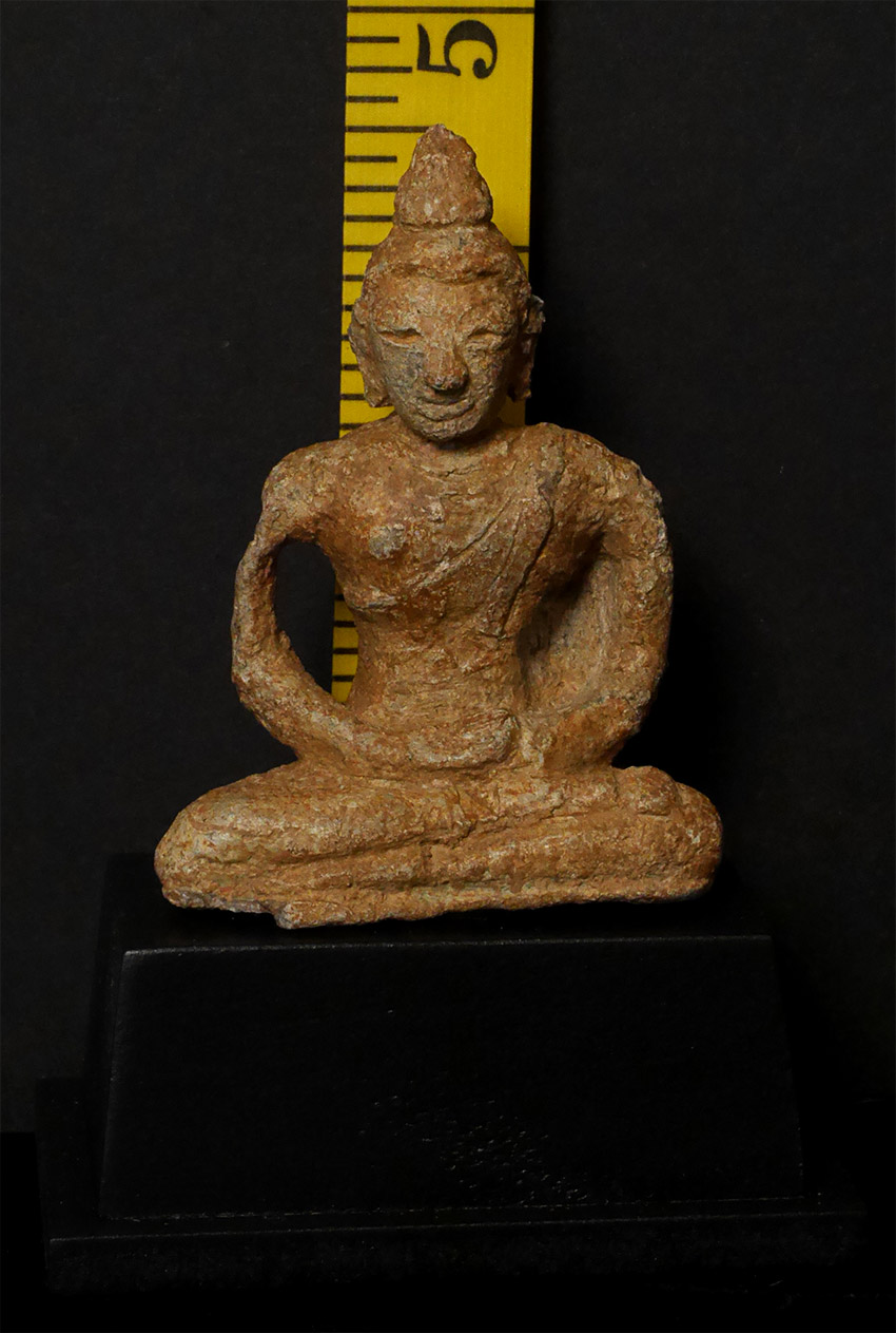 Very unusual Buddha- hard to identify- possibly Sri Lankan, and very early- up to 1,000 years old. Also maybe 13/14thC SE Asian emulation from Thailand or Burma. Or? Unusual Lead or Silver/Lead Alloy. Never seen another like it. Solid-Cast. 3 inches tall, 4.5 inches on custom base. Mystery.