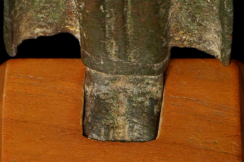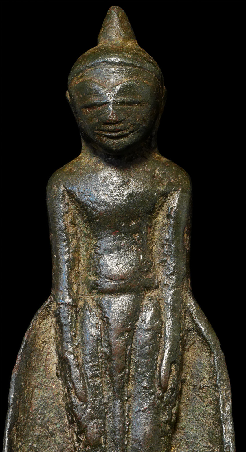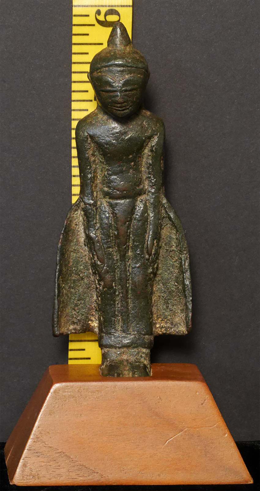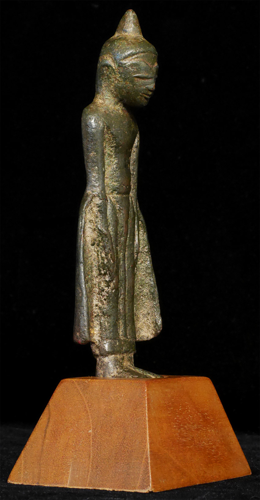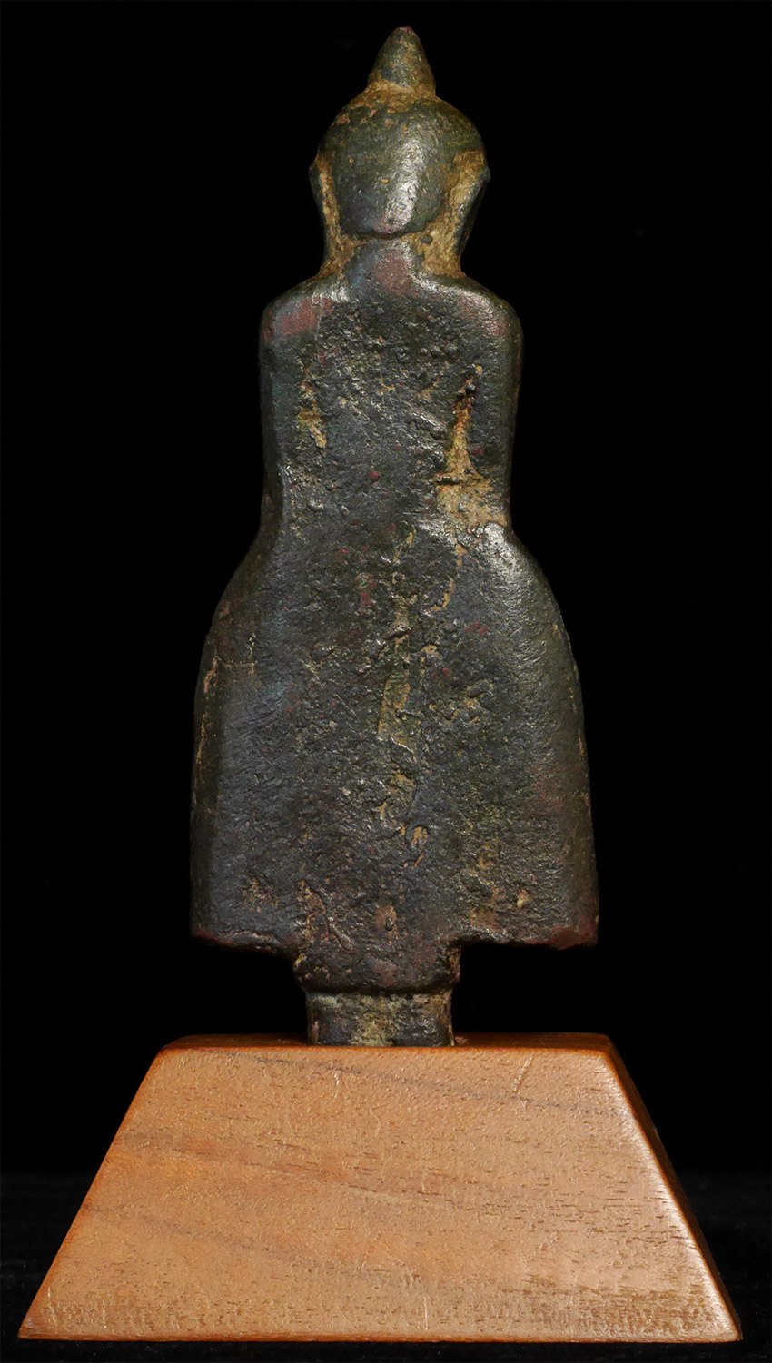 Early Burmese Buddha. Probably Ava period, and more than 500 years old. 4-5/8 inches tall, height on custom stand is 5.75 inches. Solid cast. Very uncommon type, with a flat, compact body, and large head.