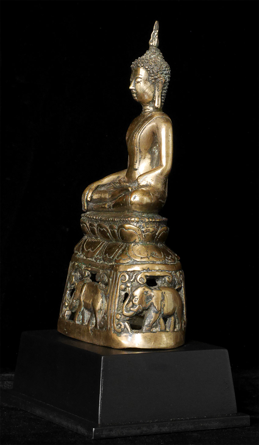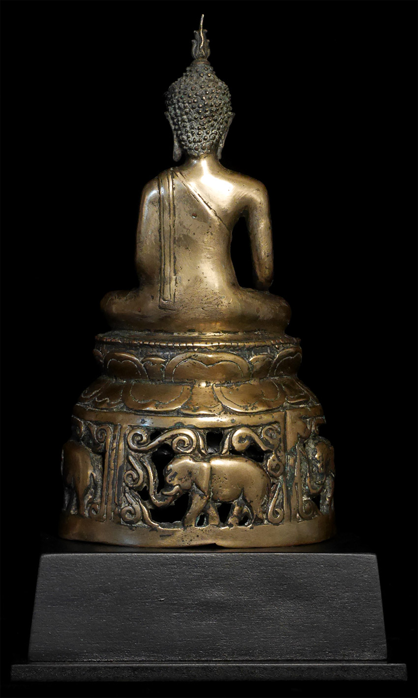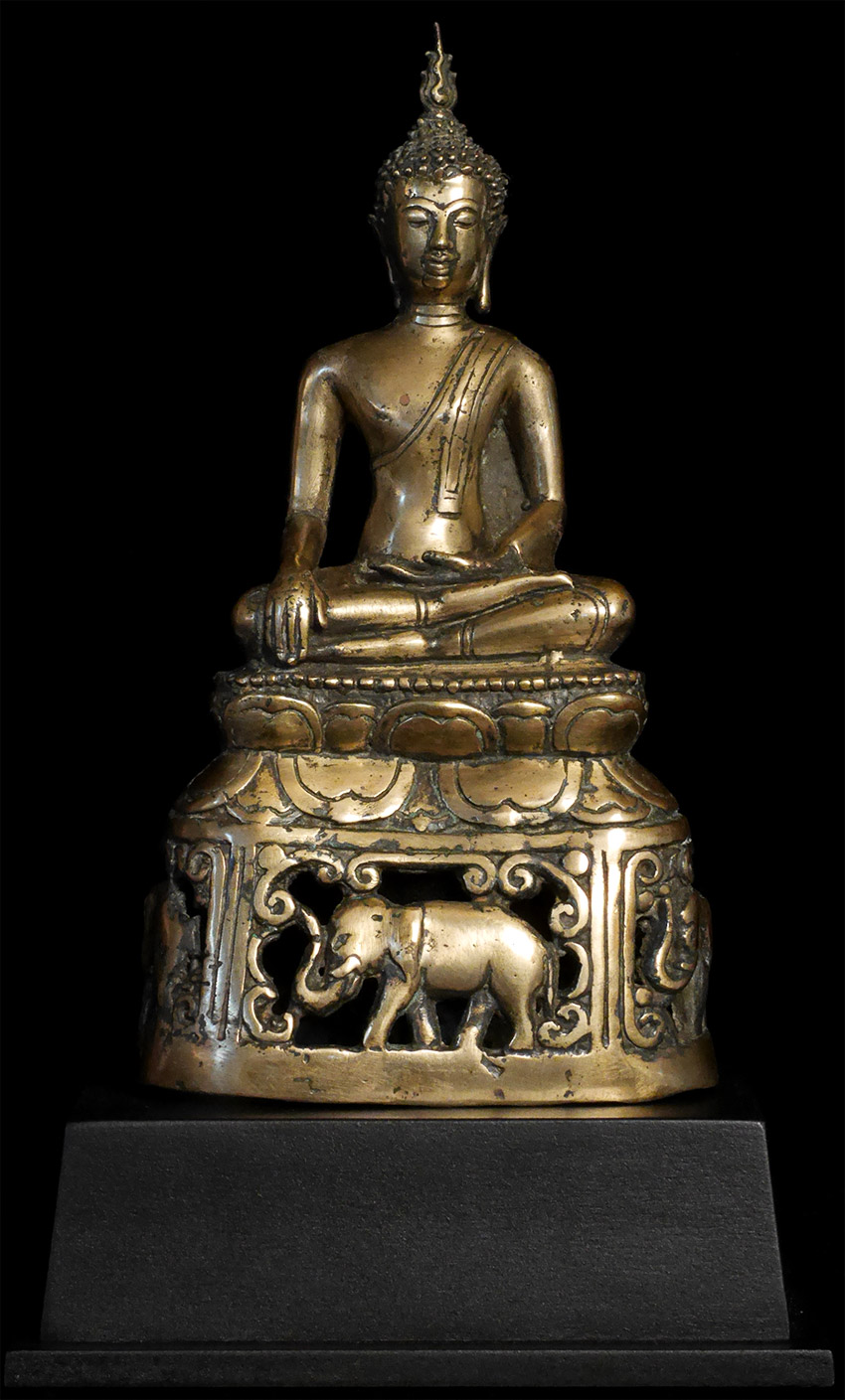 Antique Northern Thai Bronze Buddha with a rare base that has 4 elephants on it. 7 5/8 inches tall, height on custom base is 9.75 inches. Probably 200 to 300 years old- may be older.