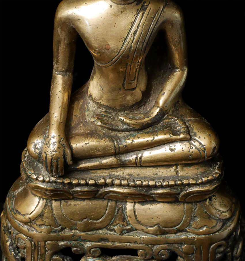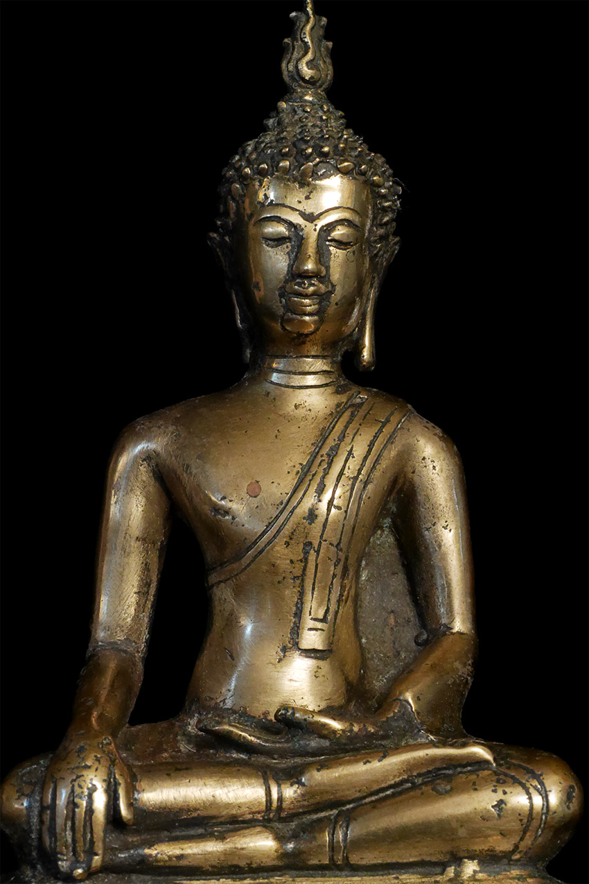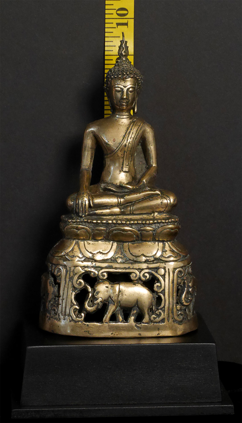 Antique Northern Thai Bronze Buddha with a rare base that has 4 elephants on it. 7 5/8 inches tall, height on custom base is 9.75 inches. Probably 200 to 300 years old- may be older.