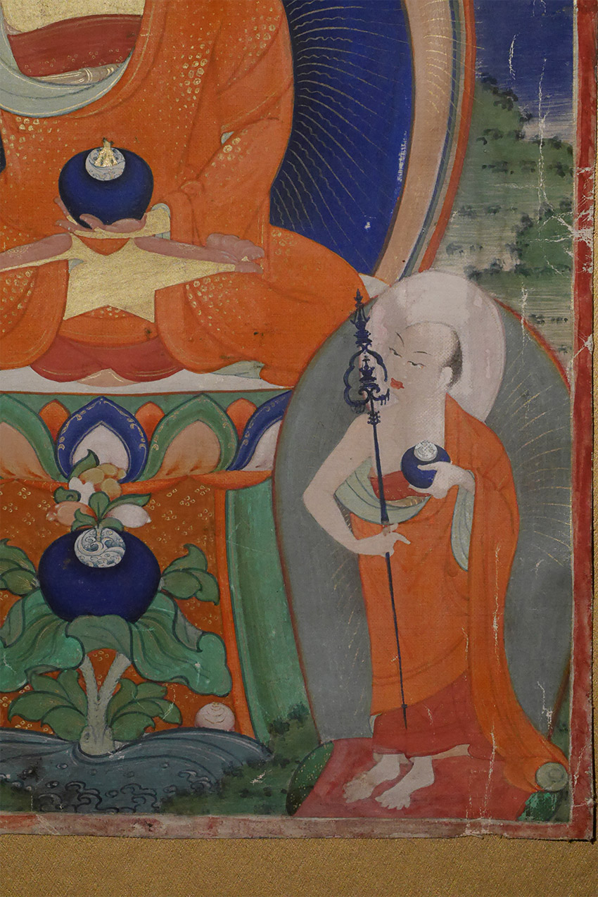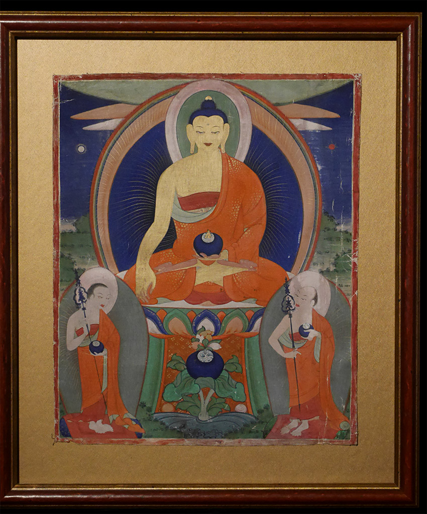 One of my "personal" Thangkas was offered for sale for the first time in almost 25 years of owning. Thangka measures 9-1/8 x 11.25, and the frame measures 12-7/8 x 15 inches. Came out of Mongolia in the 1990s, and is professionally framed with museum glass and silk matting. Buddha skin all gilding- as clean as you will find. Photo of writing on the back included.