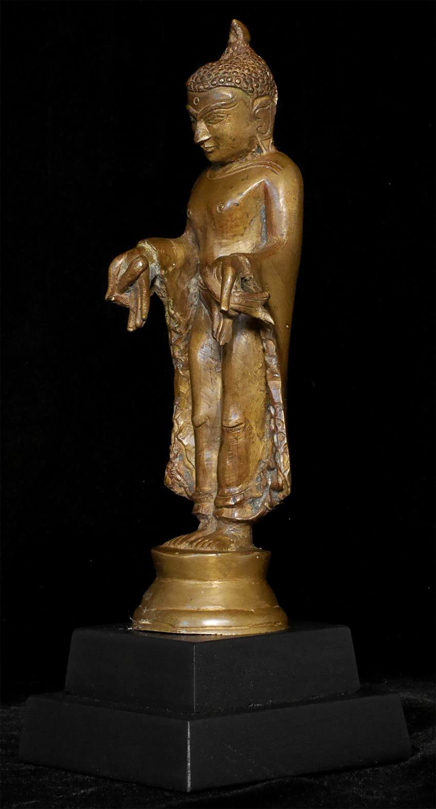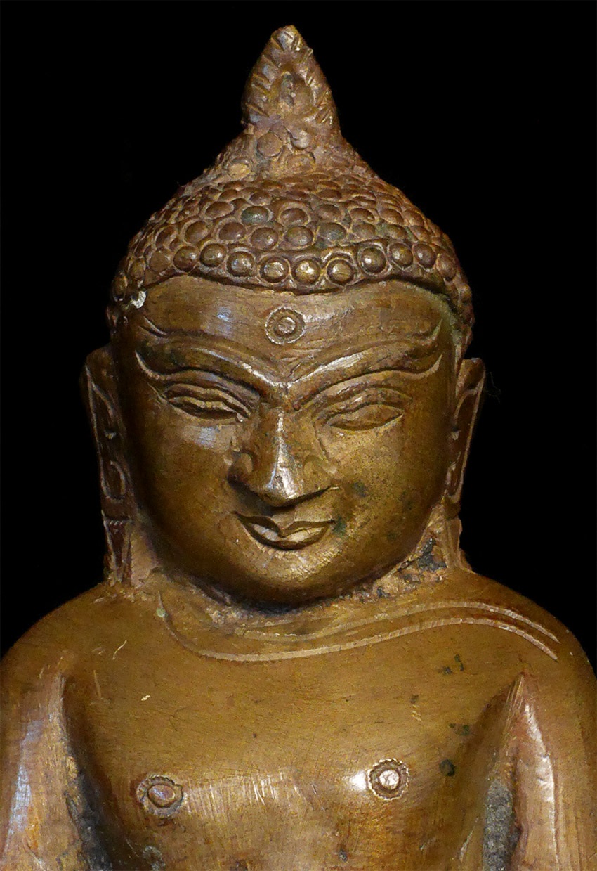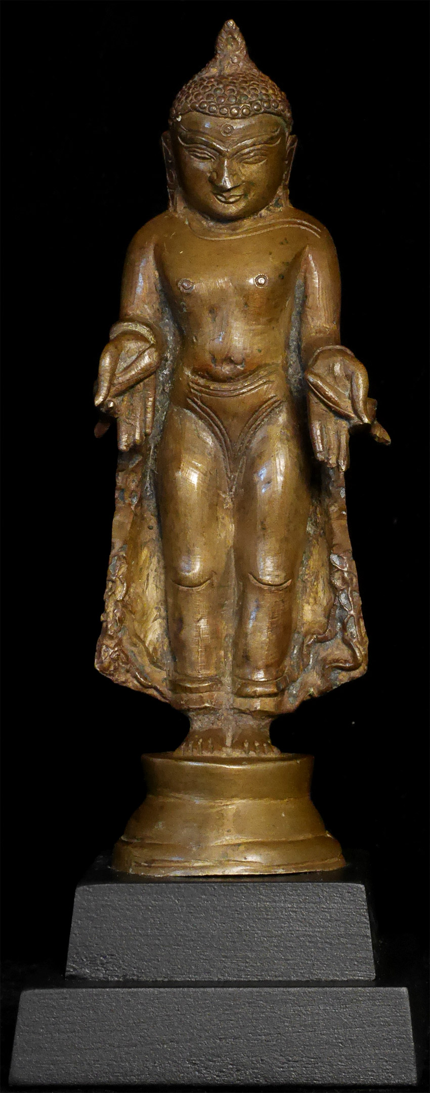 18th Century Burmese solid cast bronze buddha emulating an earlier Pagan style buddha. Measures 6.75 inches tall, 8 3/8 inches on custom stand.