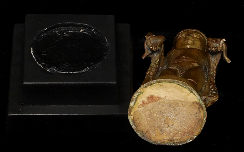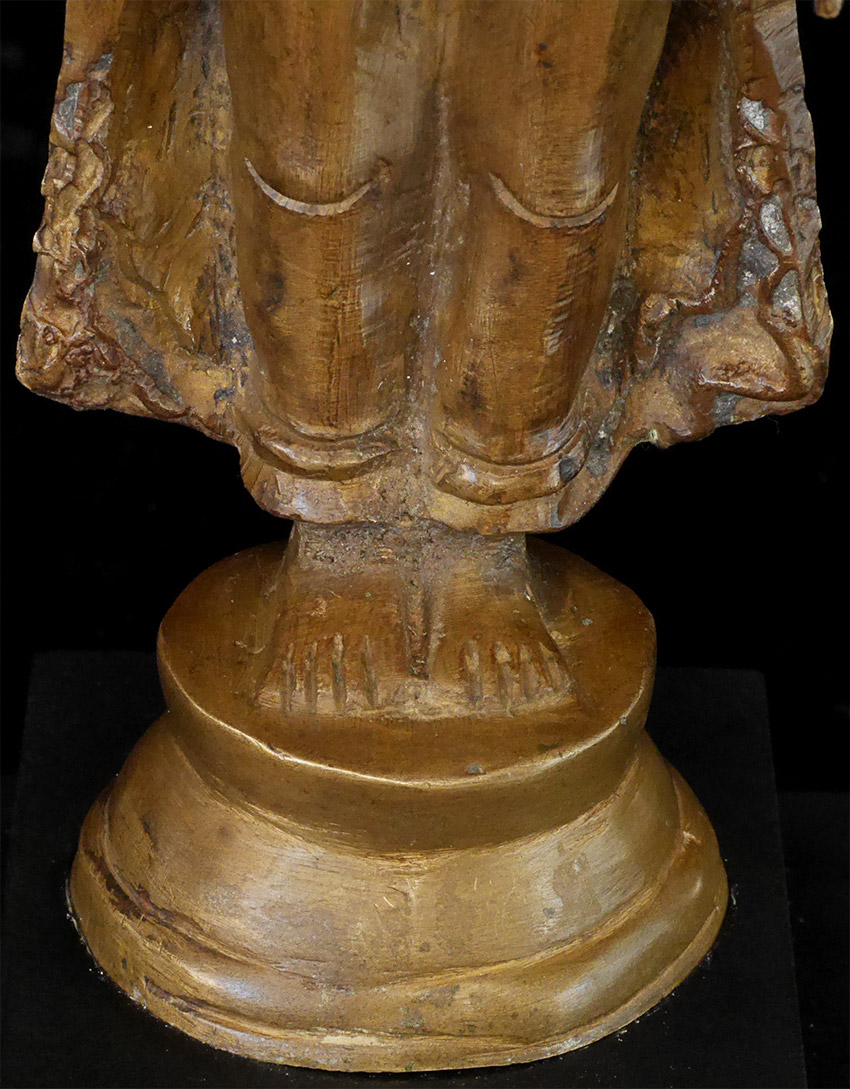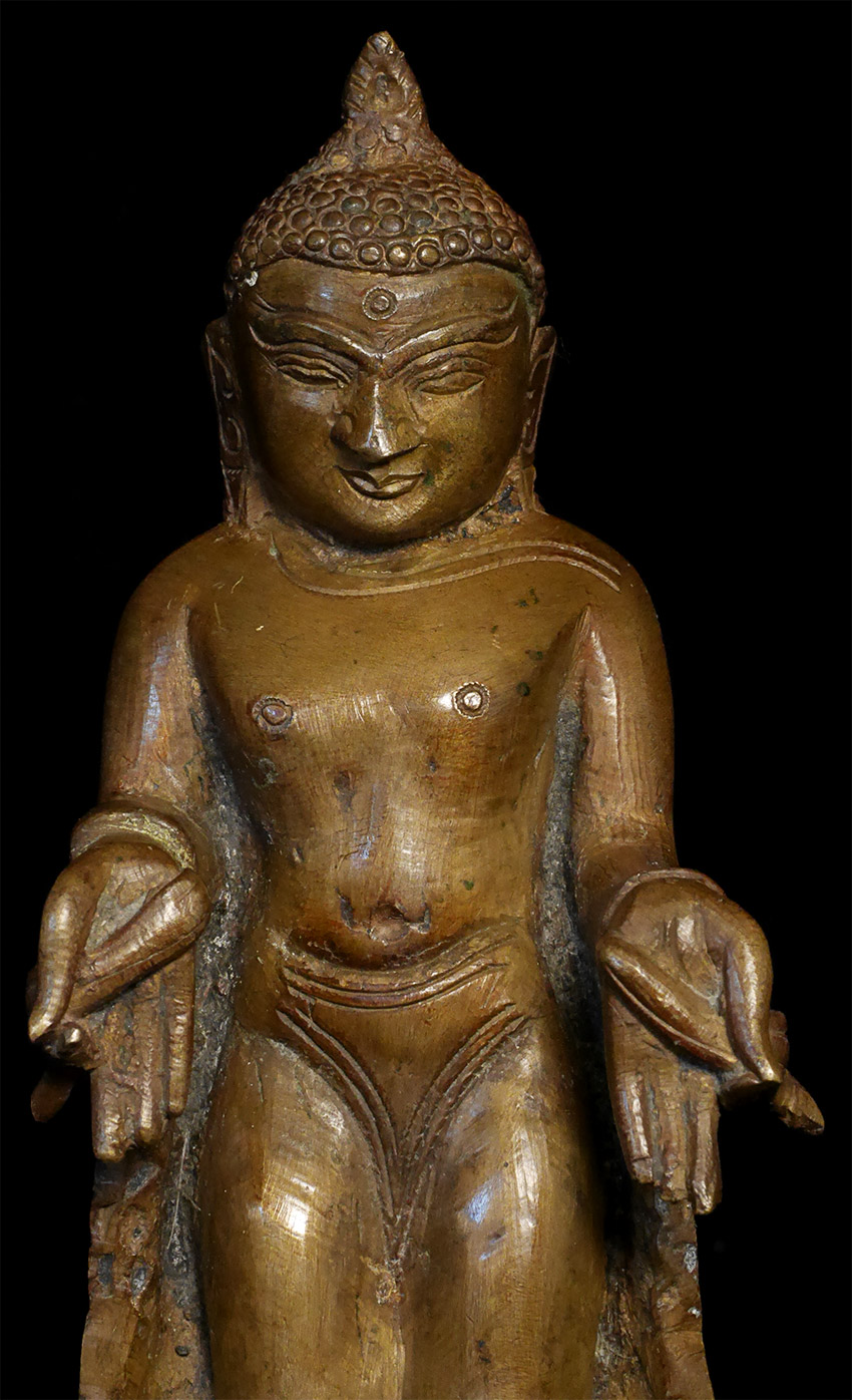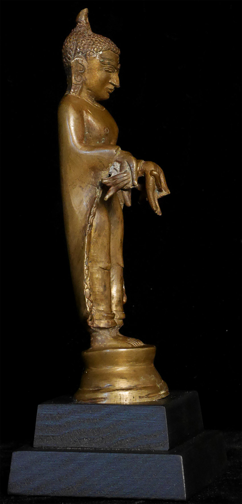 18th Century Burmese solid cast bronze buddha emulating an earlier Pagan style buddha. Measures 6.75 inches tall, 8 3/8 inches on custom stand.
