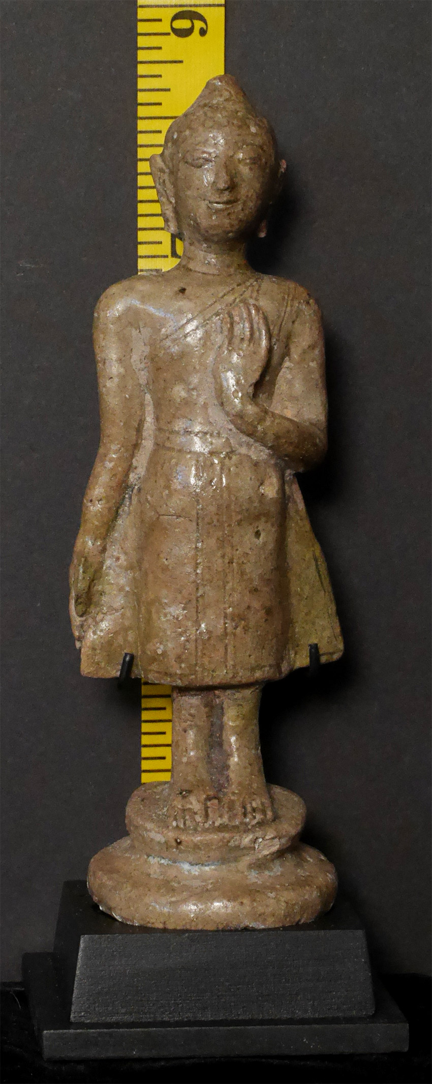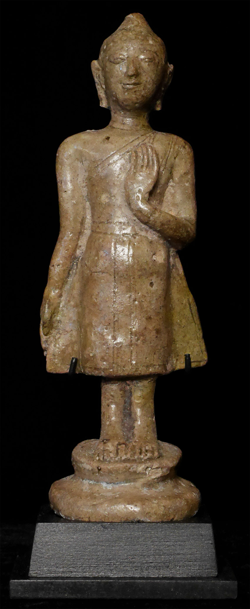 Extremely rare 14/16thC Thai Sawankalok or related type of ceramic Buddha made during the late Sukhothai period in central Thailand. There were large numbers of plates, bowls, vases, cups, and other traditional forms made during that period but very few Buddha images. This is one of only a small handful of authentic period pieces (and the nicest) I have come across in thirty years of searching. Stands 7 1/4 inches tall, 8 3/8 inches on custom base. No apparent damage or repairs.