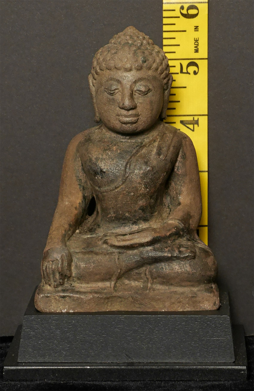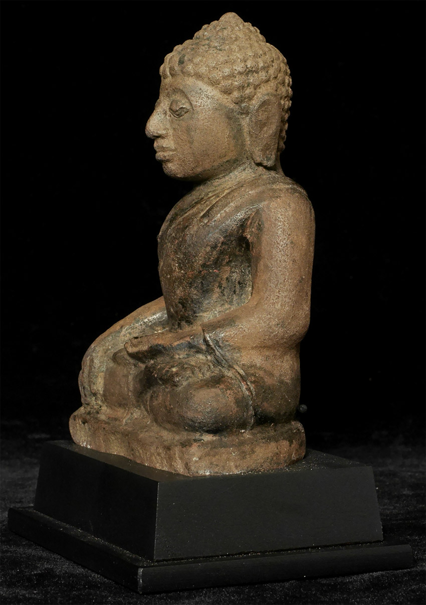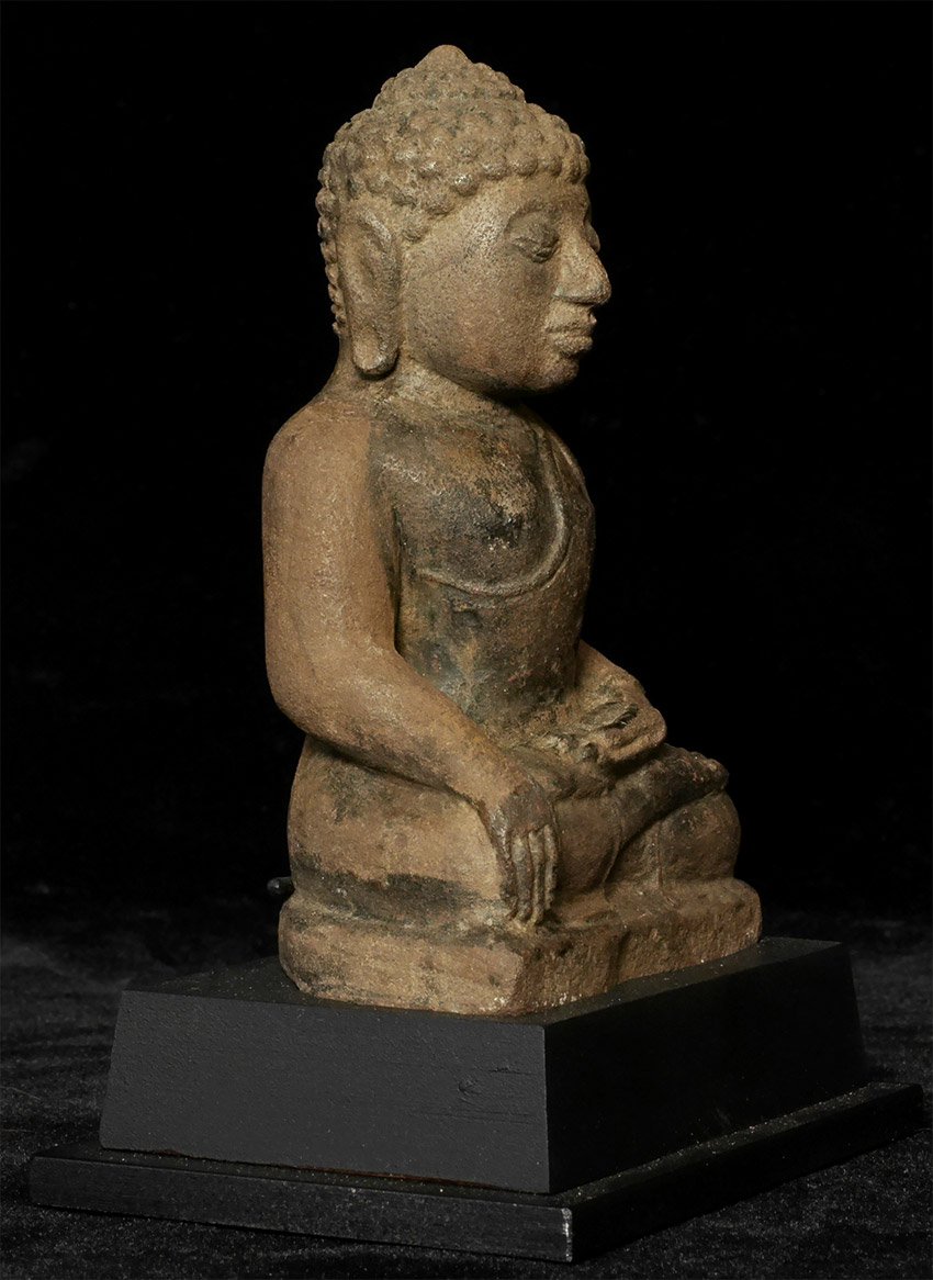 Superbly carved stone Buddha. Classic 13/14thC Burmese Ava period. Best sculpting I've seen on ANY stone sculpture from this period- including in museums. Sits 4-3/4 inches tall, 5-1/2 inches with the custom stand. SPECIAL. For more than 25 years I kept a small group of pieces as my personal collection that I would not sell. When I retired recently I decided I would put up it all. This comes as close to my heart as any Buddha in my collection. If you blow it up it is hard to tell that it is not a large piece. That it can be scaled up this way is one sign of a finely carved sculpture. (Take one of the photos and blow it up large and you will see what I mean)