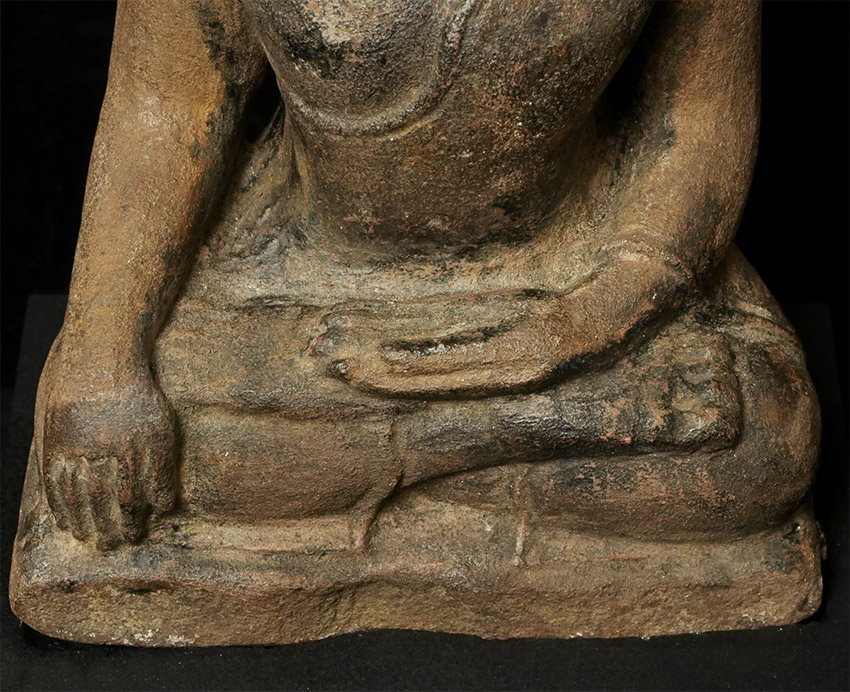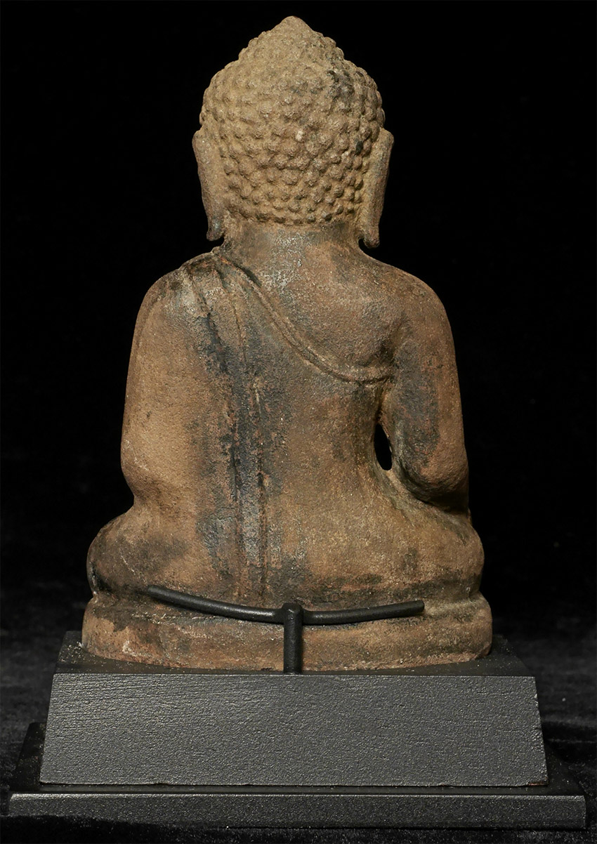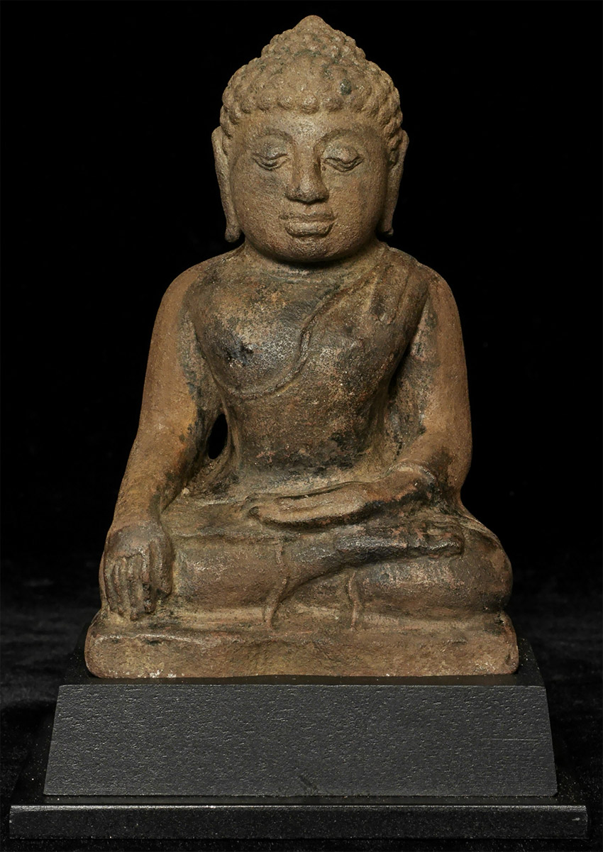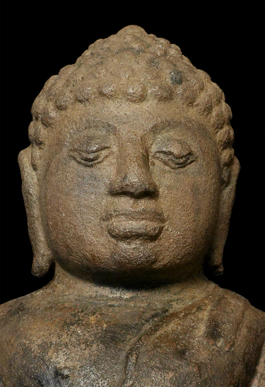 Superbly carved stone Buddha. Classic 13/14thC Burmese Ava period. Best sculpting I've seen on ANY stone sculpture from this period- including in museums. Sits 4-3/4 inches tall, 5-1/2 inches with the custom stand. SPECIAL. For more than 25 years I kept a small group of pieces as my personal collection that I would not sell. When I retired recently I decided I would put up it all. This comes as close to my heart as any Buddha in my collection. If you blow it up it is hard to tell that it is not a large piece. That it can be scaled up this way is one sign of a finely carved sculpture. (Take one of the photos and blow it up large and you will see what I mean)