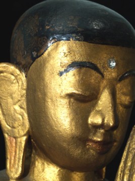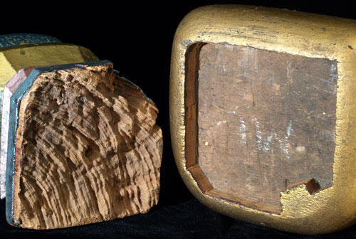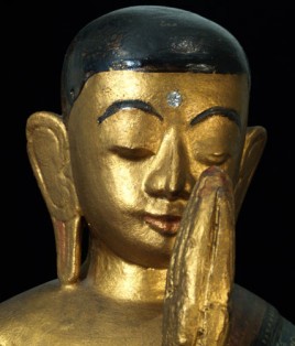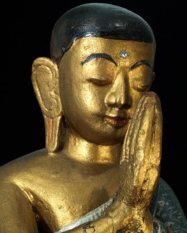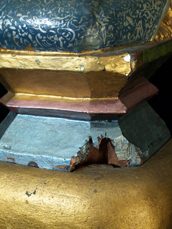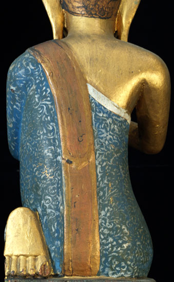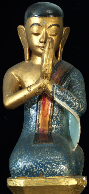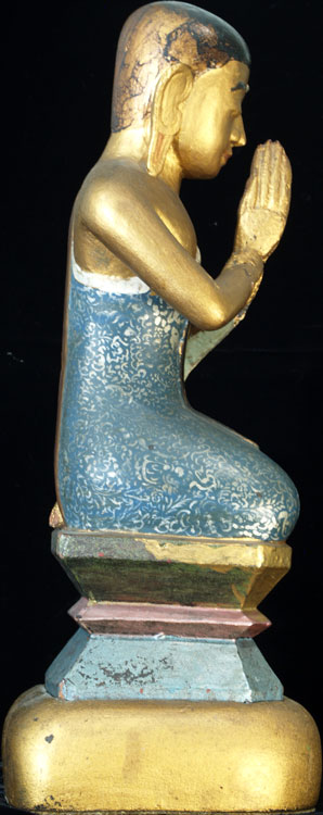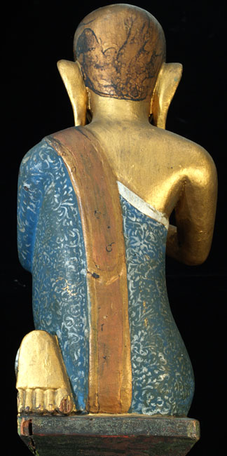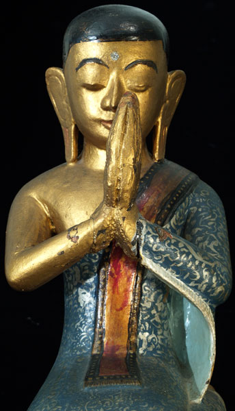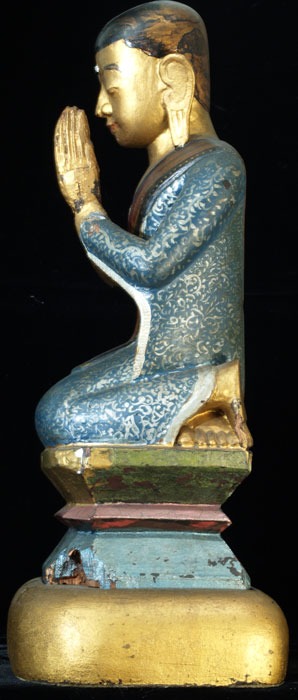 Superb large antique wooden Burmese Shan Buddhist Monk. This is probably the most beautiful piece of its type I have ever seen. It was restored sometime 40 or so years ago and put in to its current base. The way it was done is completely successful- the design work, re-gilding etc are all completely in harmony with the piece. Due to the climate in Burma, this type of wooden piece is typically beat up and worn, or is stripped, or is garishly repainted. This one is just right! It sits an impressive 17.5 inches tall including the base. Look closely at the photos, as there are losses and repairs before and after the restoration, as this is an old piece restored quite a while ago. A beautiful object.