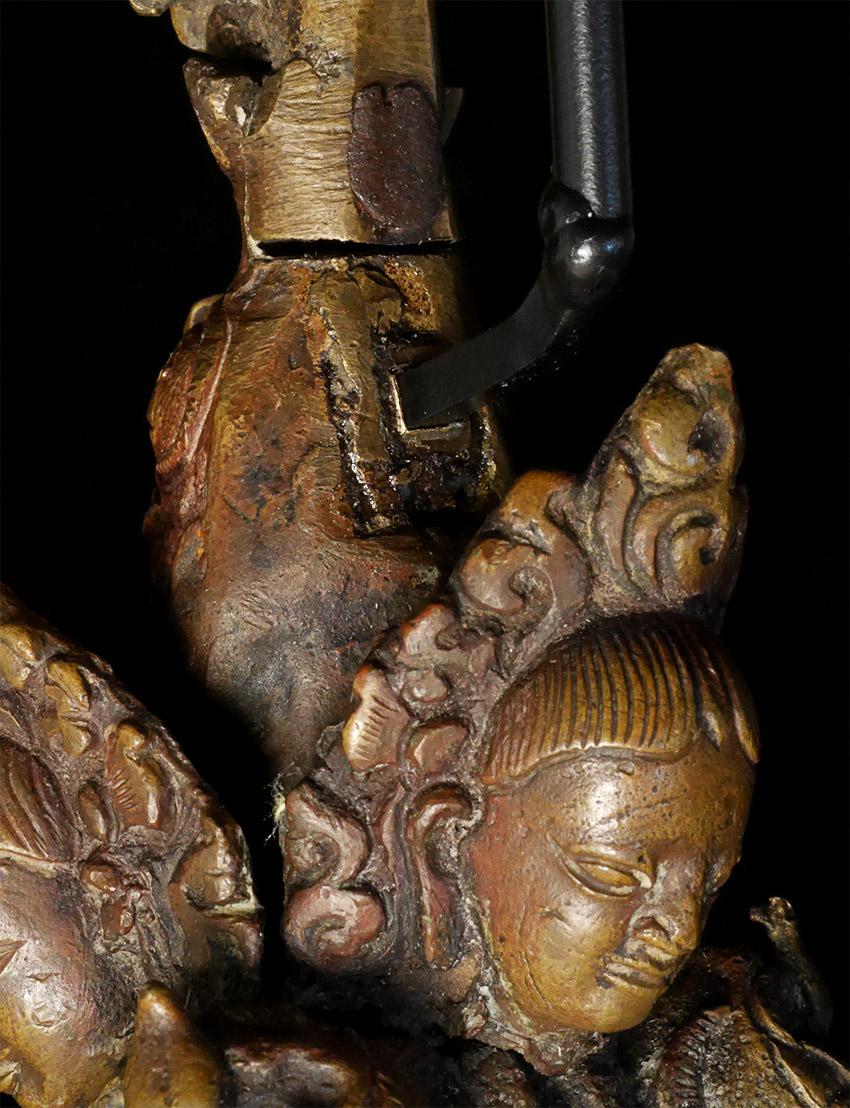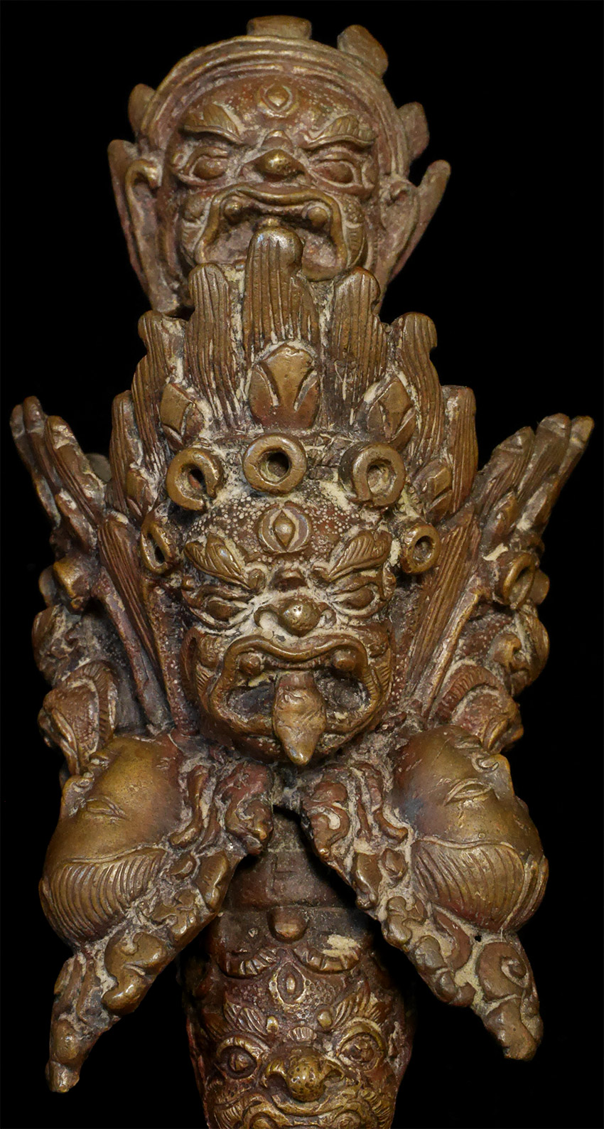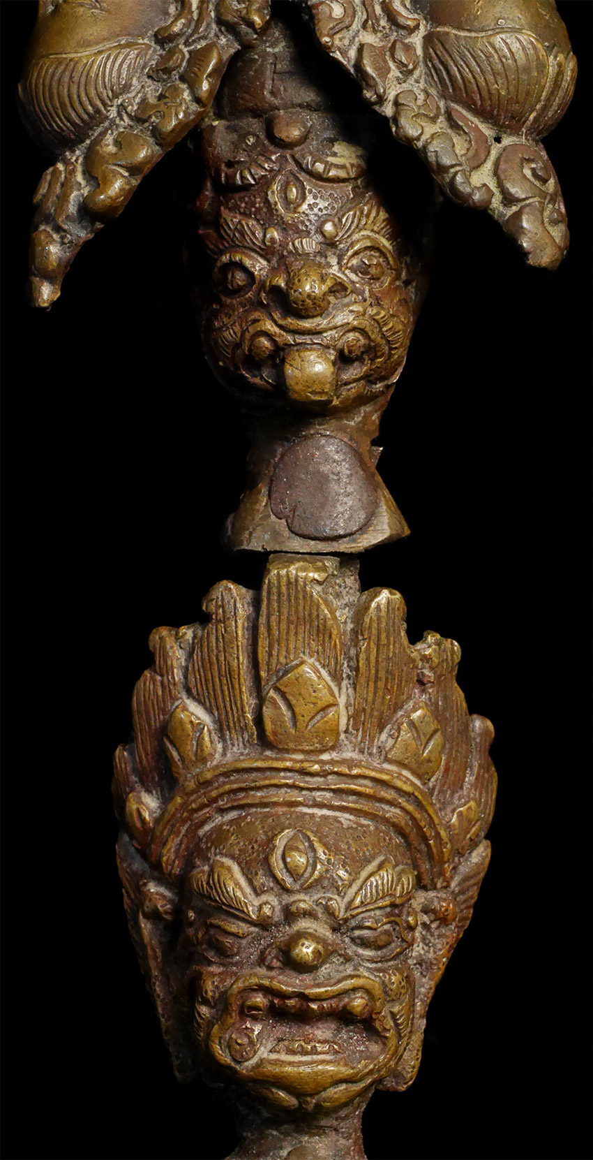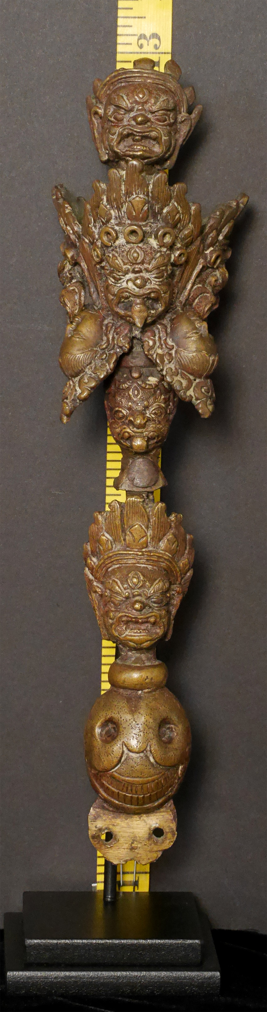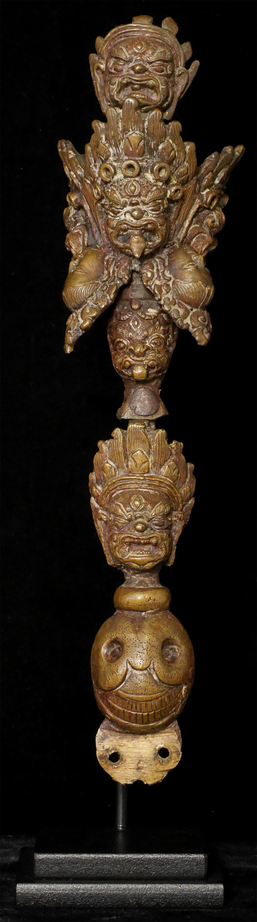 Fantastic 18/19th Century Nepalese Buddhist bronze staff handle. Outstanding quality. Rare piece. Stands 11 inches tall, 12 7/8 inches on custom stand