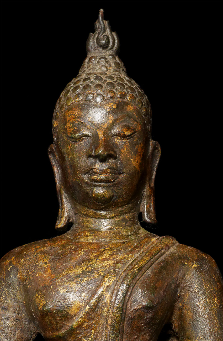 15thC Late Sukhothai/ Bronze Thai Buddha. Fine example with exquisite face. Some of gilding may be gold sheets added as part of devotion in later years.. 7 3/8 inches tall. Very strong spiritual presence.