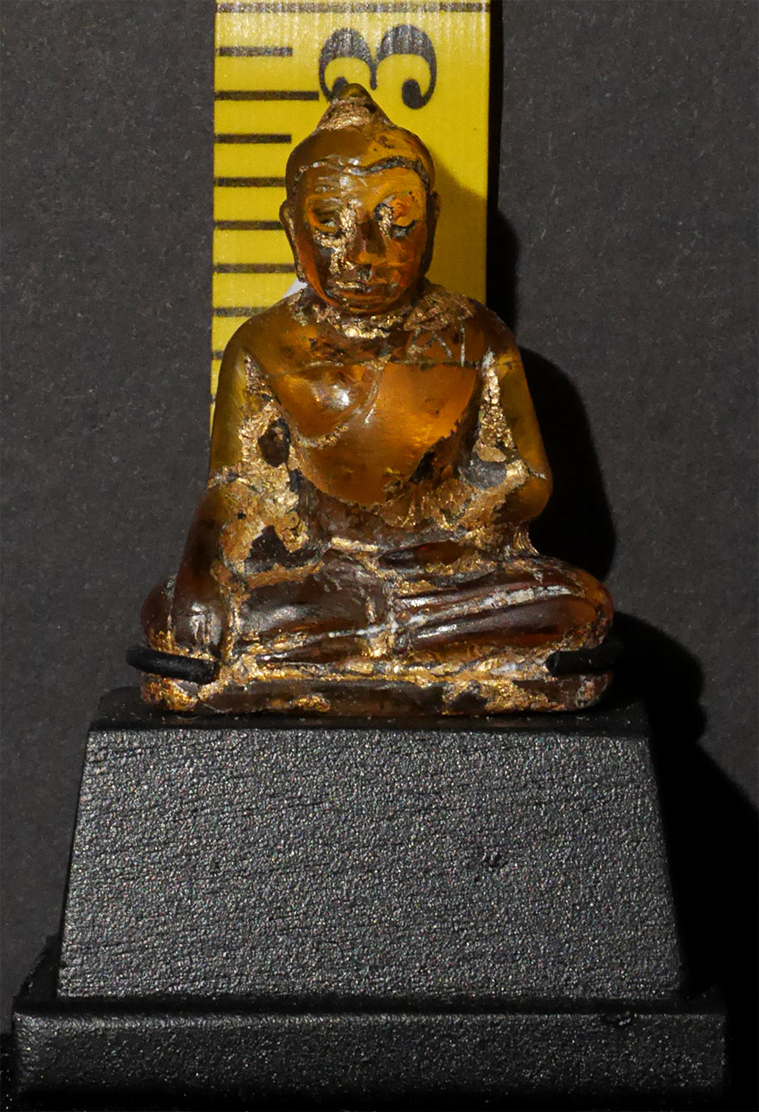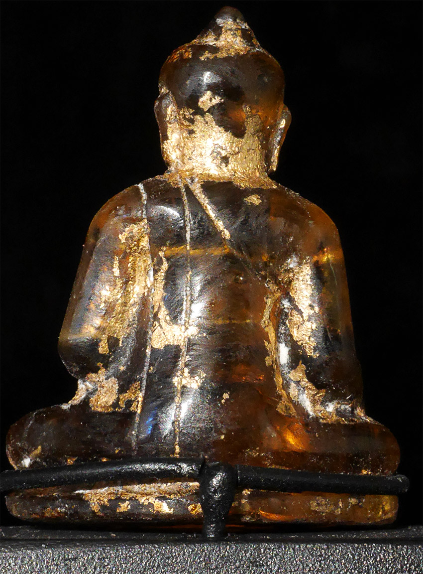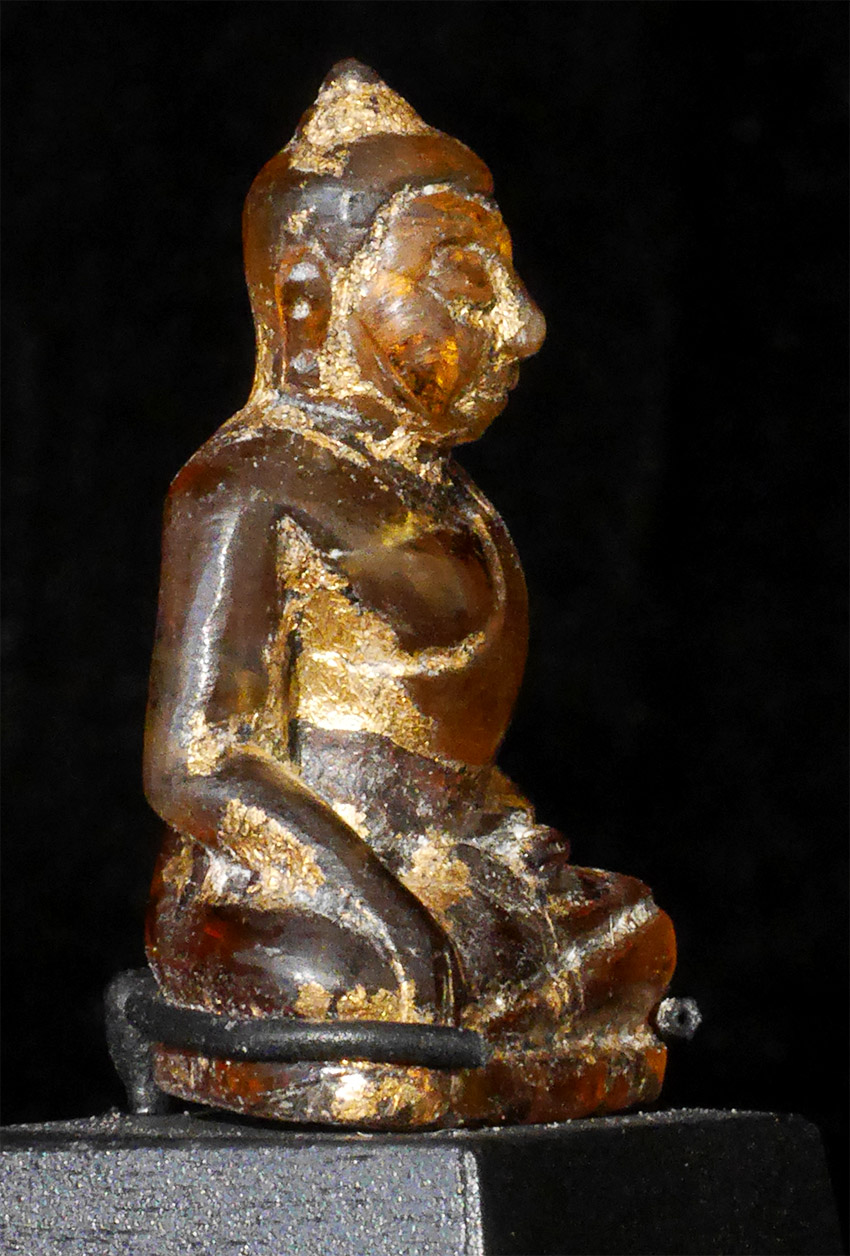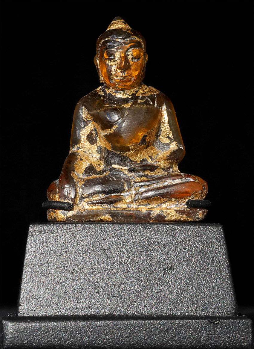 16th -17thC Burmese glass Buddha. Found with a group of 7 others (in different colors) in the forest in a broken pottery stupa. I had several of them, of which is was the nicest. This piece measures 1.75" tall and 2.75" tall on its custom base.