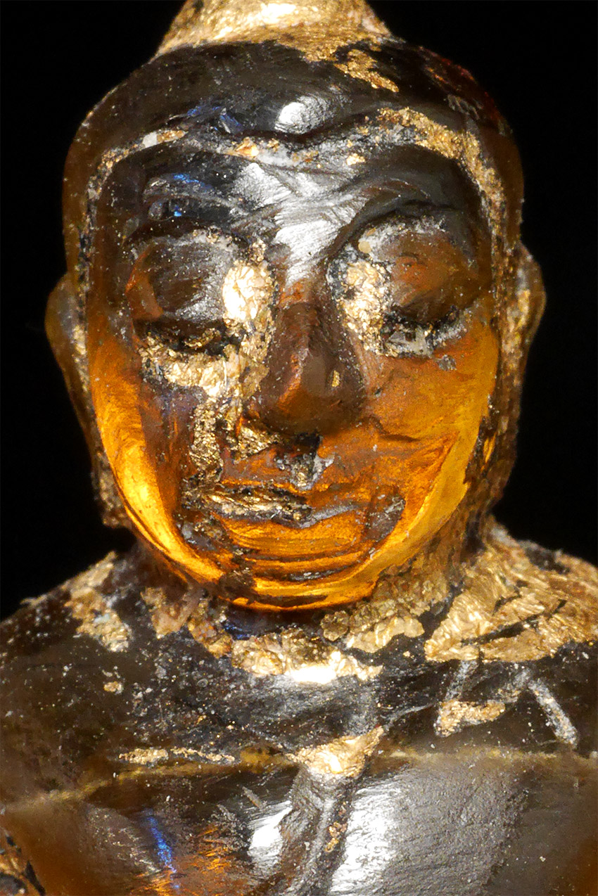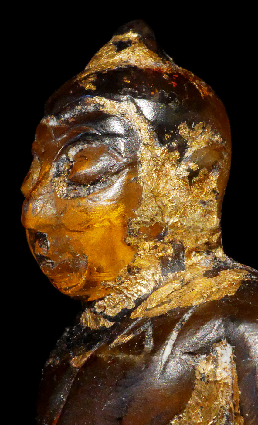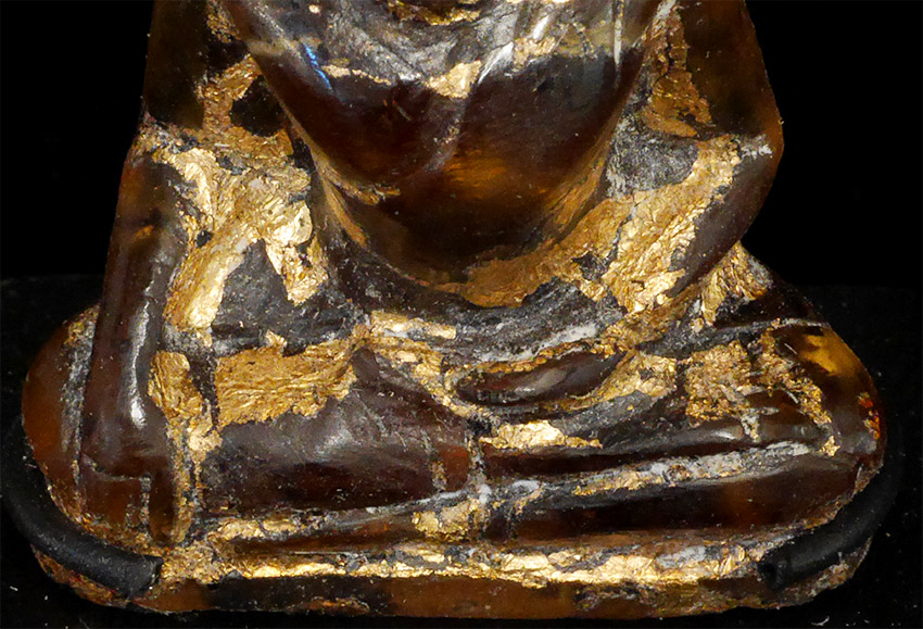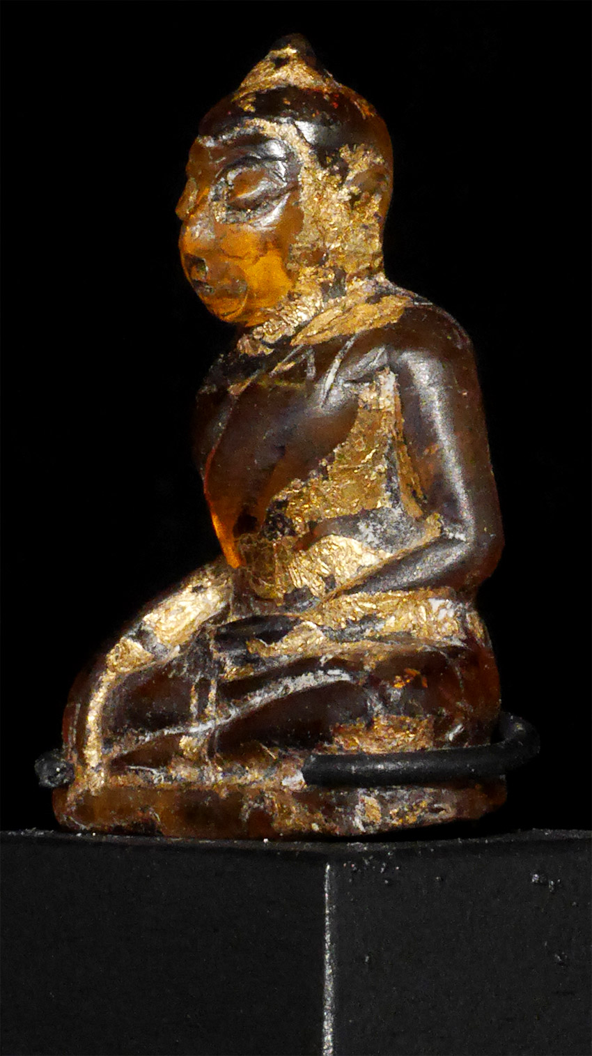 16th -17thC Burmese glass Buddha. Found with a group of 7 others (in different colors) in the forest in a broken pottery stupa. I had several of them, of which is was the nicest. This piece measures 1.75" tall and 2.75" tall on its custom base.