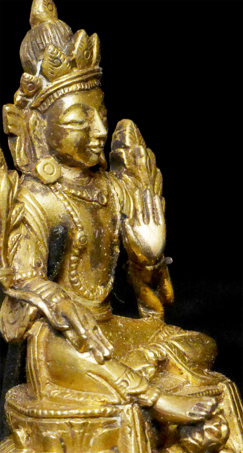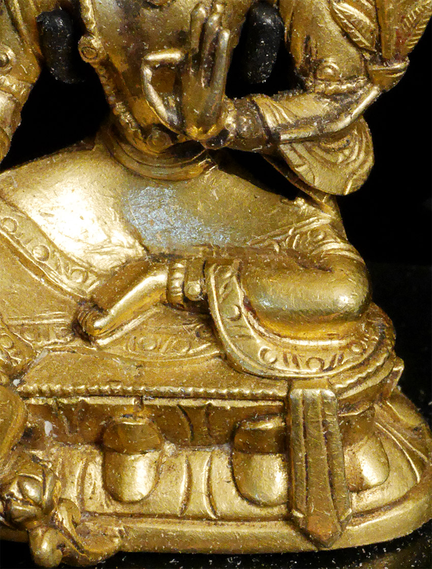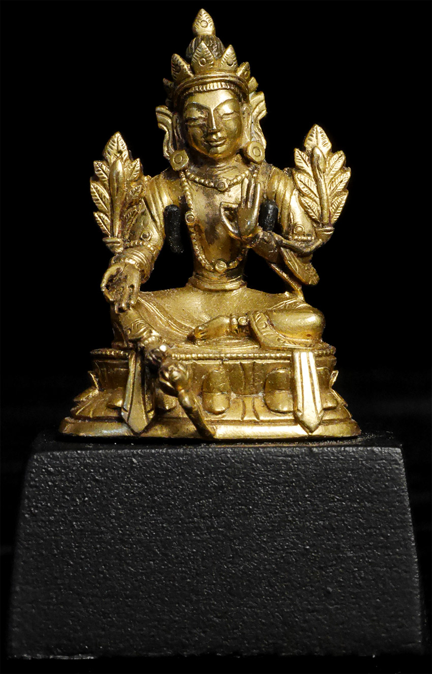 Fine 18/19thC Tibetan bronze Bodhisattva. There are many levels of these miniatures- this is a really good one-not like the ones coming out of China today. 1.5 inches tall, 2.25 inches tall on custom base. Acquired from a San Francisco based collection put together in the 1970's by a wealthy Japanese collector. Was expensive even when I bought it in the late 1990's.