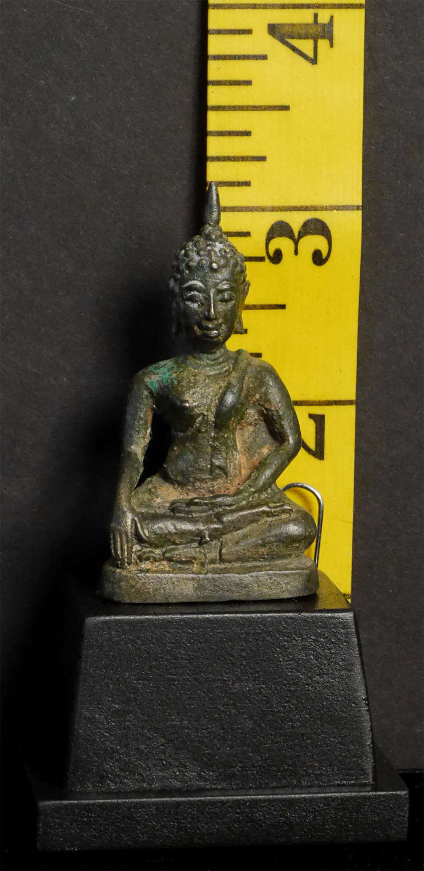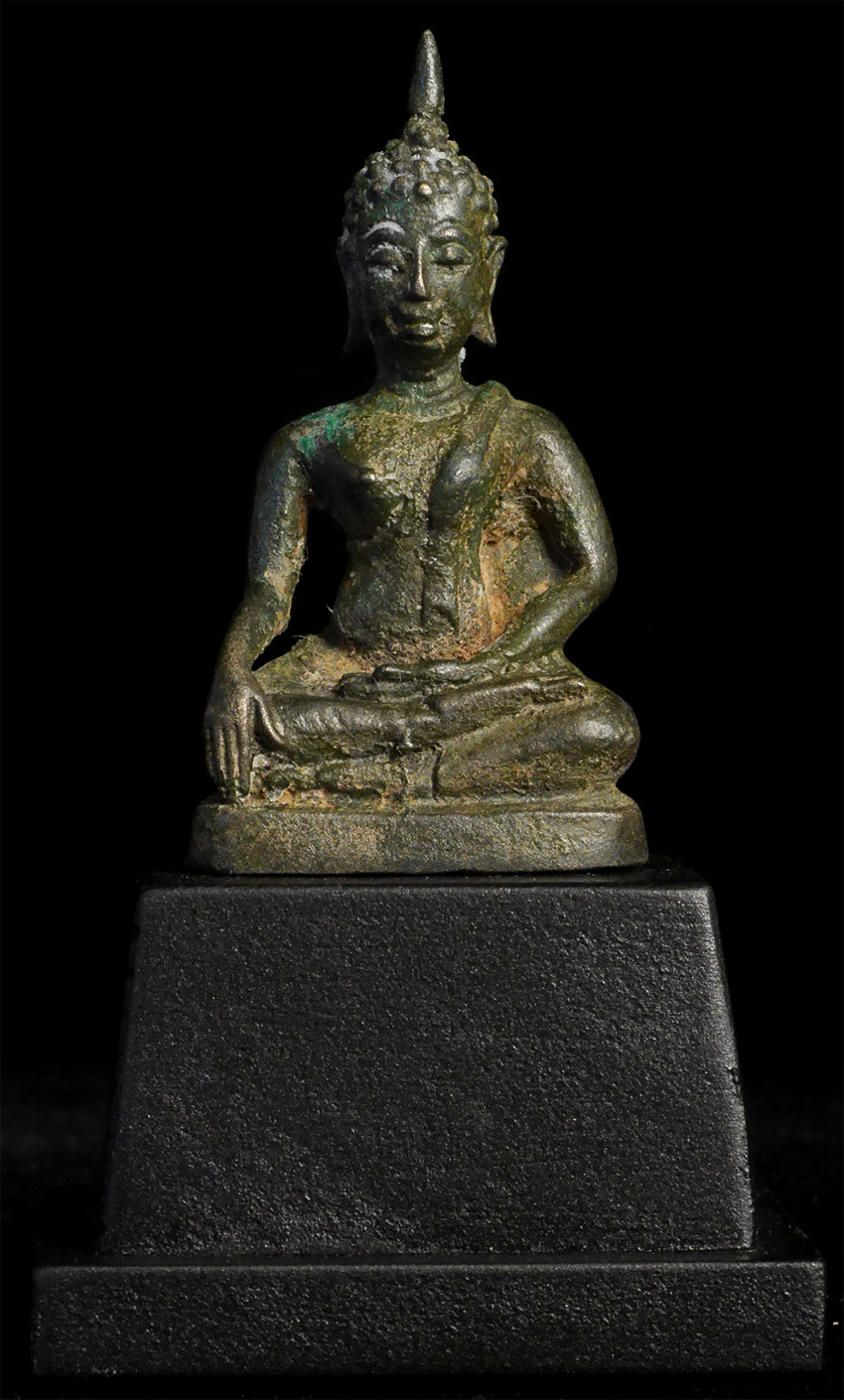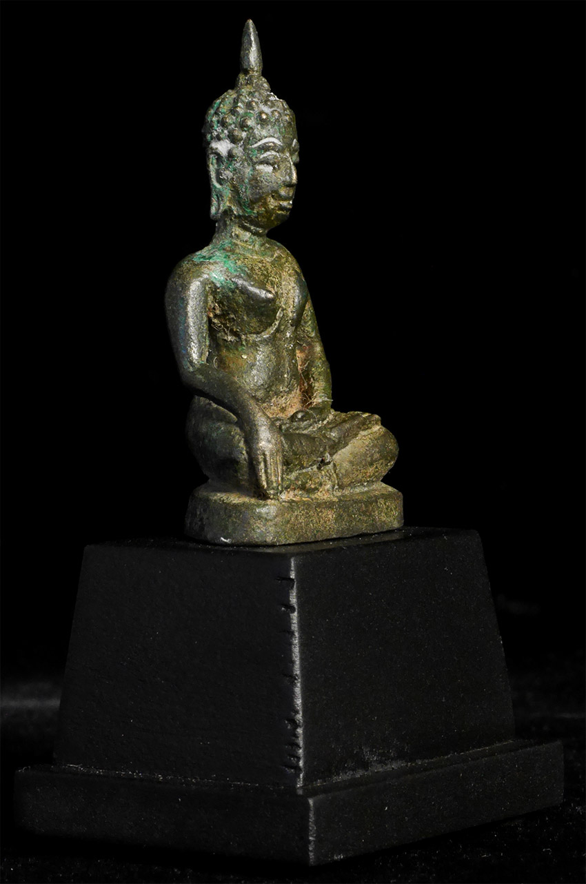 Rare early miniature Thai bronze Buddha. Remains of deeply encrusted soil which indicates long burial. Probably 15/16thC. This piece measures 2" tall and 3 1/8" on its custom base. There are many fakes, and very few authentic pieces of this type in this size.