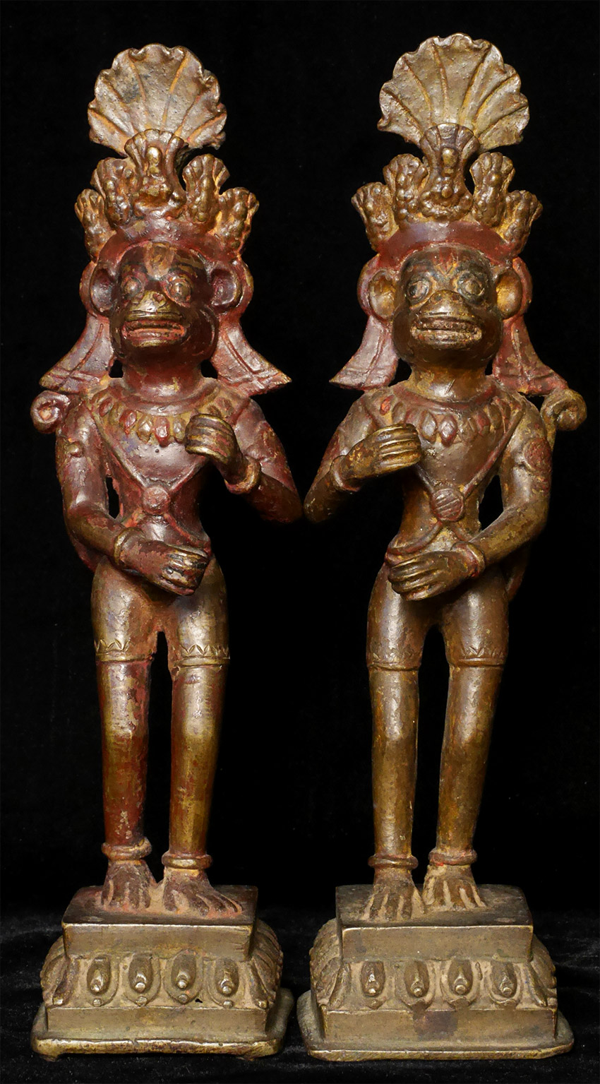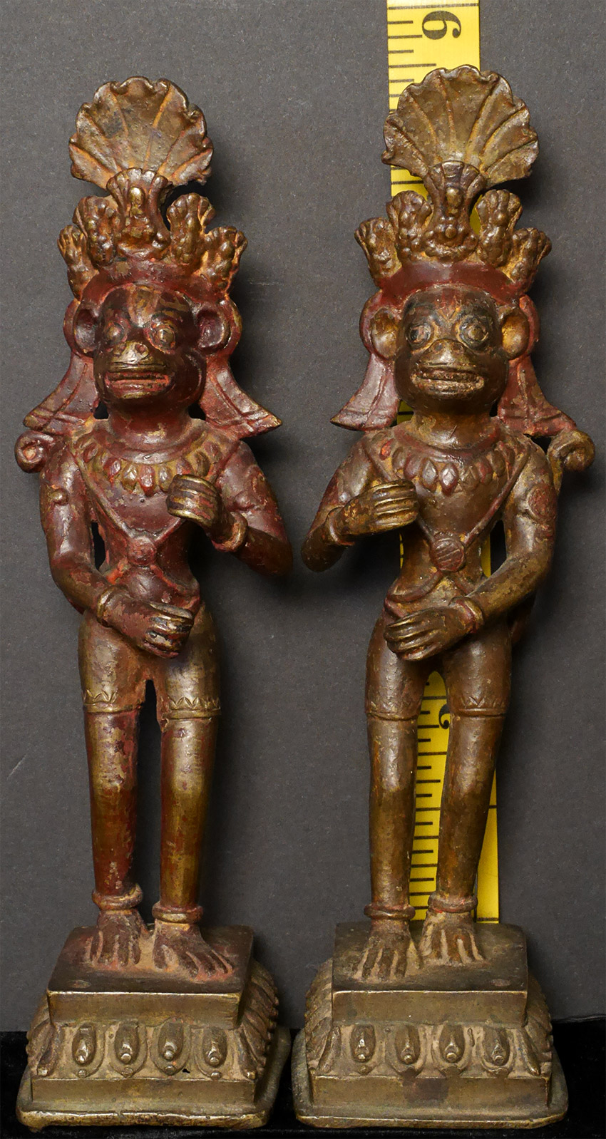 Pair of 17/18thC Hanuman figures from Nepal, probably used to hold incense. The slightly taller one is just over 8.5 inches tall.